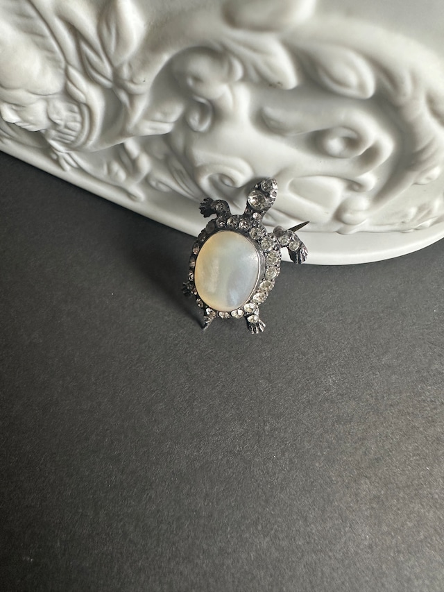 時代 19世紀半ば〜後半頃 素材 シルバー、ペーストガラス、マザーオプパール マザーオプパールサイズ 約14×10.8mm タートルサイズ 約29m m×14.5mm 重さ 4.9g 掌にちょこんと乗る、小さなタートルのブローチ。 柔らかな光を宿すマザーオブパールの甲羅を中心に、周囲には繊細なペーストガラスが丁寧にセットされています。金属部分はシルバー製で、しっとりとした古銀の輝きが、ヴィクトリアンジュエリーならではの趣を醸しています。 裏側まで丁寧に造形されていて、小さな足の一本一本、甲羅の模様に至るまで精巧に再現され、当時の職人の遊び心と誇りが感じられます。 ヴィクトリアン期(1837–1901)は、自然や動物をモチーフとしたジュエリーが多く作られた時代。中でもタートルはゆっくりと着実に前へ進む姿から「安定」や「家庭の守護」を意味するとも言われ、贈り物としても人気の高いモチーフでした。 甲羅に使われているマザーオブパール(白蝶貝)は、真珠を生み出す貝の内側の層から出来ていて、身に着ける人の心を穏やかにしてくれると信じられてきました。 周囲を囲むペーストガラスは、18世紀にフランスで発明された高鉛ガラスで、ダイヤモンドのような輝きを再現するために用いられた素材です。 小さな身体に込められた細やかな技巧と、当時の象徴的な意味を感じさせるブローチはヴィクトリアンの優しさとユーモアがそっと息づく、愛らしいひと品です。 ※ 写真と実物ではサイズ感が違います。あらかじめ上に記載のサイズを必ずご確認下さい。 ※ 100年以上前の古いお品になりますので、経年によるアンティーク品特有の微小なスレなどルーペで見てわかる程度にございます。 時代を考えても全体的にみて状態はとても良好です。 但しアンティークのお品であることをご理解のうえご注文お願いいたします。 アンティーク品に対して現行品の様な無傷で完璧な物をお求めになりたい方はアンティークジュエリーのご購入をお控え頂きたく存じます。 m(_ _)m ※ 初めての方のお取り置きは致しておりませんのでご了承下さいませ。 ※当店の商品(アンティーク)は、新しく作られる量産品と異なり、経年変化によるキズ、変色、汚れなどは欠陥にあたりません。また、アンティークの年代や素材の純度等は、ディーラーからの情報、デザイン、素材、構造、刻印等から推測されたものであり、あくまでも目安としてお考え下さい。 FW200325-1898