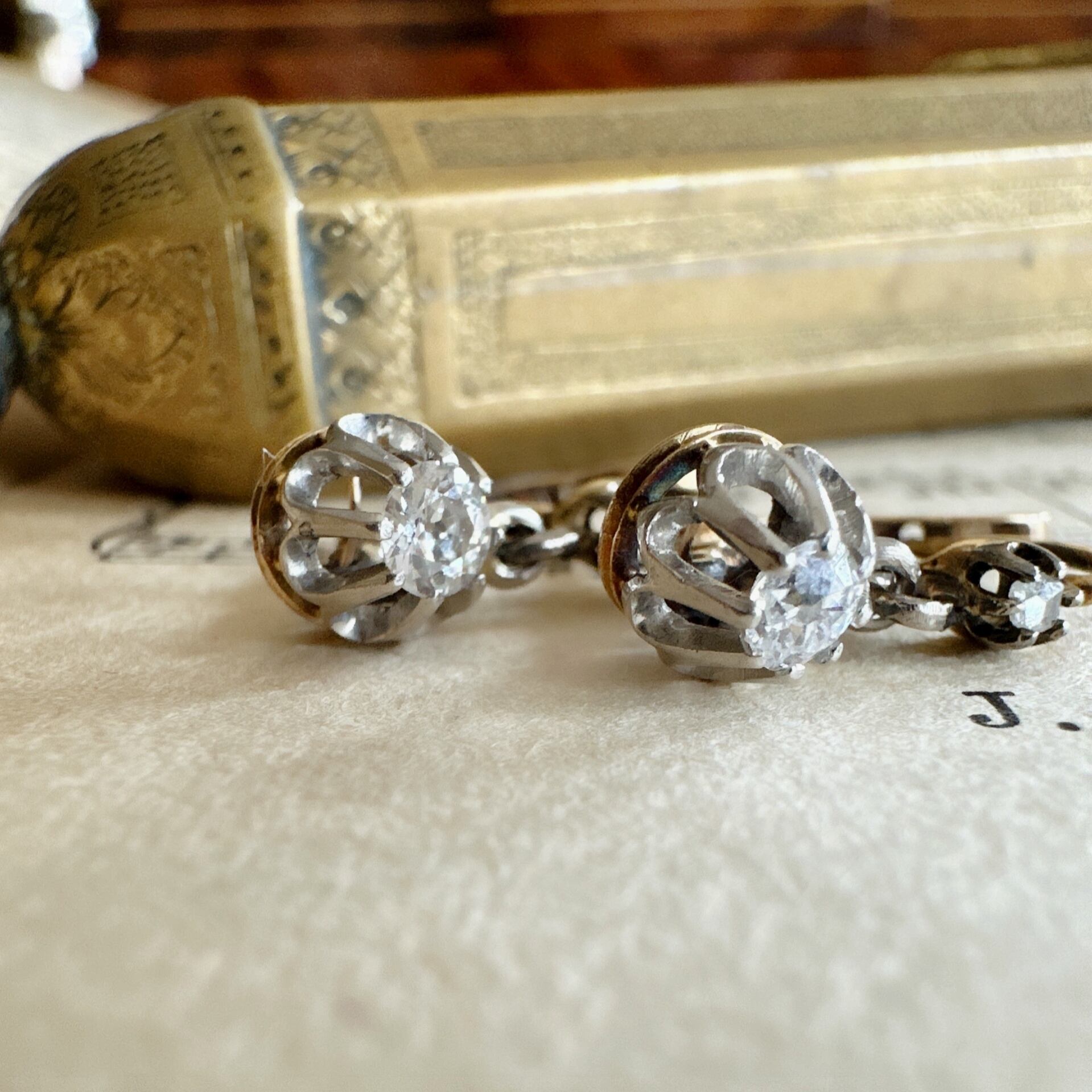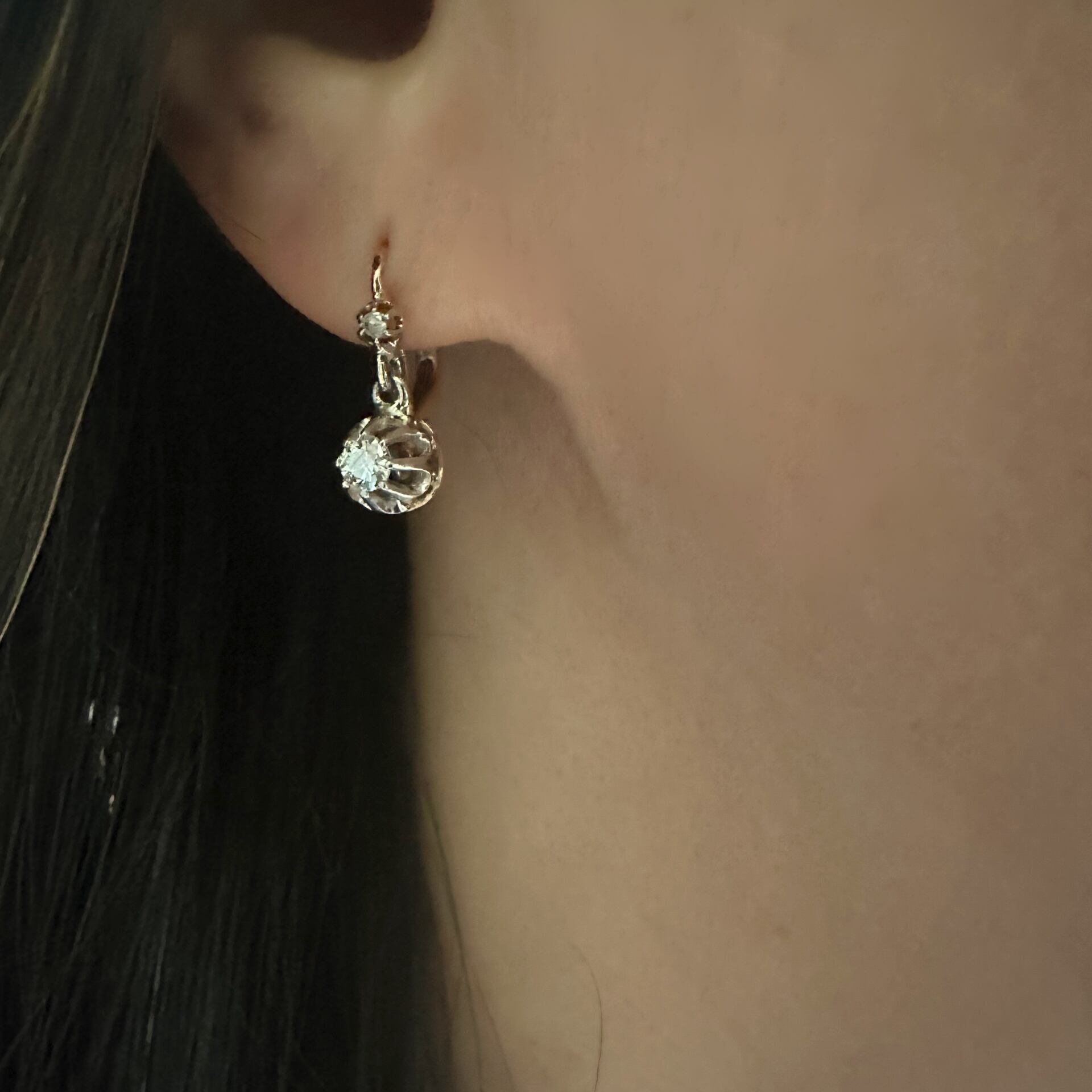 オールドヨーロピアンカットダイヤモンドが生み出す温かな煌めきが魅力のピアスのご紹介です。(お写真ですとダイヤモンドが白く写ってますが、実物は透明感のある美しいダイヤモンドです。)
