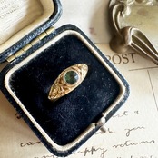そして中央に留められたグリーンサファイア。この石の魅力は、一般的なブルーサファイアが王族のような威厳を宿すのに対し、グリーンサファイアはより静かで、内に秘めた美しさを湛えていて、まるで森の奥深くにたたずむ湖のような、包み込むような優しさが、アールヌーヴォーの自然主義と調和して、このリングにどこか神秘的な気配を添えているのです。