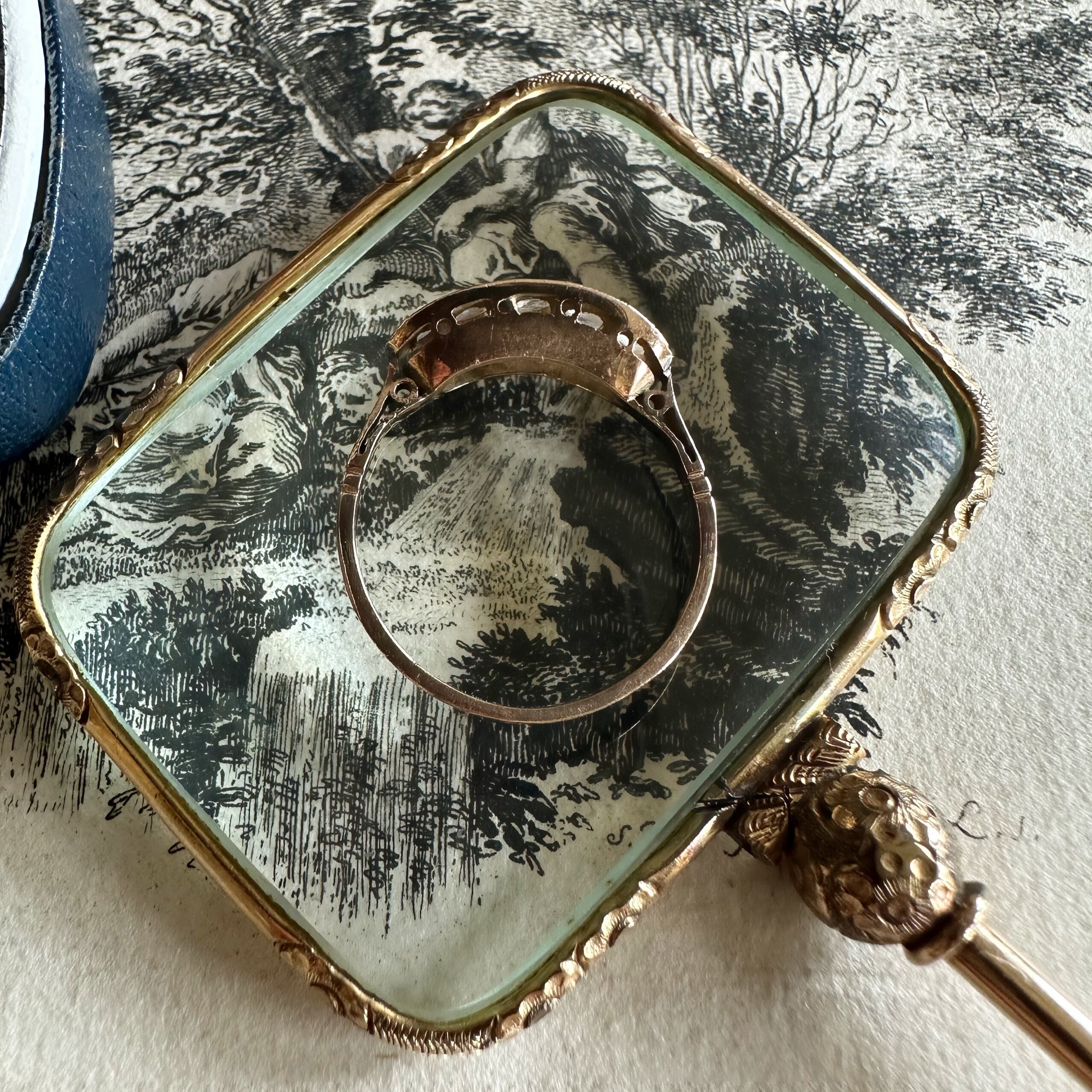 19世紀半ば頃、ヴィクトリア時代の中頃に生まれたと思われるこちらのリングは、刻印は残されていないものの、ローズゴールドの温かみのある色合い、そして20金の地金の質感と細部の仕立て、そして何よりもそこに並ぶ5石のローズカットダイヤモンドが、現代のブリリアントカットとは異なり、光を反射させるためのカットではなく、光をやわらかく取り込むような造形をしているのです。ですからブリリアントカットに見慣れた方には全てが歪に見える事でしょう。