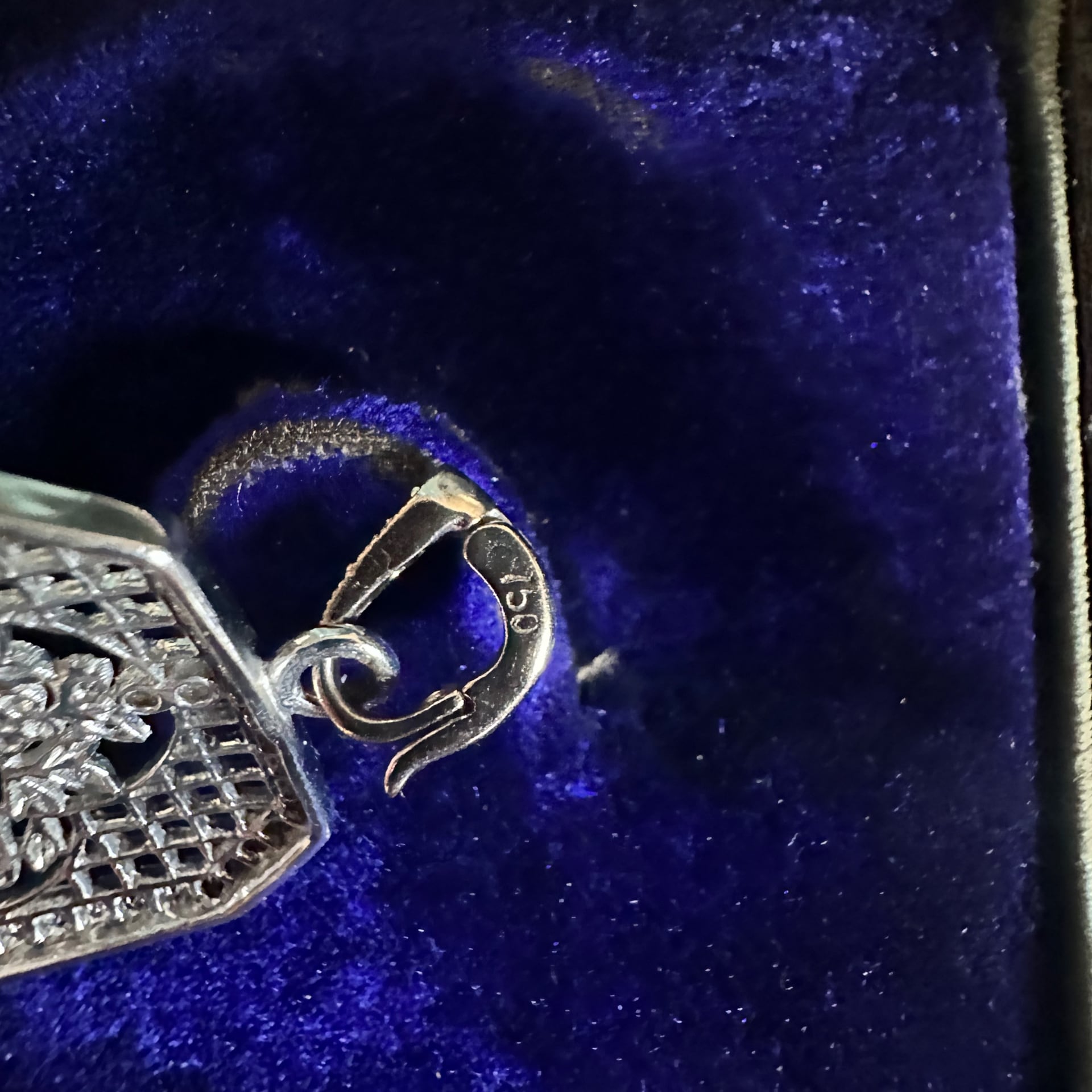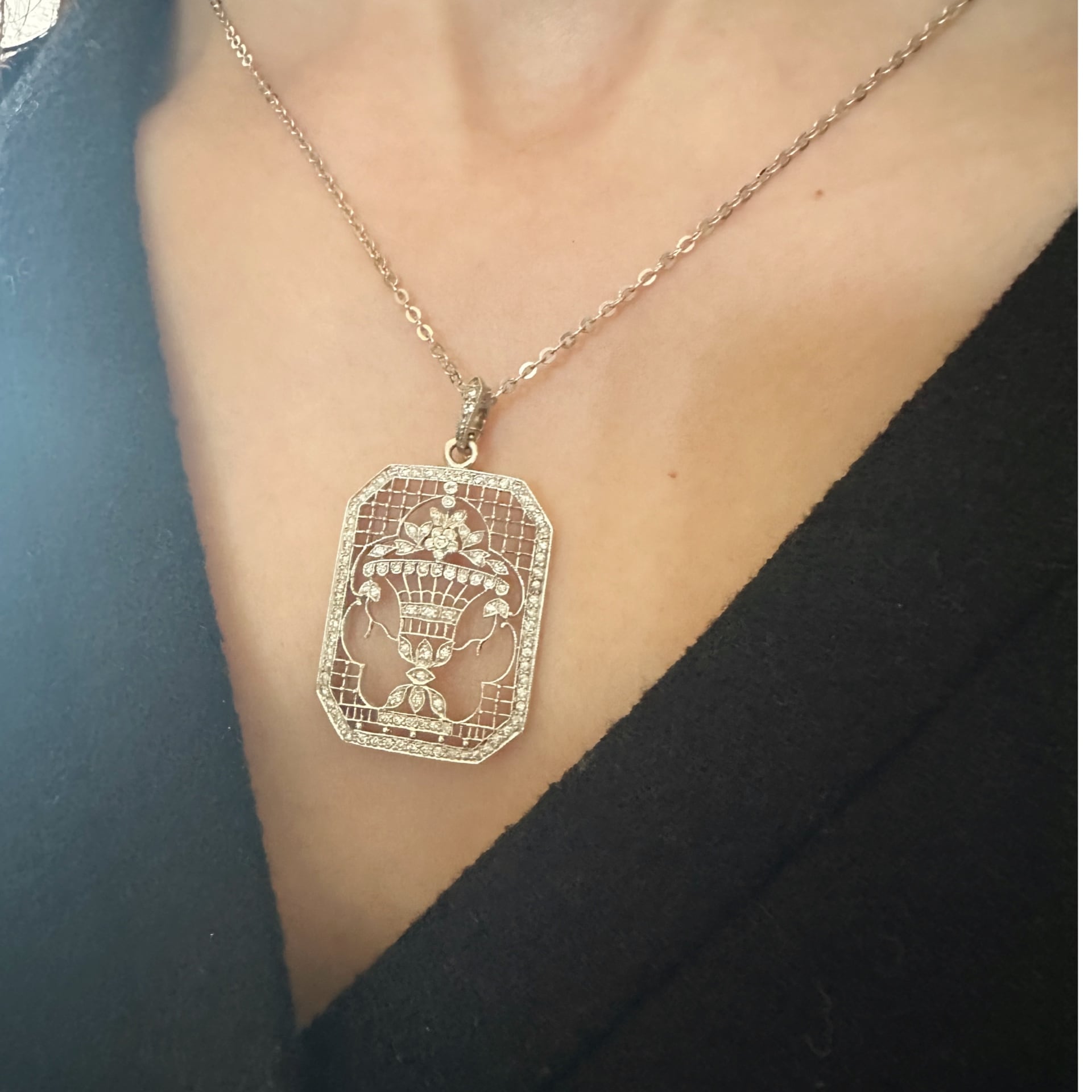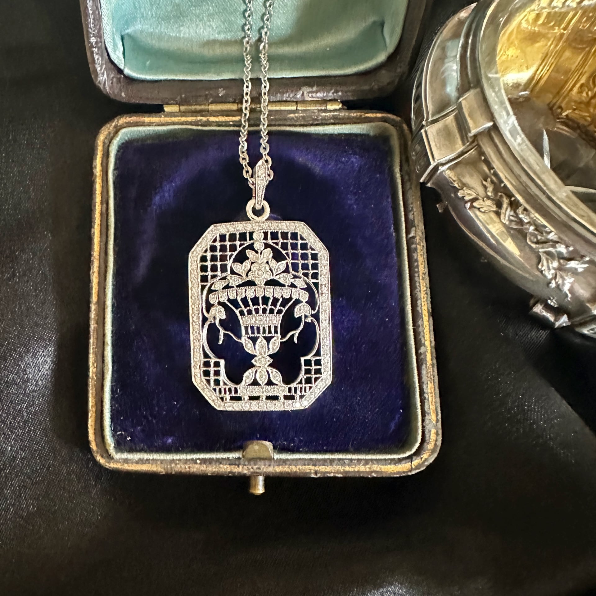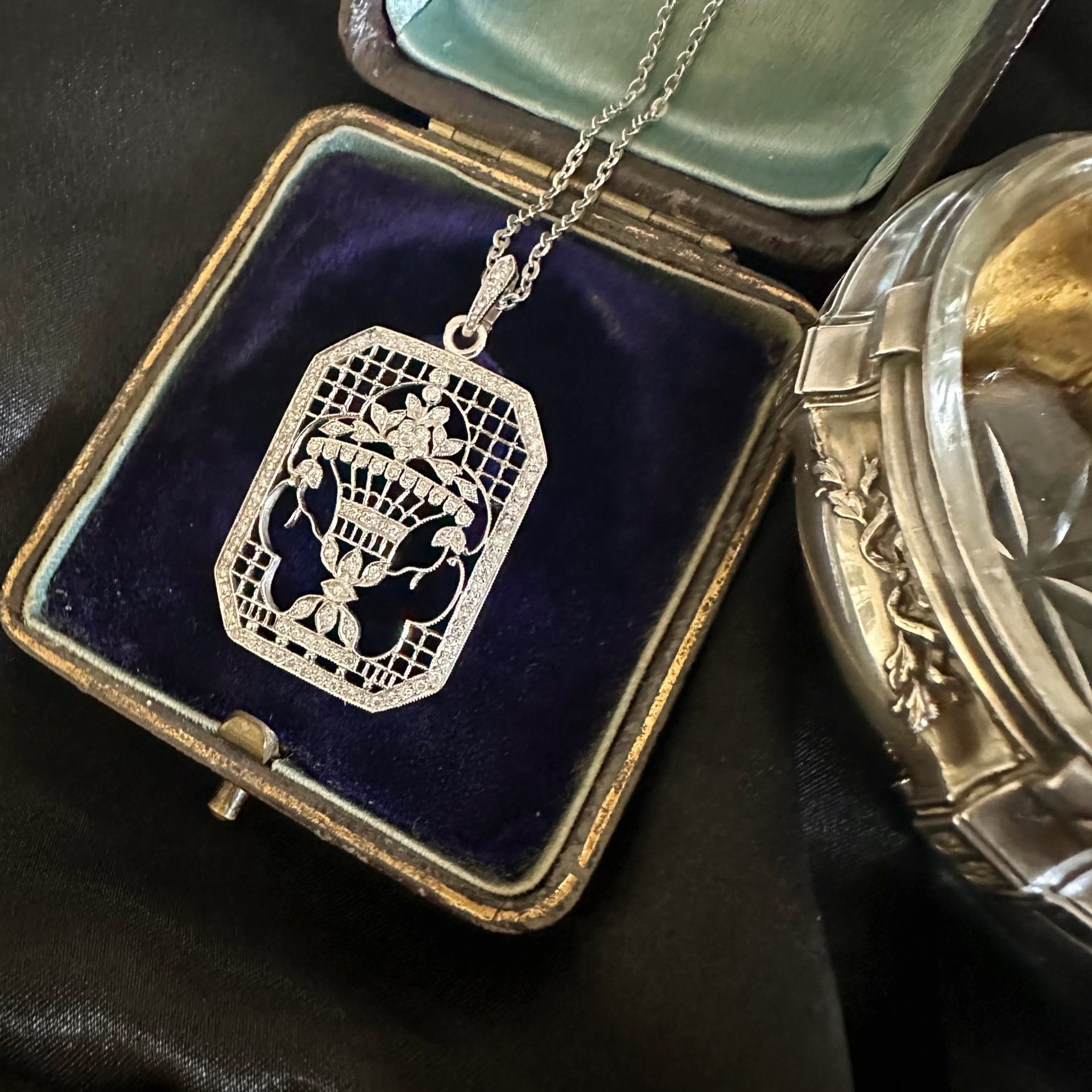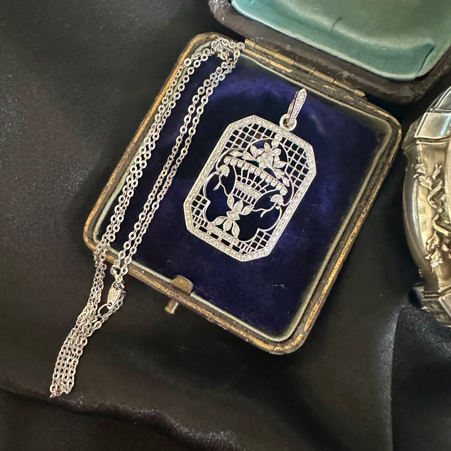 陽だまりの窓辺にそっと飾られた、小さな花籠のように―― こちらは、イタリアで生まれ、イギリスへと渡ったと推測される、18金フィリグリーのペンダントネックレスです。