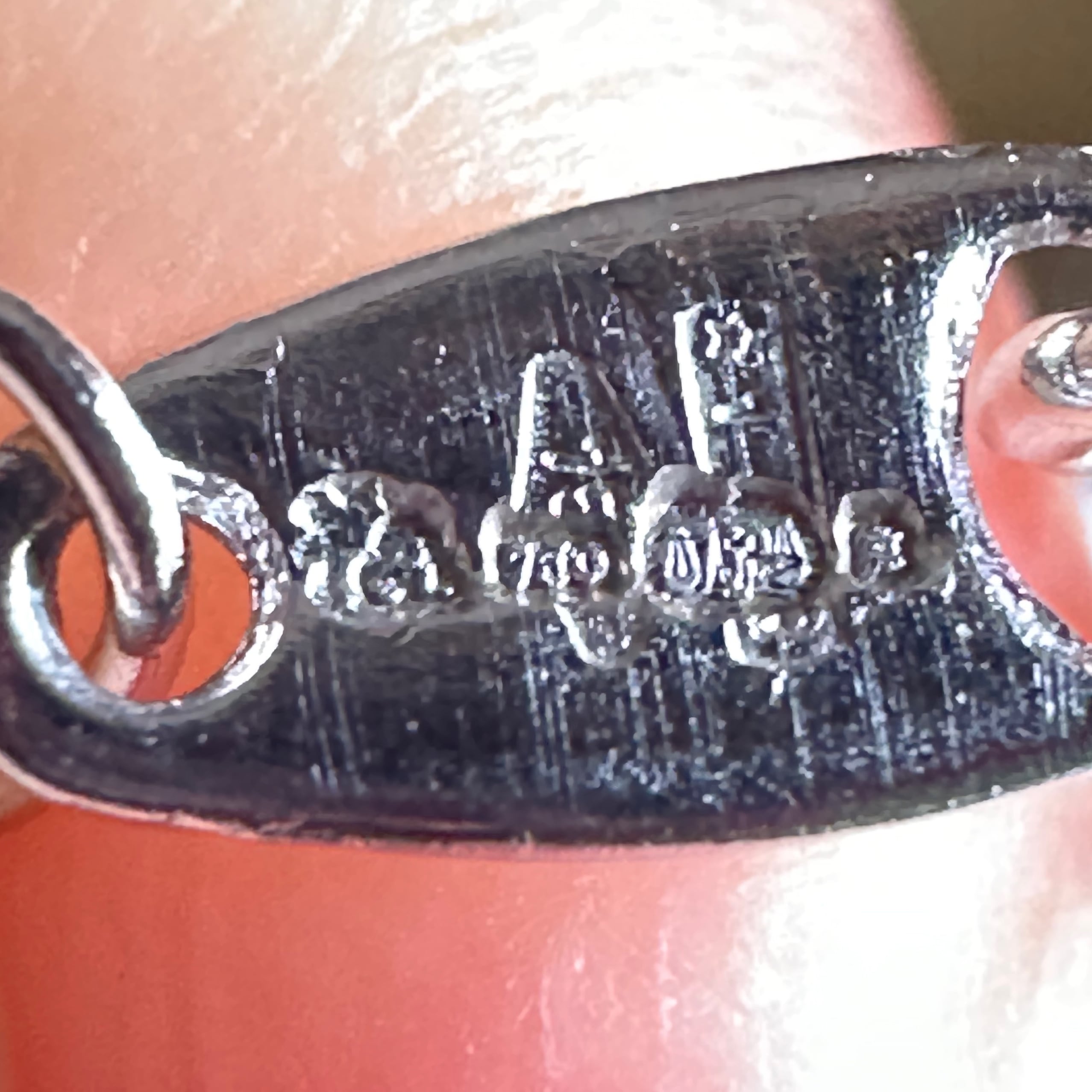 マルカンに打たれたイギリスのオメガマークは、輸入品であることを示す刻印。チェーンにはイタリアの刻印の上に重ねて別の刻印が確認され、このネックレスが時を超えて旅してきた証でもありますね。