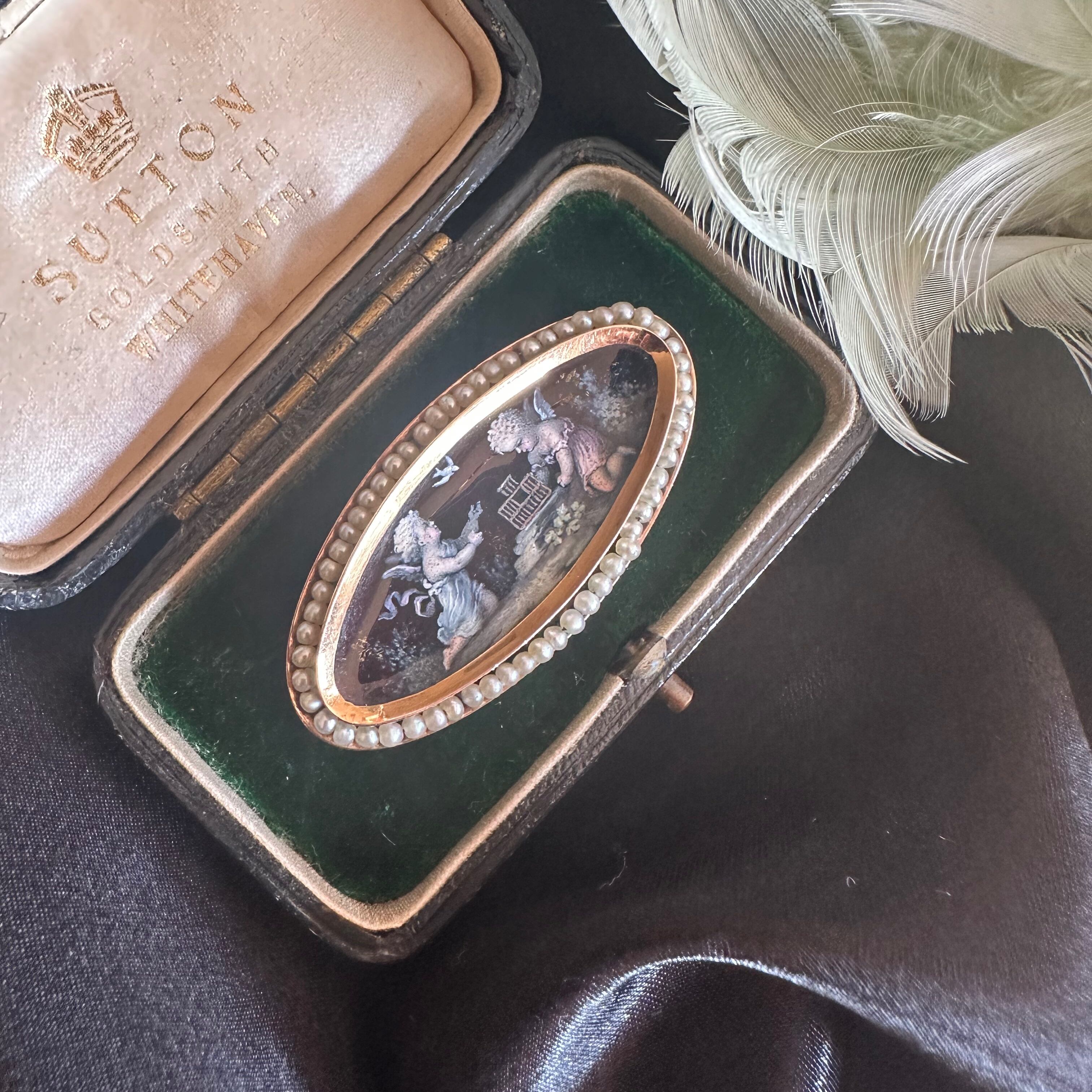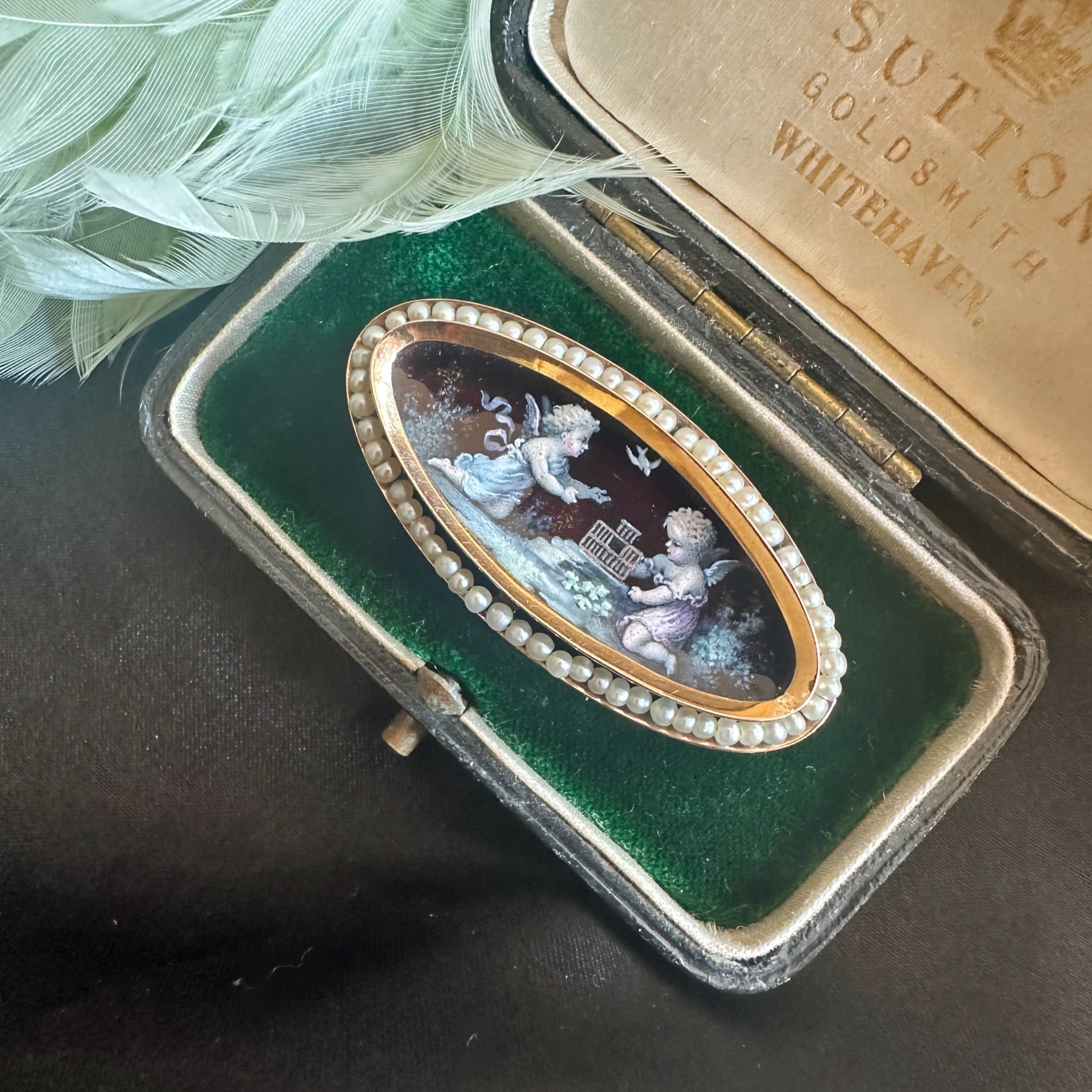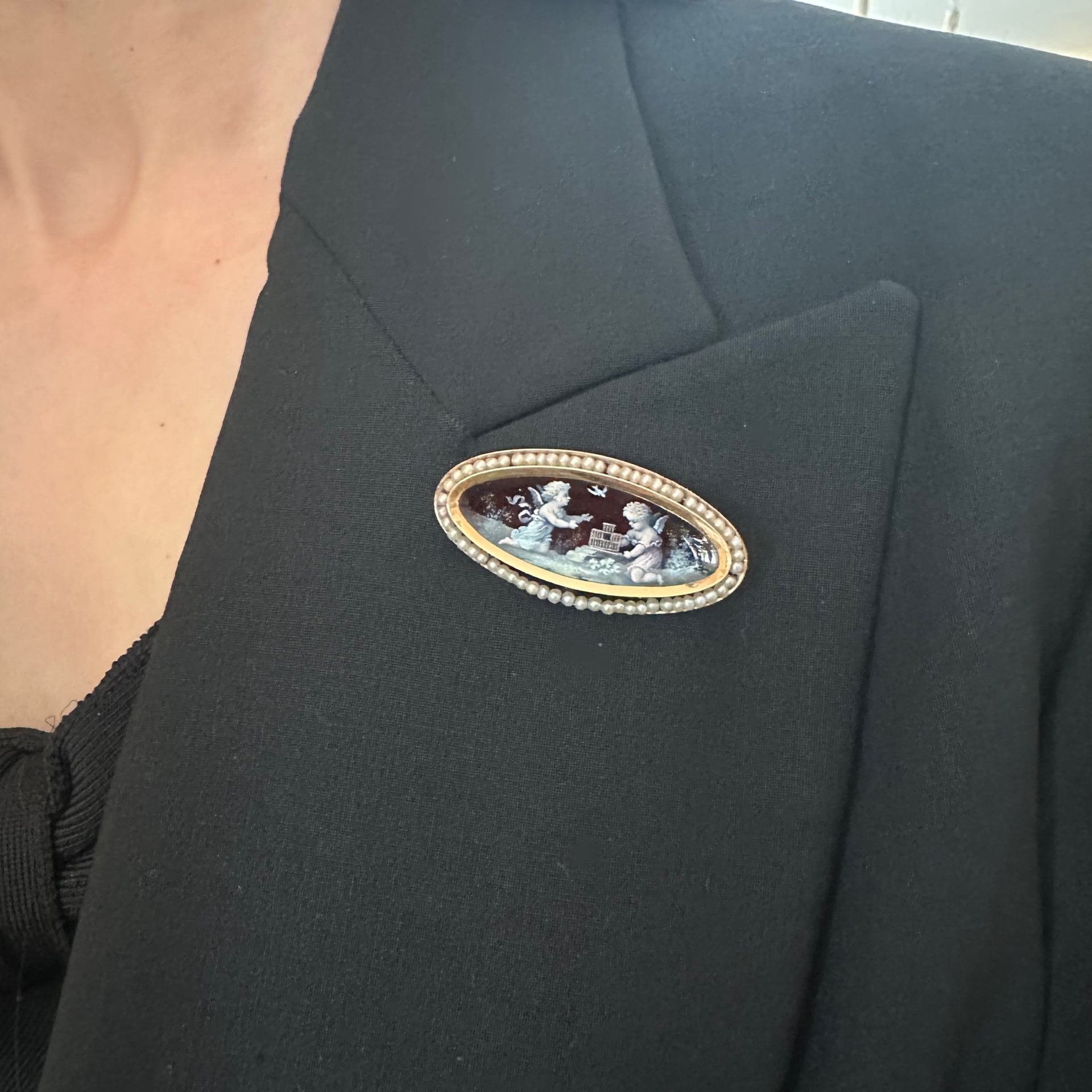 このブローチのように、柔らかく溶け合う色彩と緻密なタッチで物語を描き出したエナメル画は、まさにその流れを汲むものです。