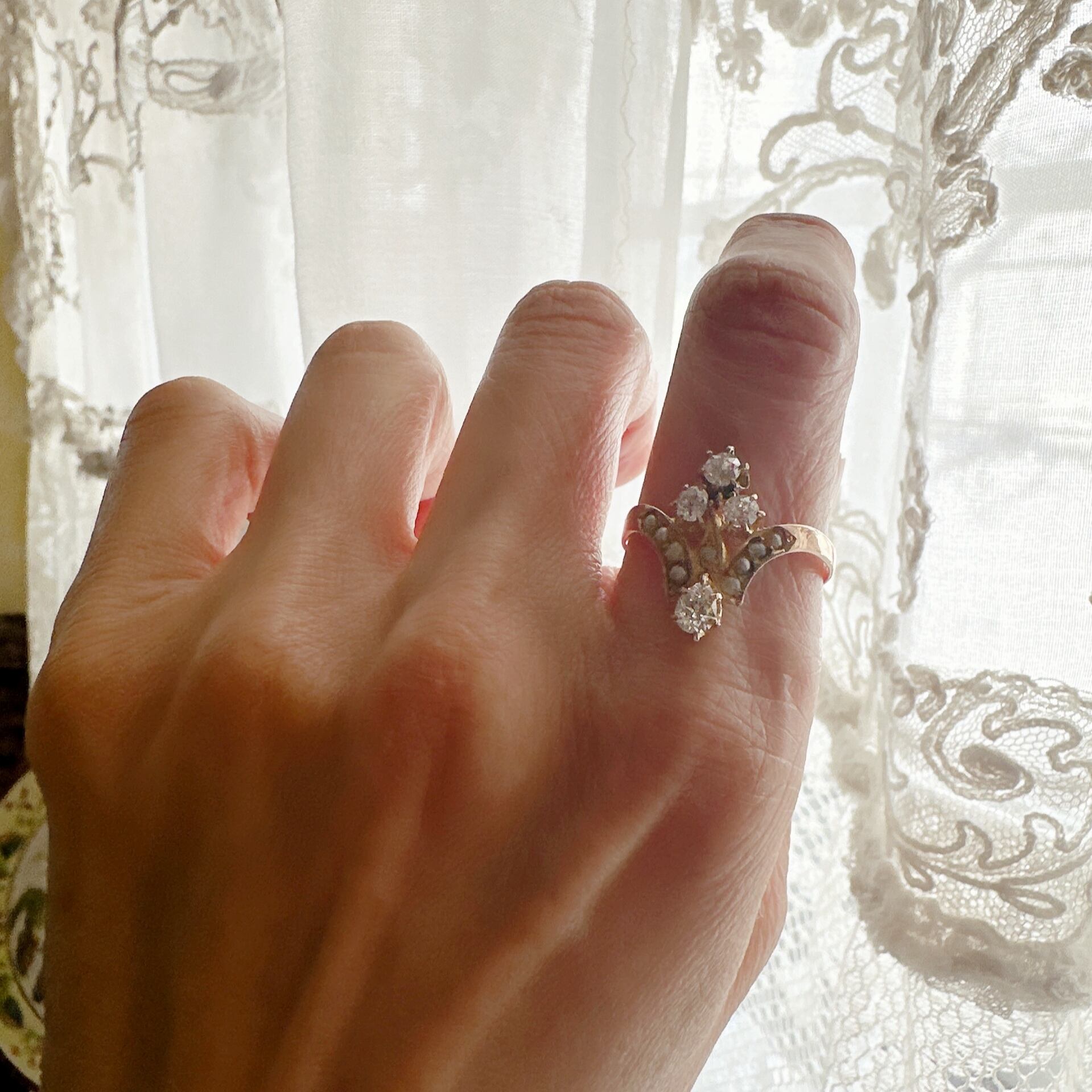 3石のオールドカットダイヤモンドとハーフパールが、優雅なシンメトリーを描きながら、まるで静かな詩の一節のように佇んでいます。