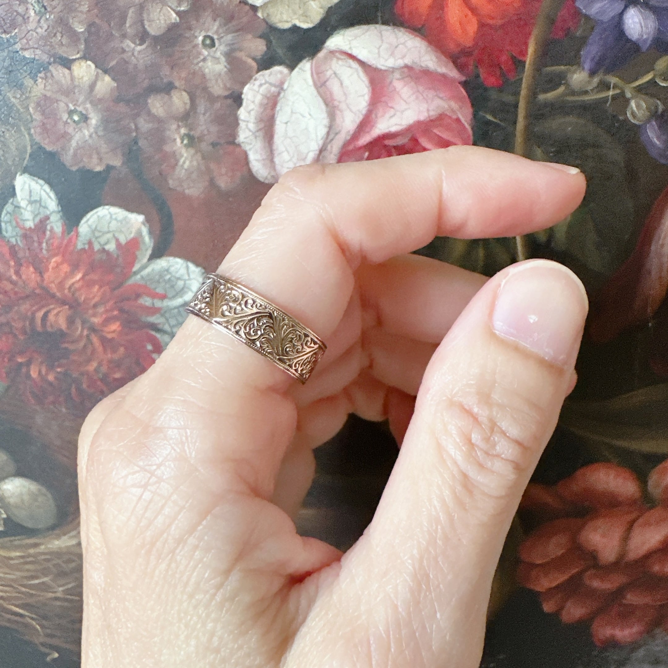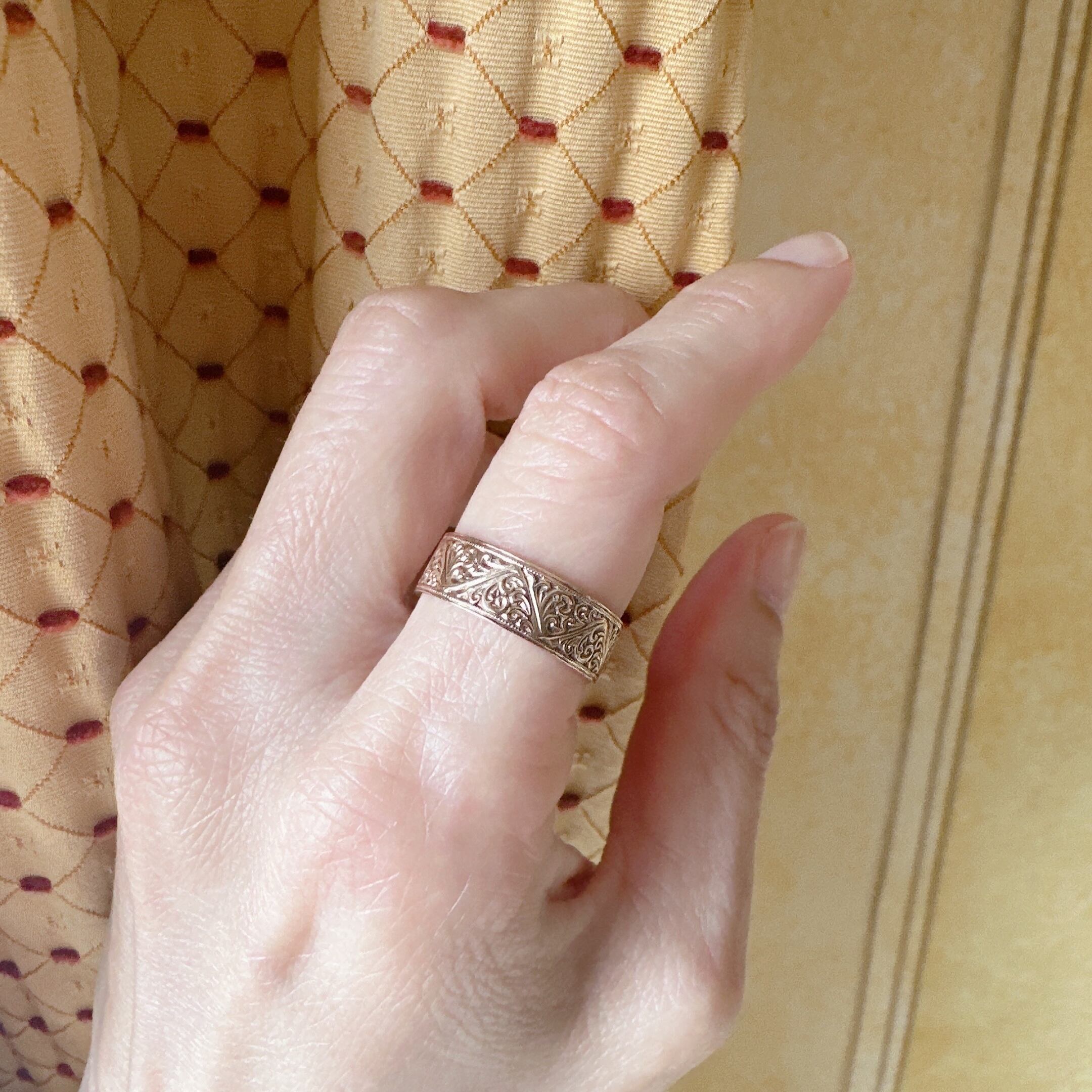 力強くも優雅な手彫りの文様が、リング一周にわたり途切れることなく施され、上下のエッジには精緻なミルグレイン装飾が細やかに打ち込まれています。