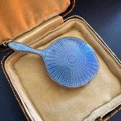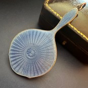 この小さな鏡を彩るのは、ギロッシュエナメルという装飾技法。銀地に極めて緻密な機械彫りを施し、さらにその上から透明なエナメルを幾重にも重ねて焼成することで、光と模様が織りなす奥行きある輝きが生まれるのです。