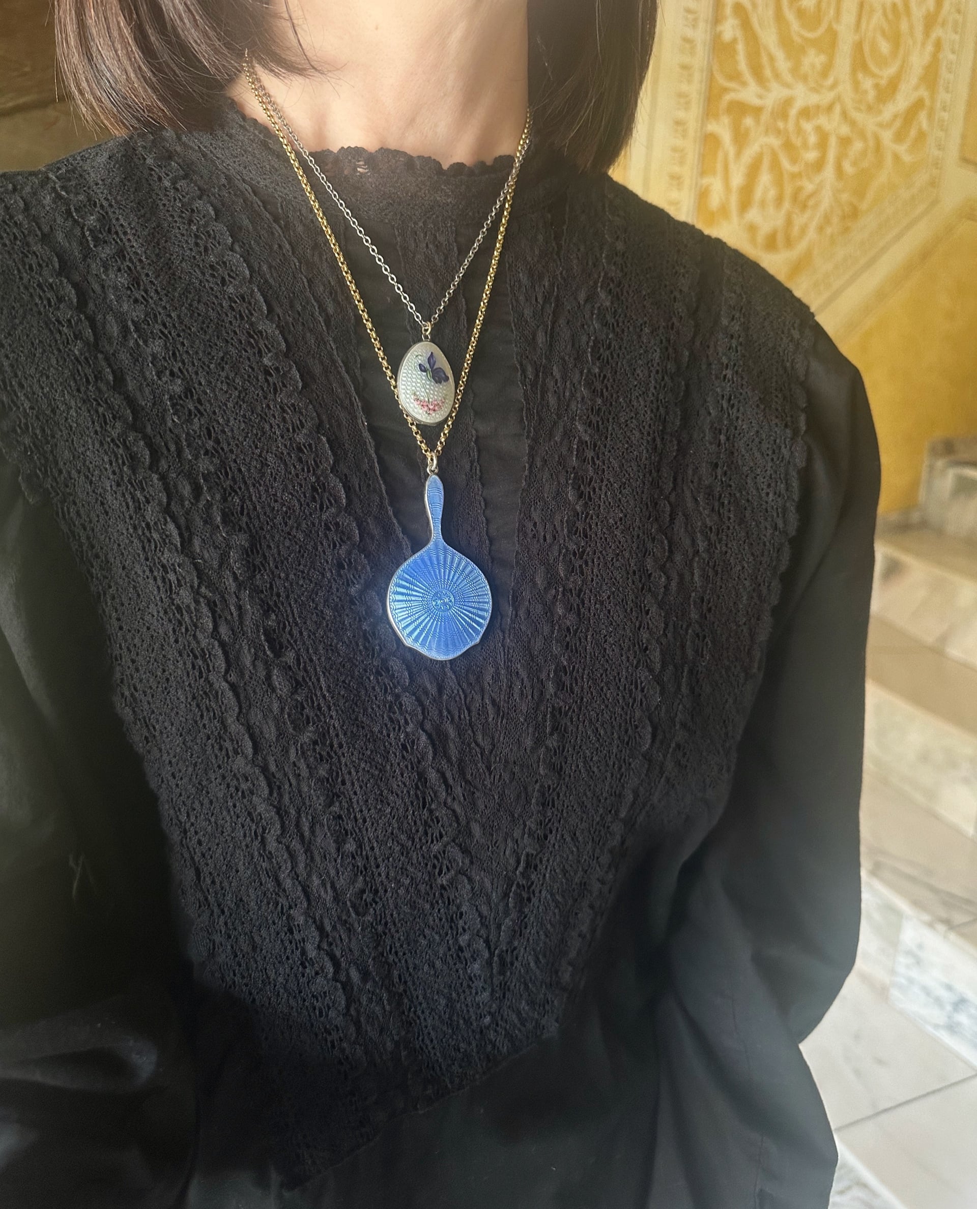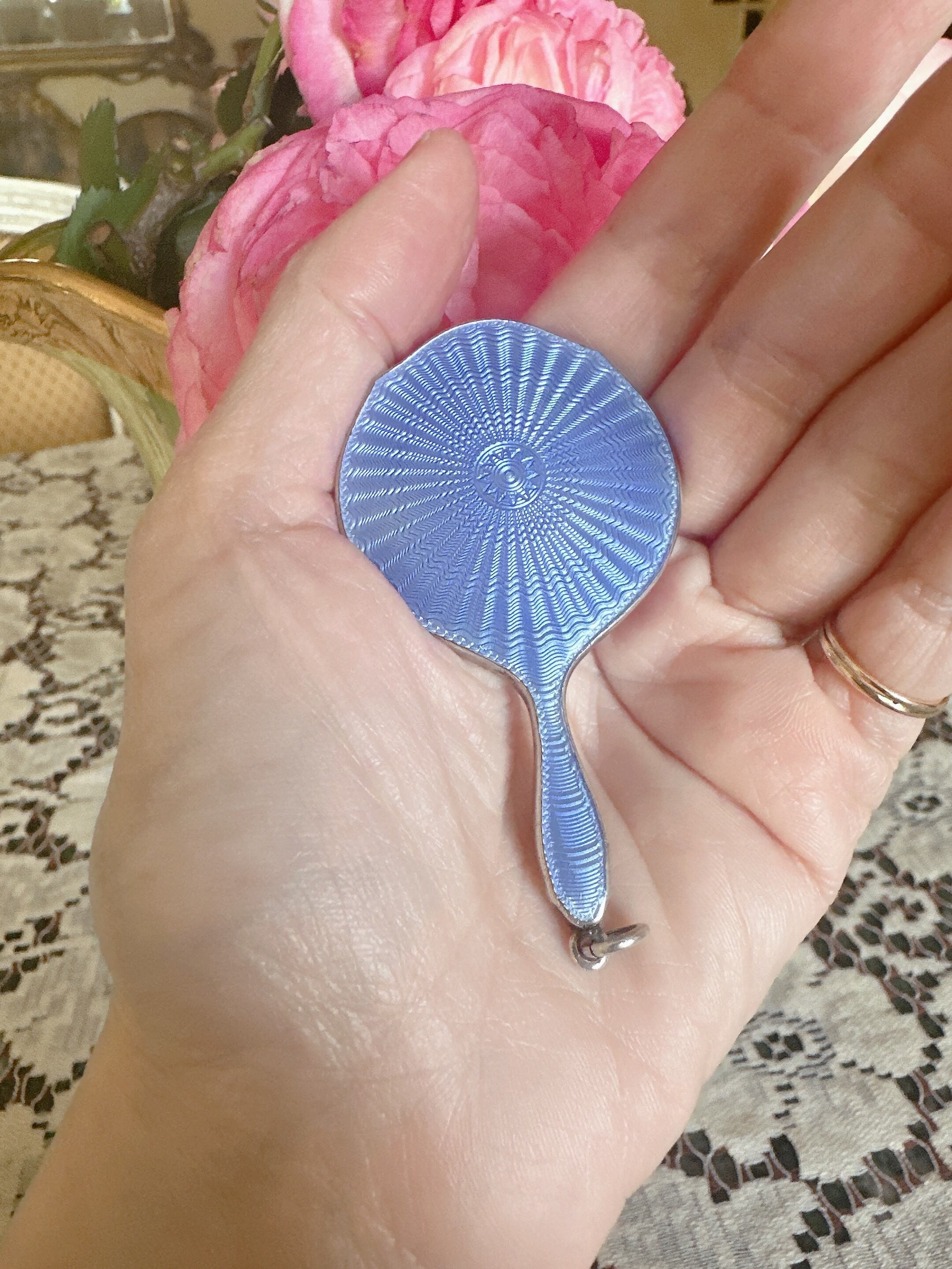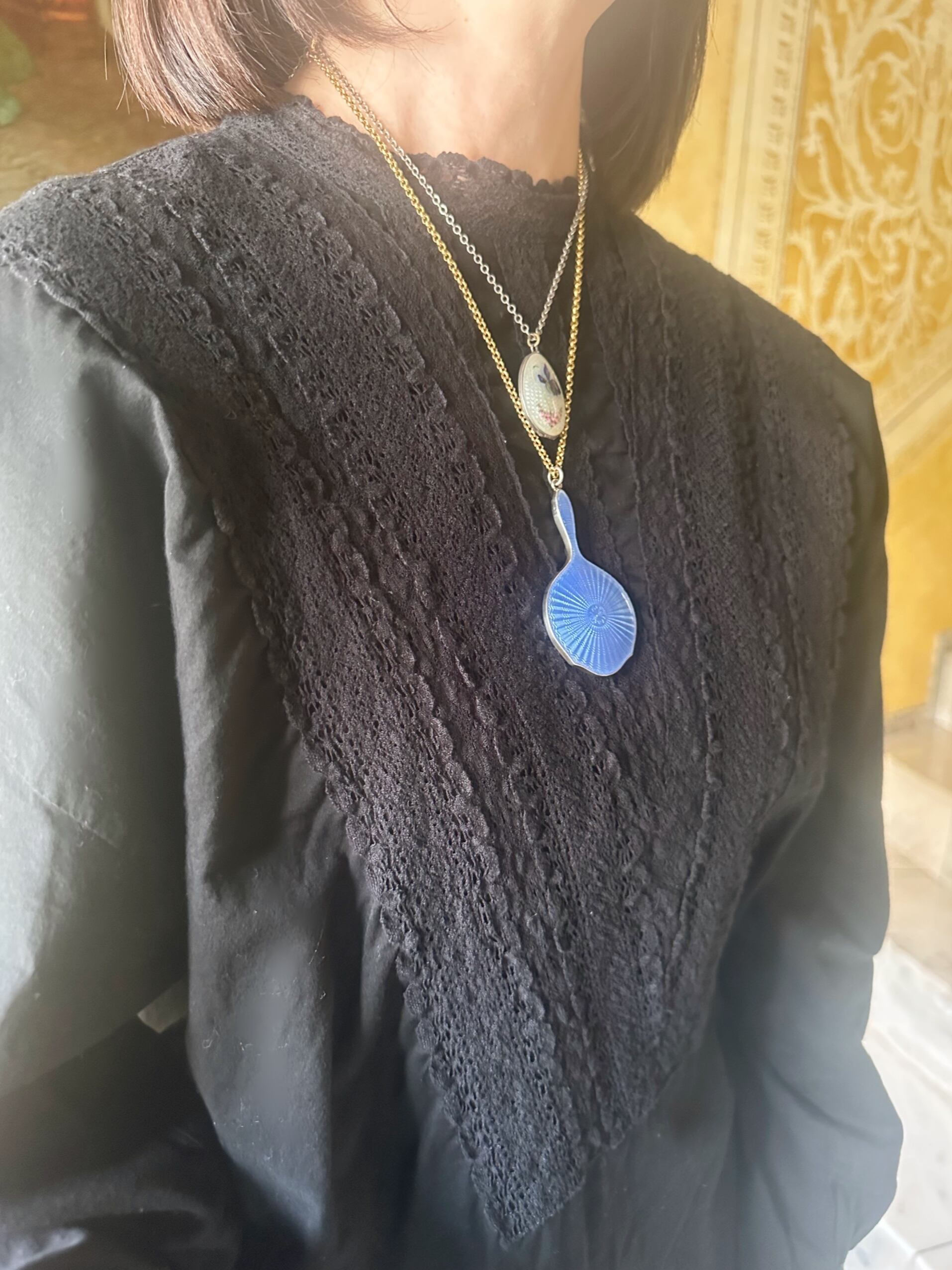 小さなペンダントの姿をしたこの手鏡は、1922年、イギリス・バーミンガムの刻印が残されてます。