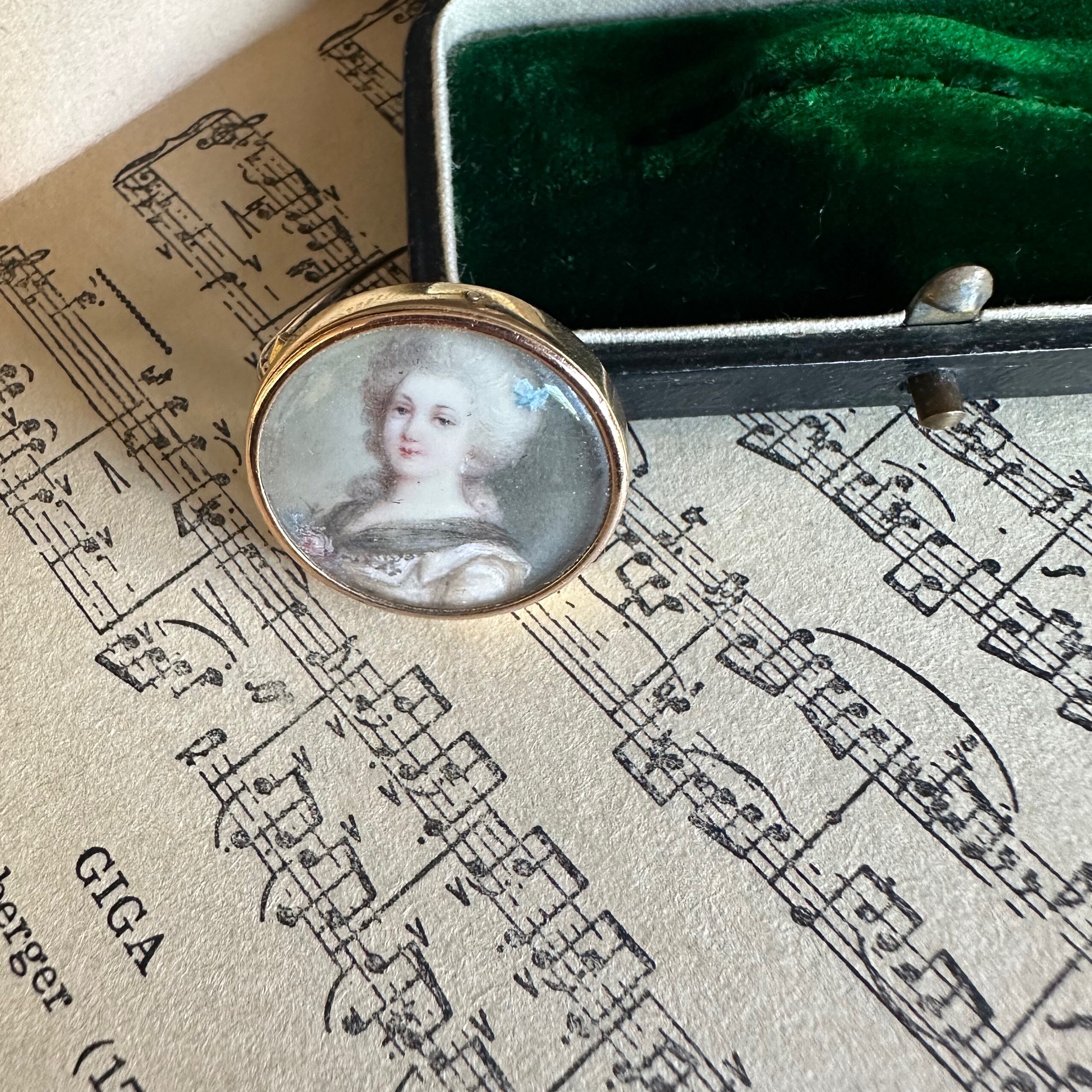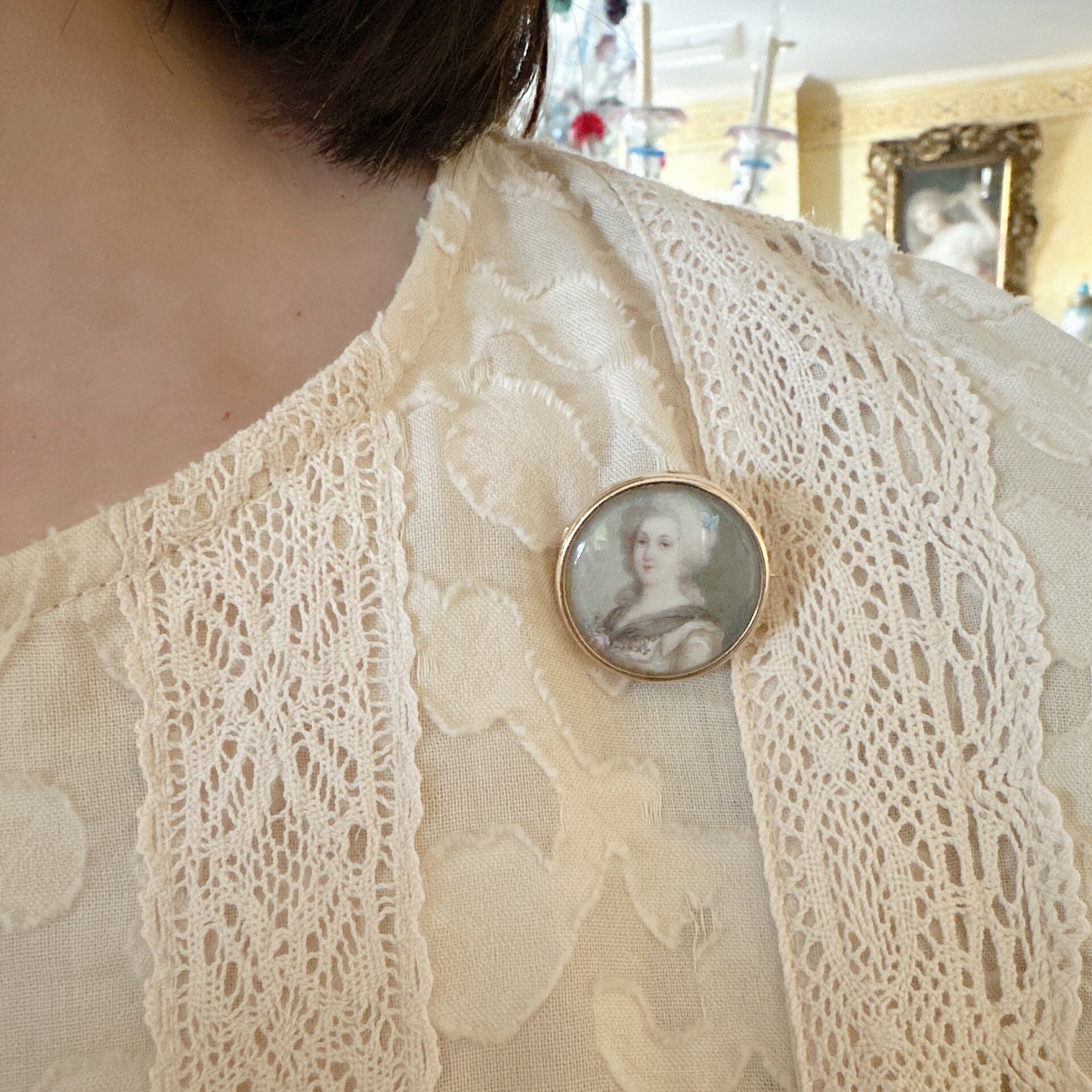 このブローチに描かれているのは、ふわふわ髪に青いリボンをあしらった気品ある女性。その髪型と服装から、18世紀後半のフランス宮廷風のスタイルが見て取れます。