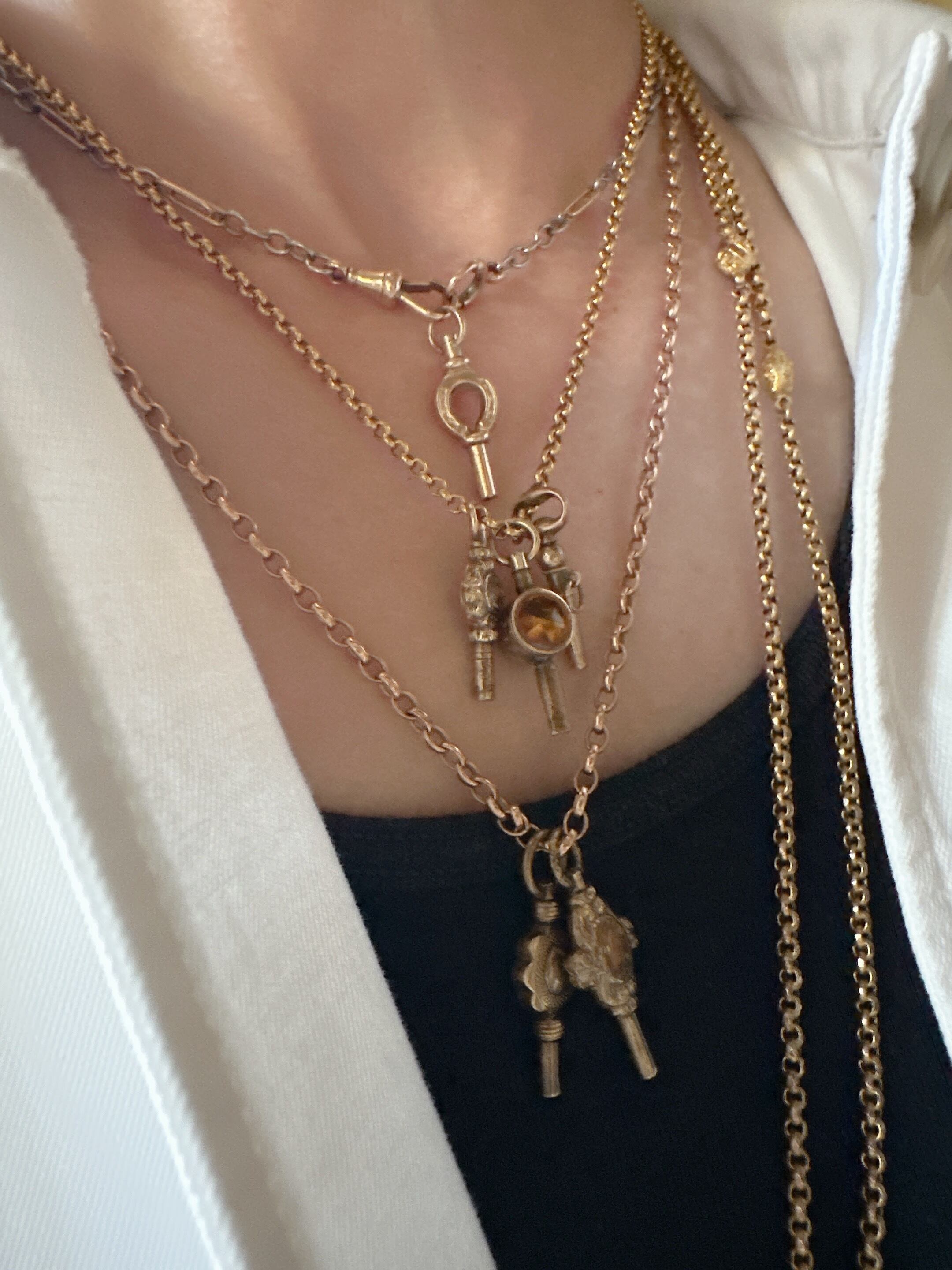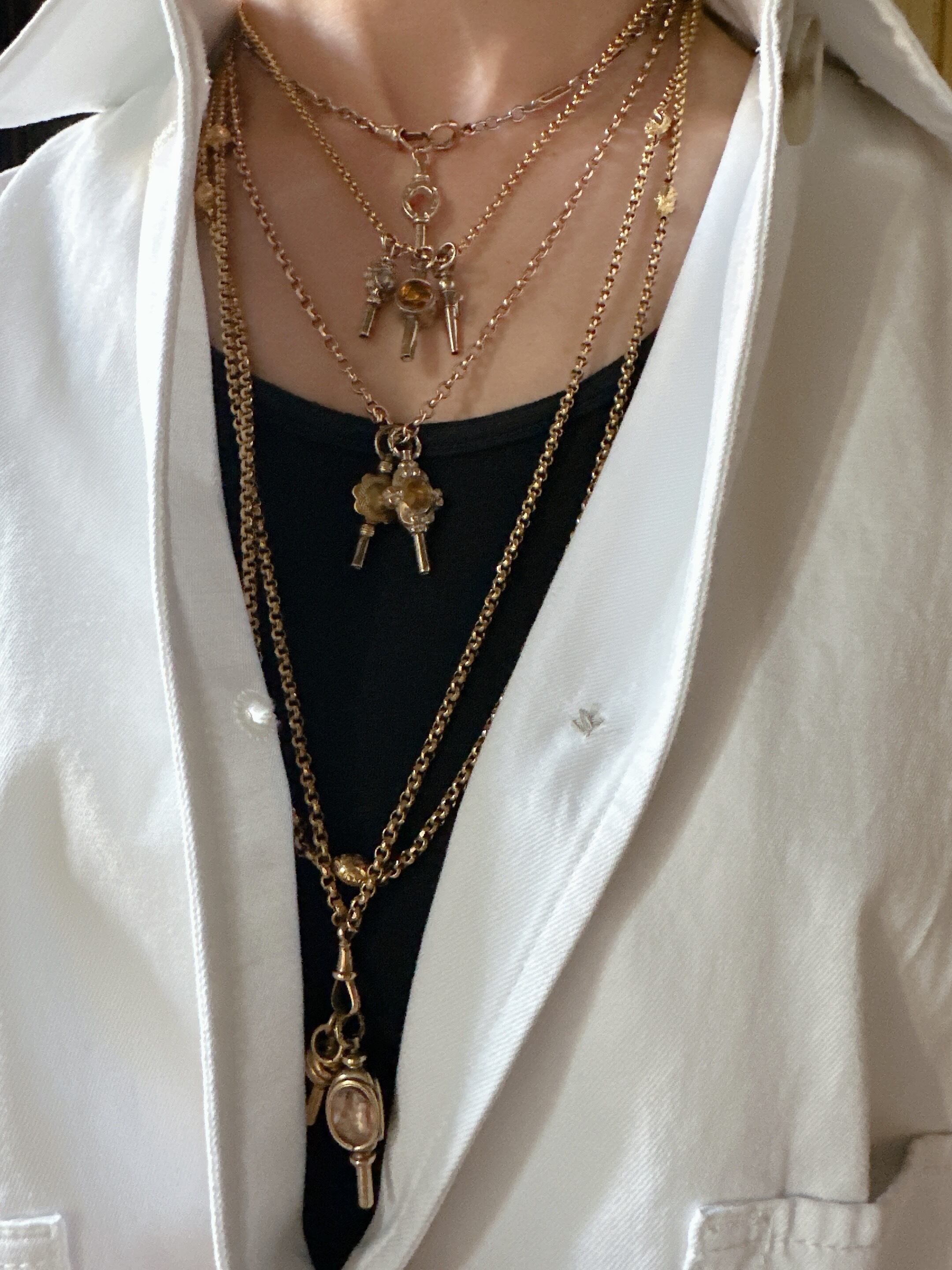 本来の役目を終えた懐中時計のキーたちですが、今では海外のアンティークジュエリーファンの間で、自由な発想でスタイリングを楽しむアイテムとして再注目されています。