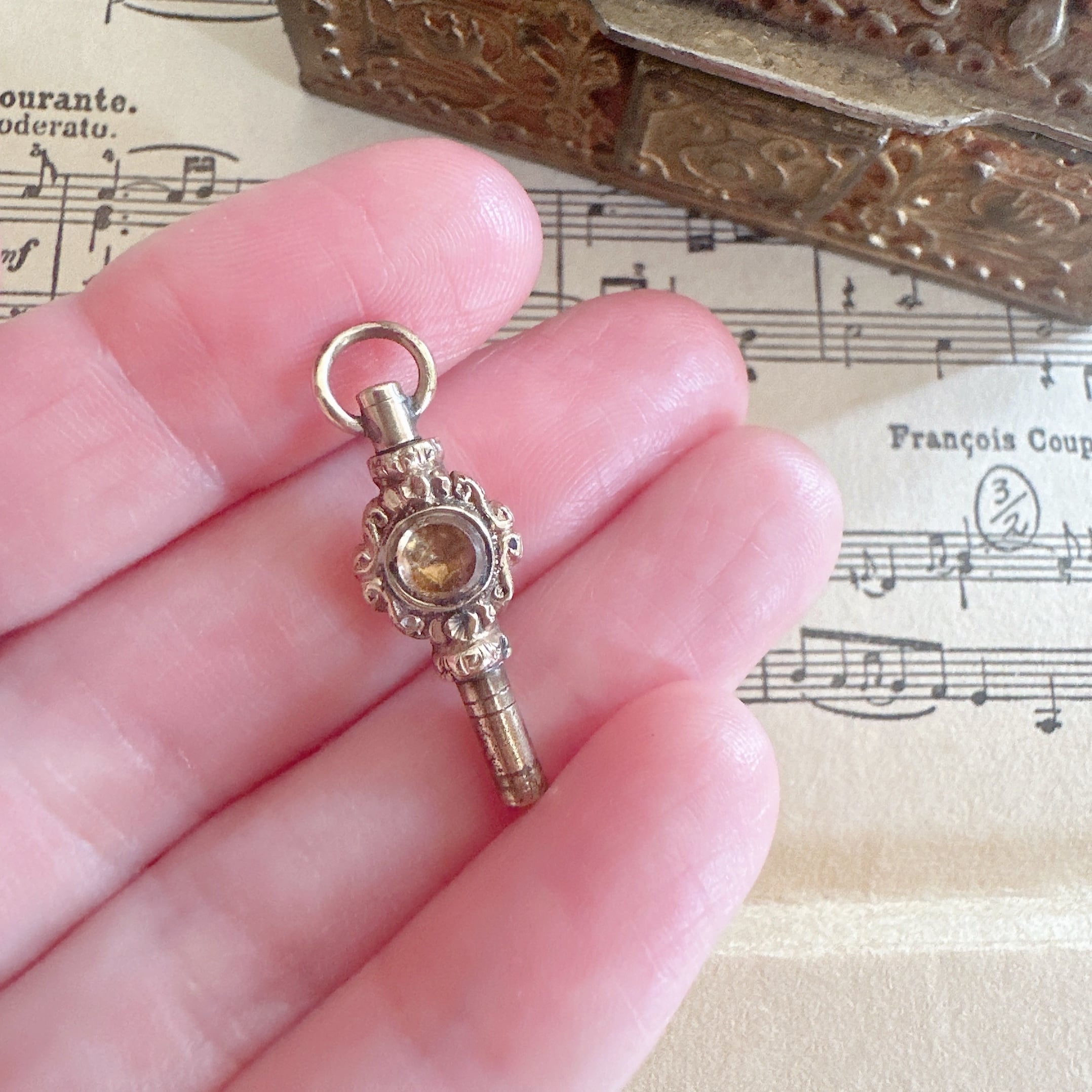 こちらのデコラティブなウォッチキーは、ローカラットゴールドと呼ばれる低純度ゴールドが用いられていて、金そのものとしての価値はありませんが、その分お求めやすく、アンティークジュエリーを気軽に楽しみたい方にぴったりのアイテムです。