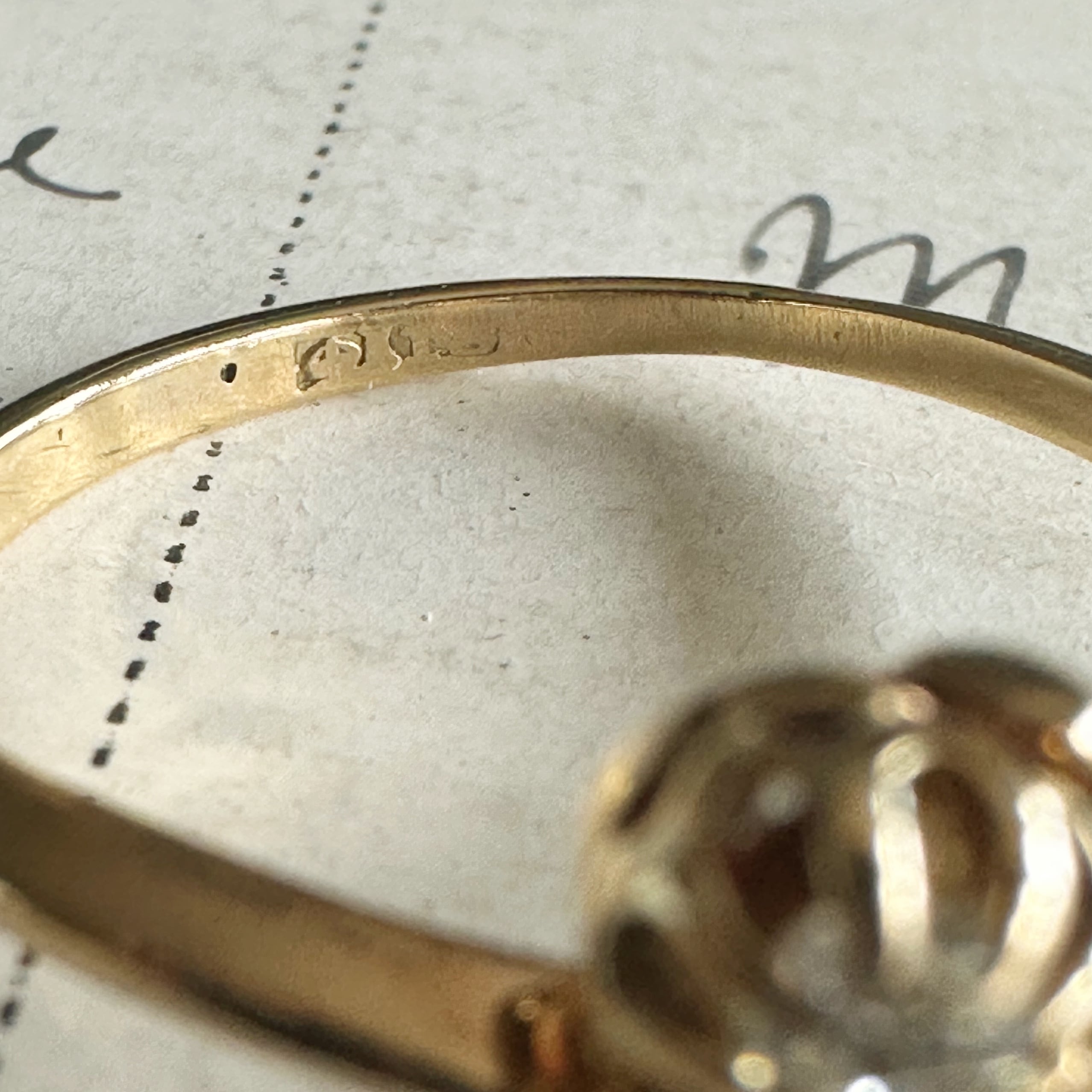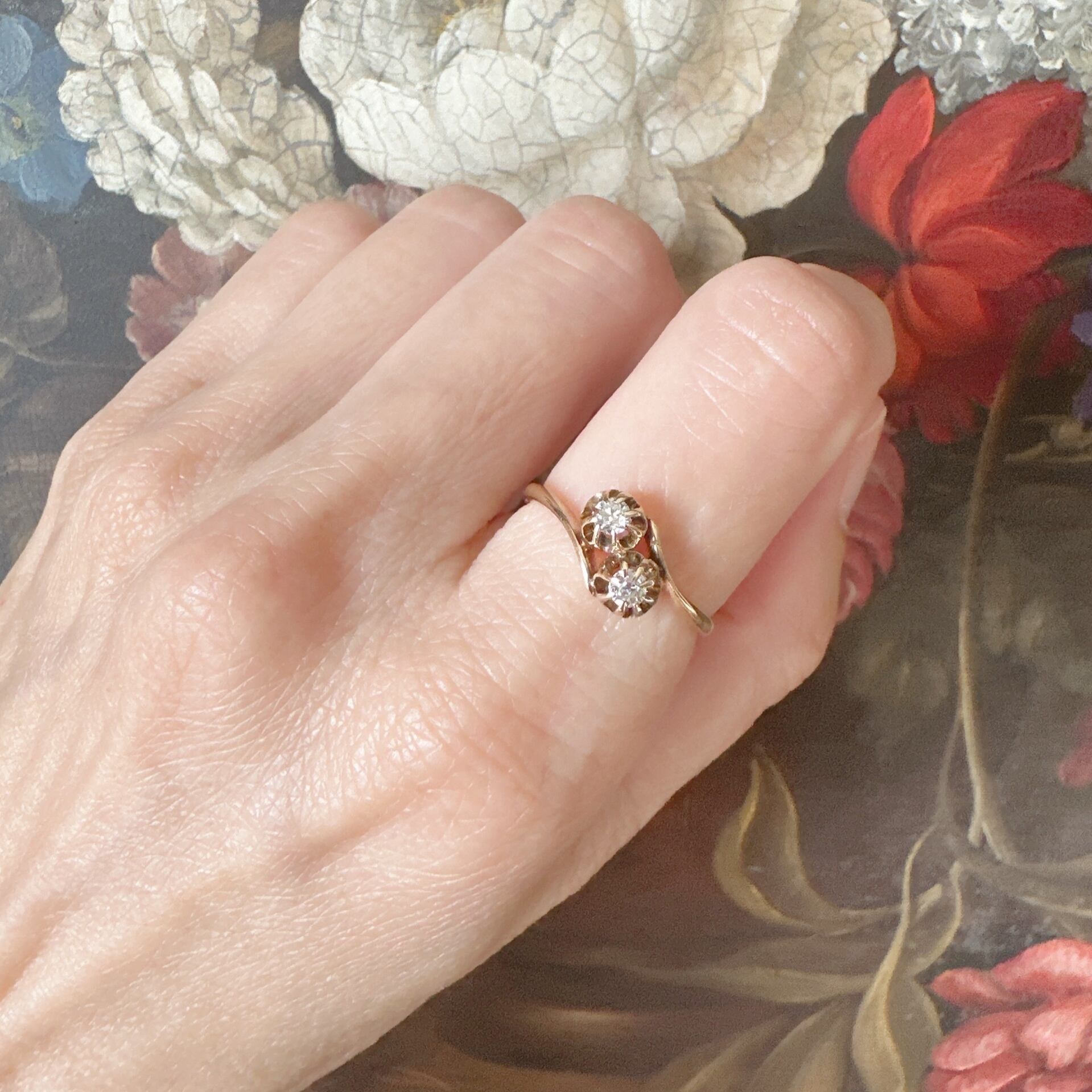 ふたつの小さなオールドカットダイヤモンドが寄り添うように配された、バターカップセッティングのトワエモアリング。