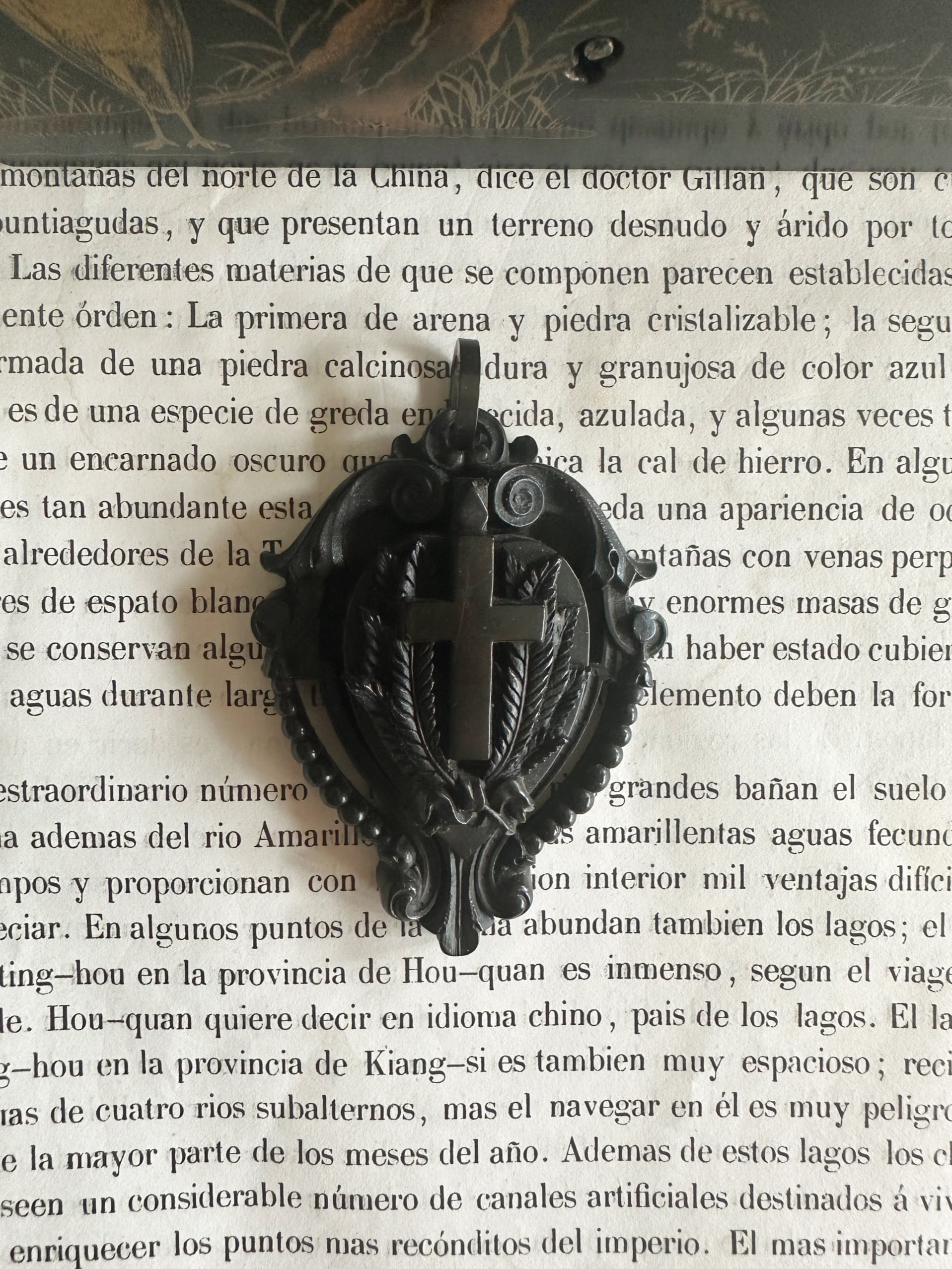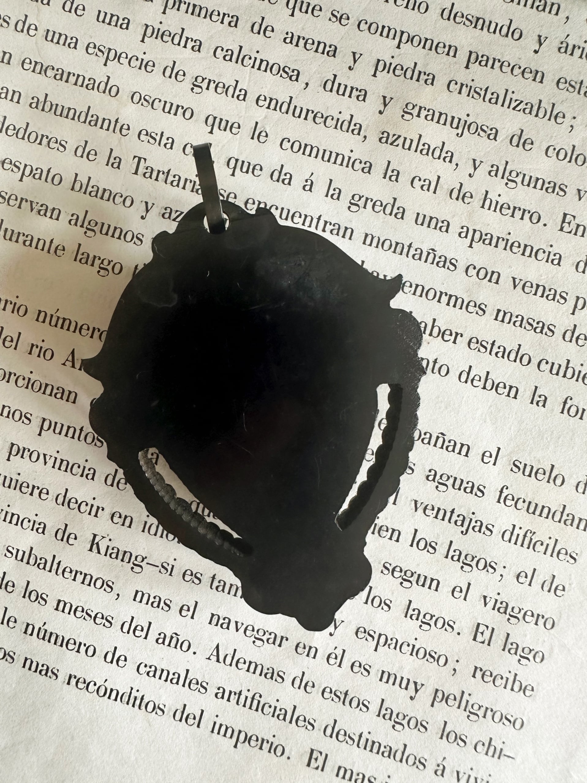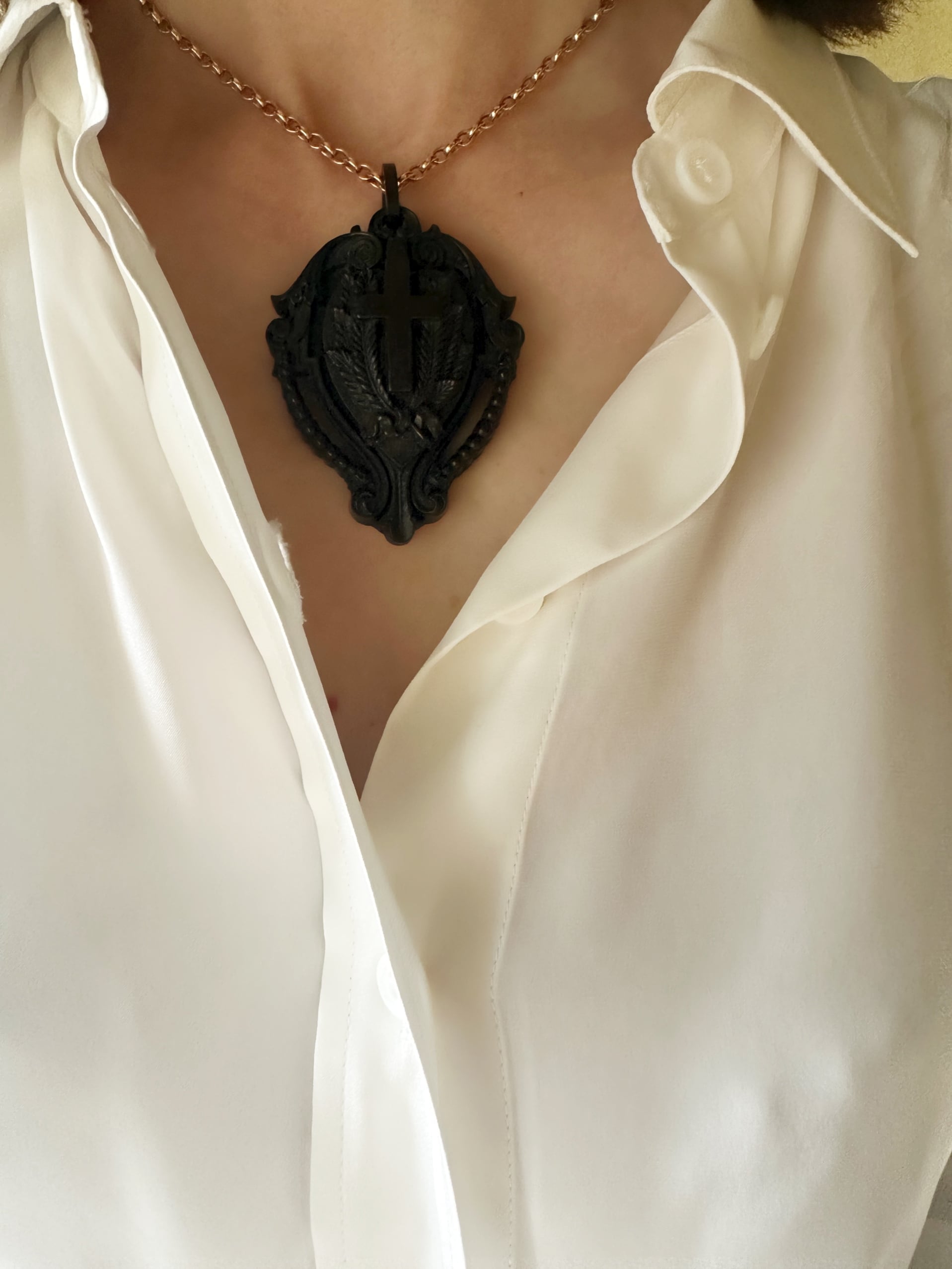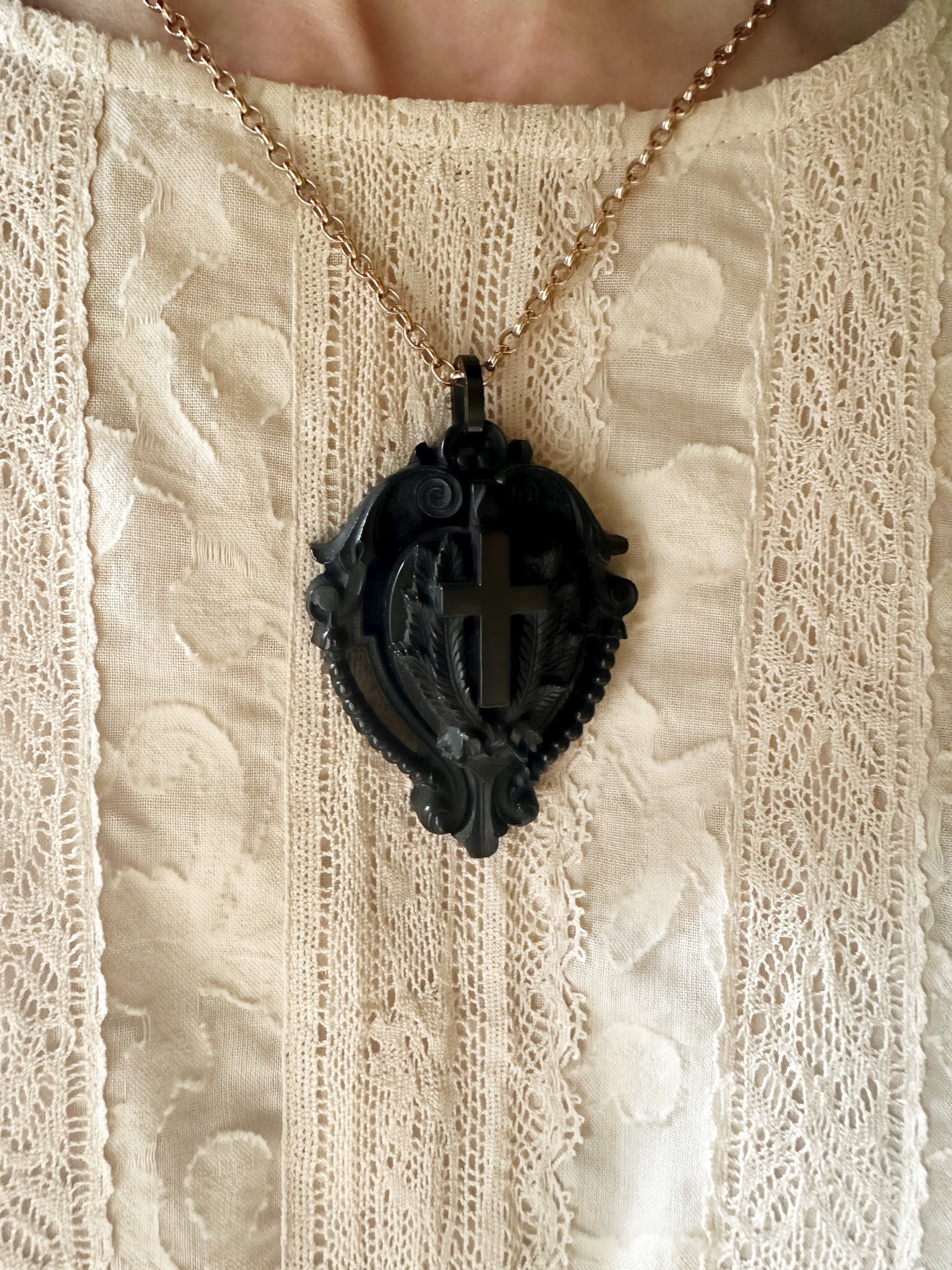 ジェットに似た質感を持ち、軽やかで、しかも繊細な彫刻が施せるため、特に喪のジュエリーとして大流行しました。