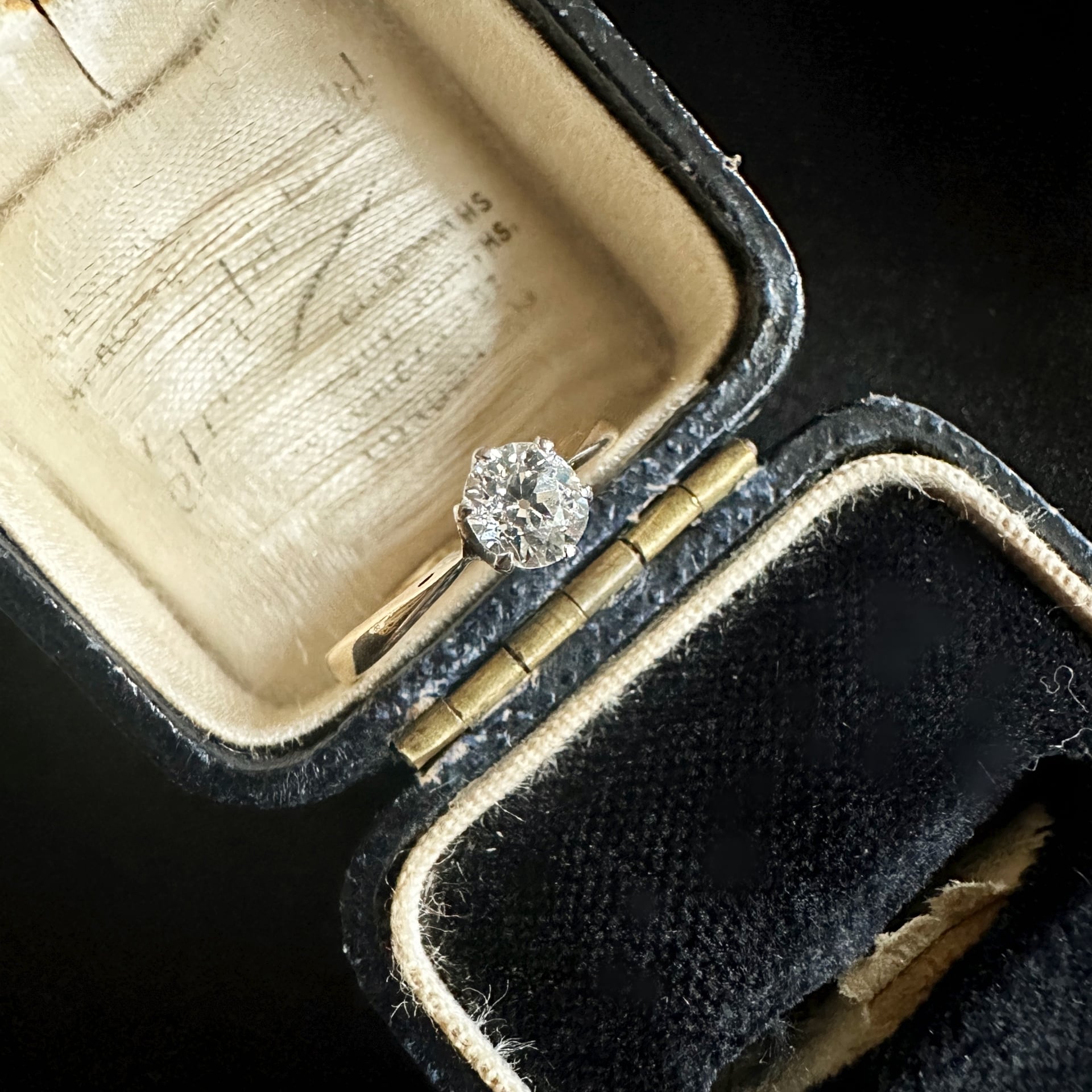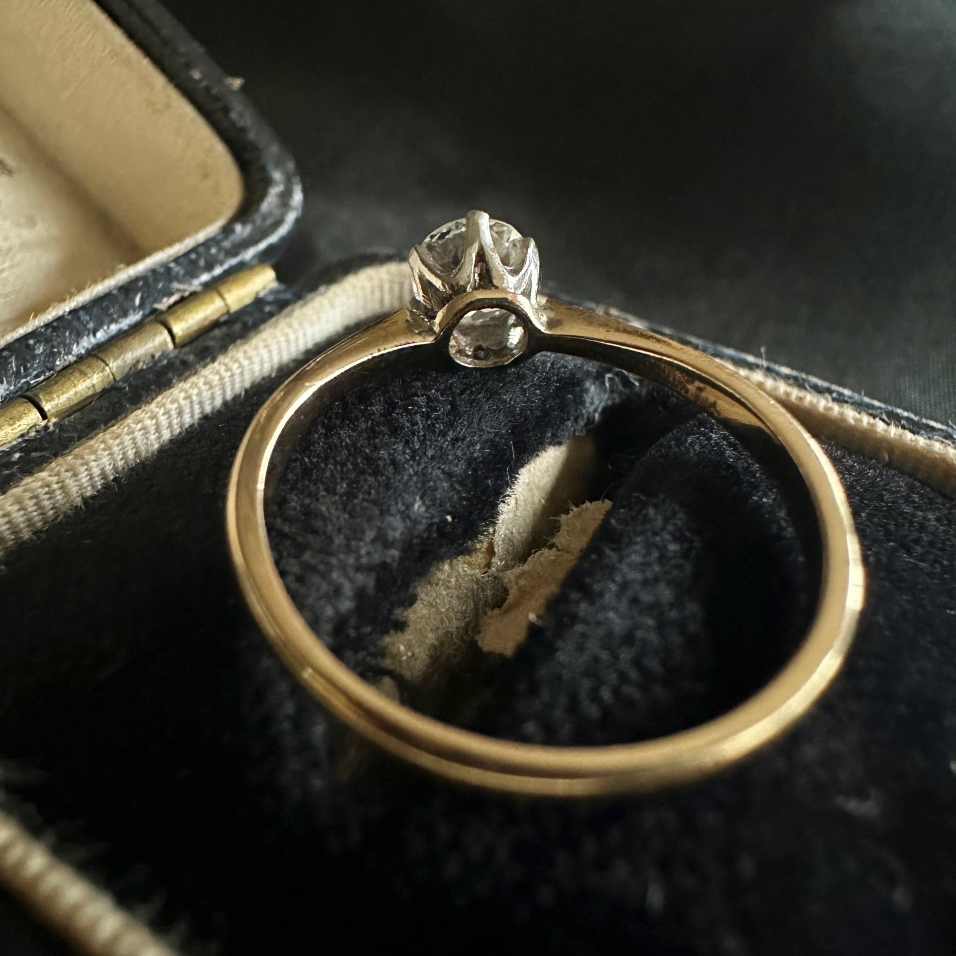 内側から湧き上がるような、アンティークダイヤモンドならではのしっとりとした輝きを湛えた、オールドヨーロピアンカットのダイヤモンドソリテールリング。