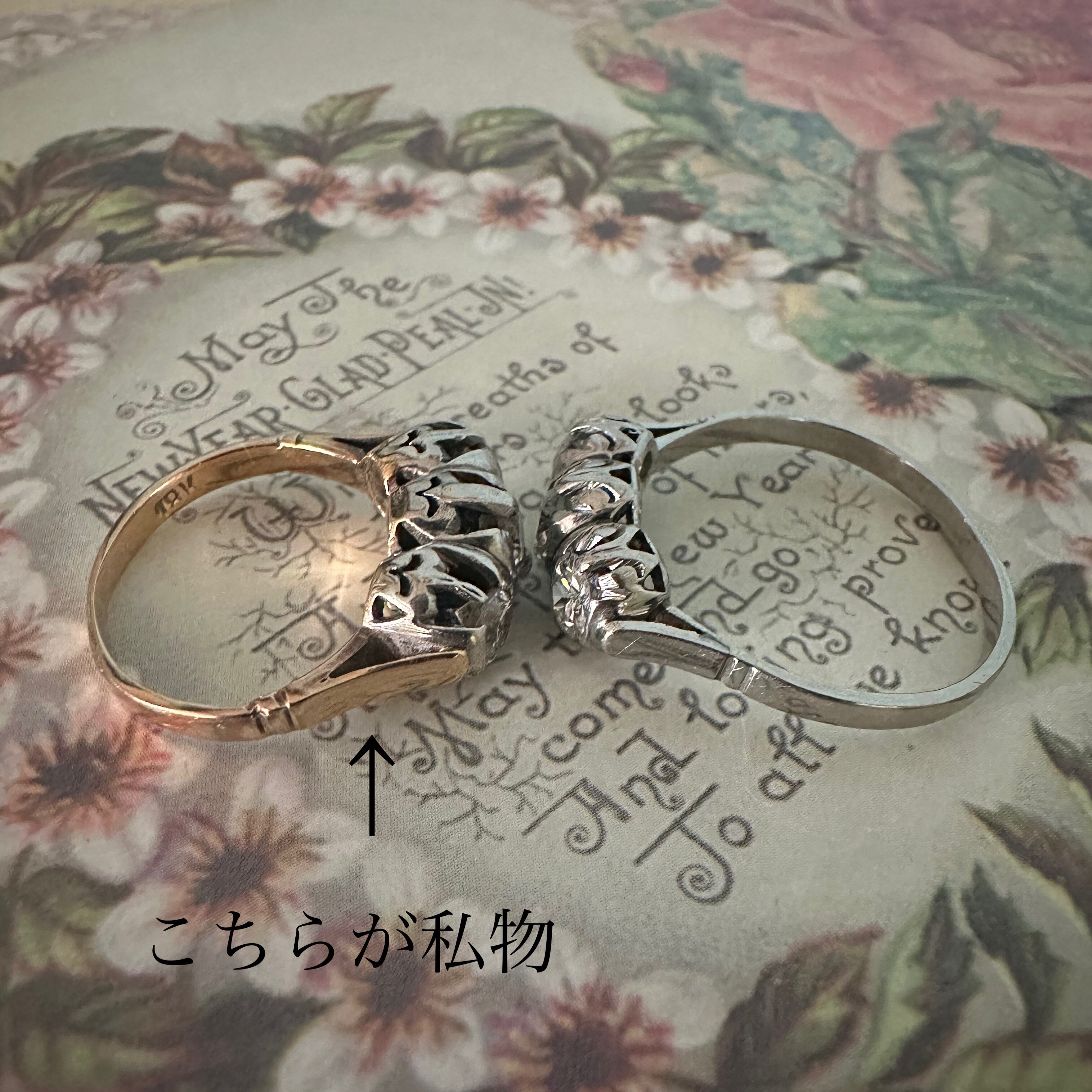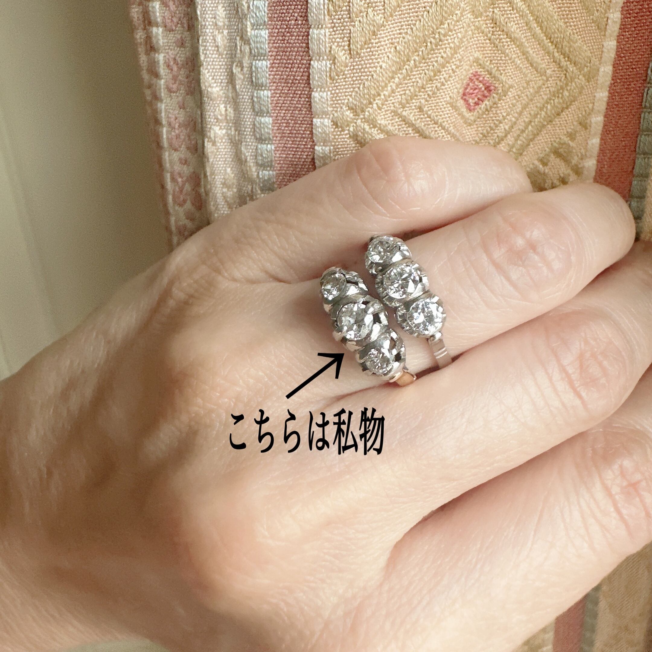 こちらは、1930年代ごろに製作されたと考えられる、プラチナ製のスリーストーンアンティークリング。