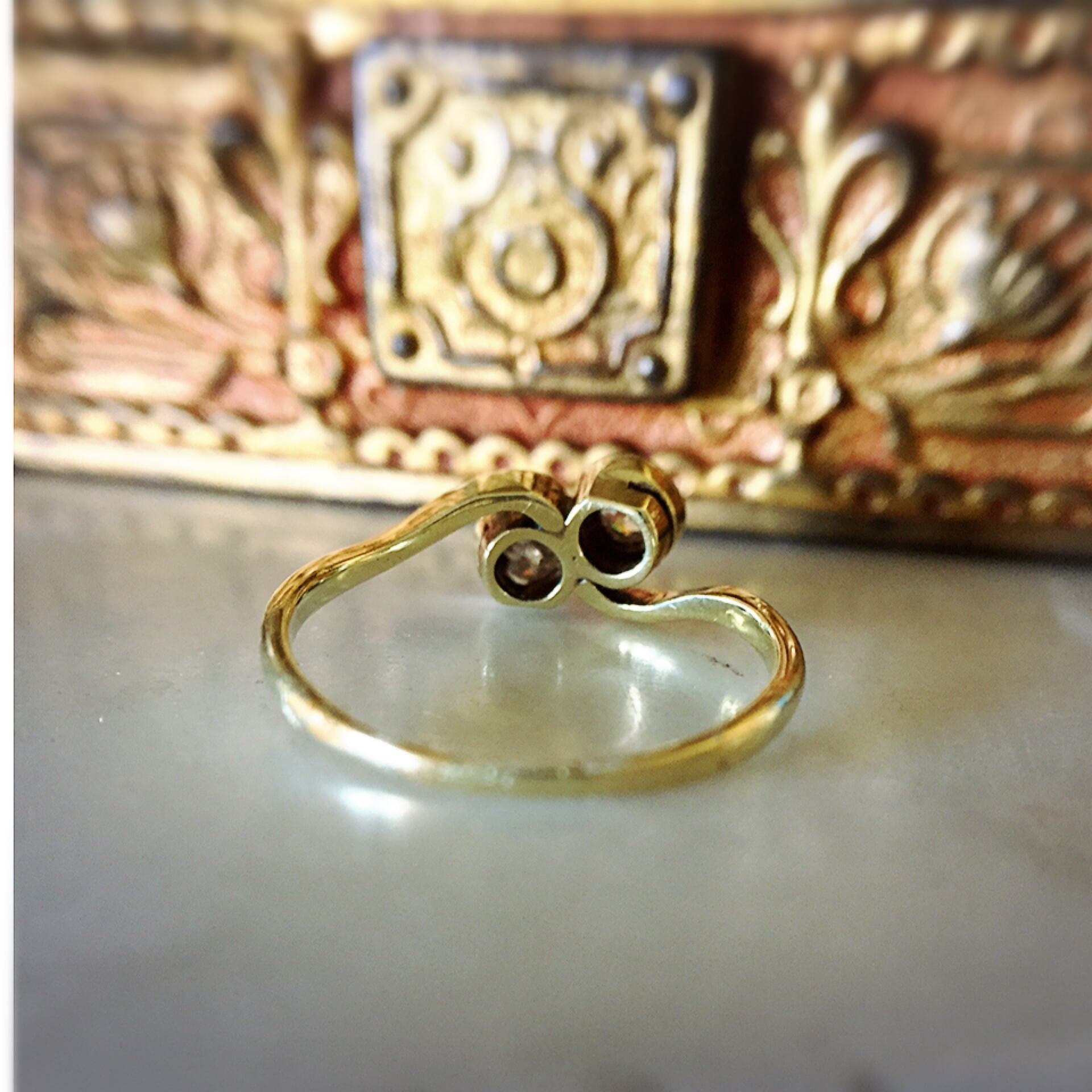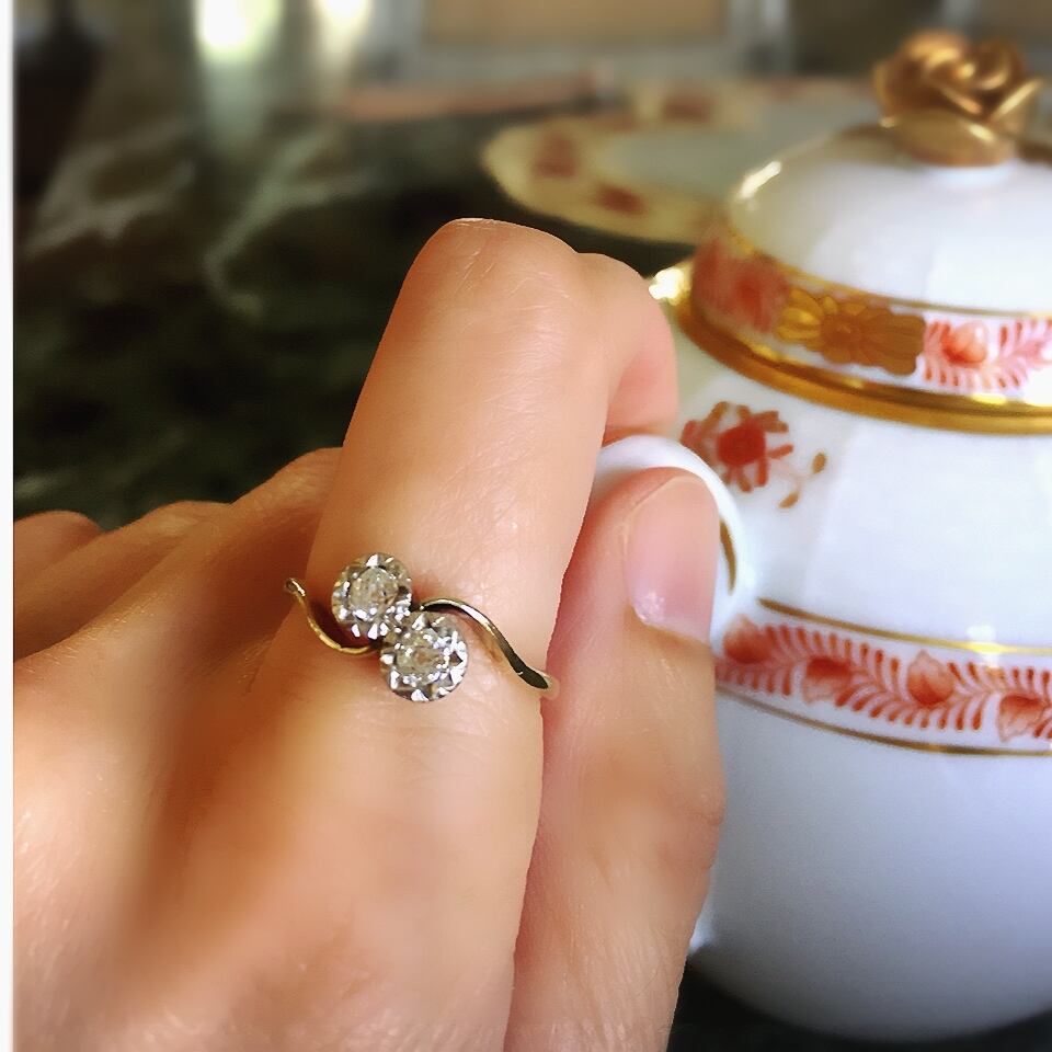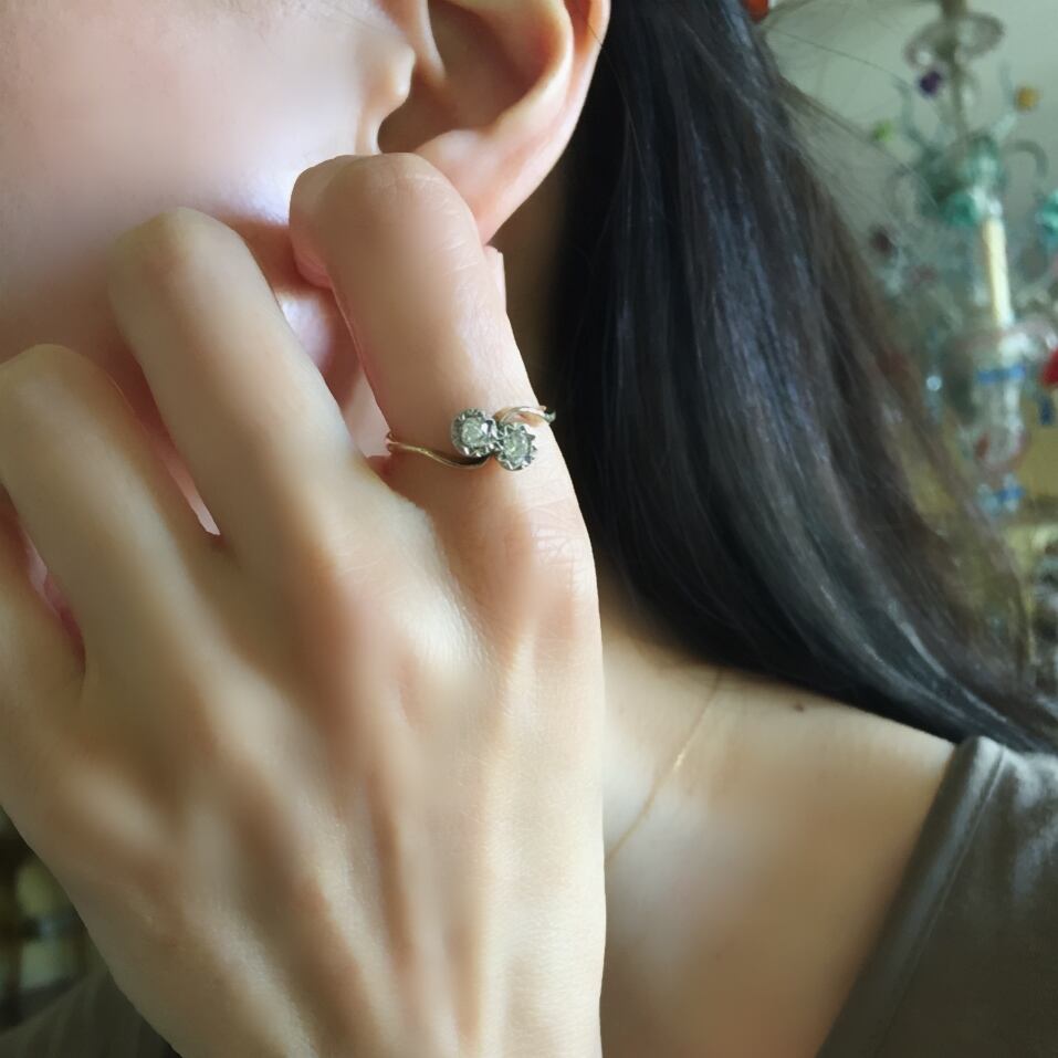 ダイヤモンドの「トワ・エ・モア」つまり「貴方と私」という2つ並んだ石を恋人同士になぞらえ石が交差したデザインを示す20世紀初頭に流行したリングです。