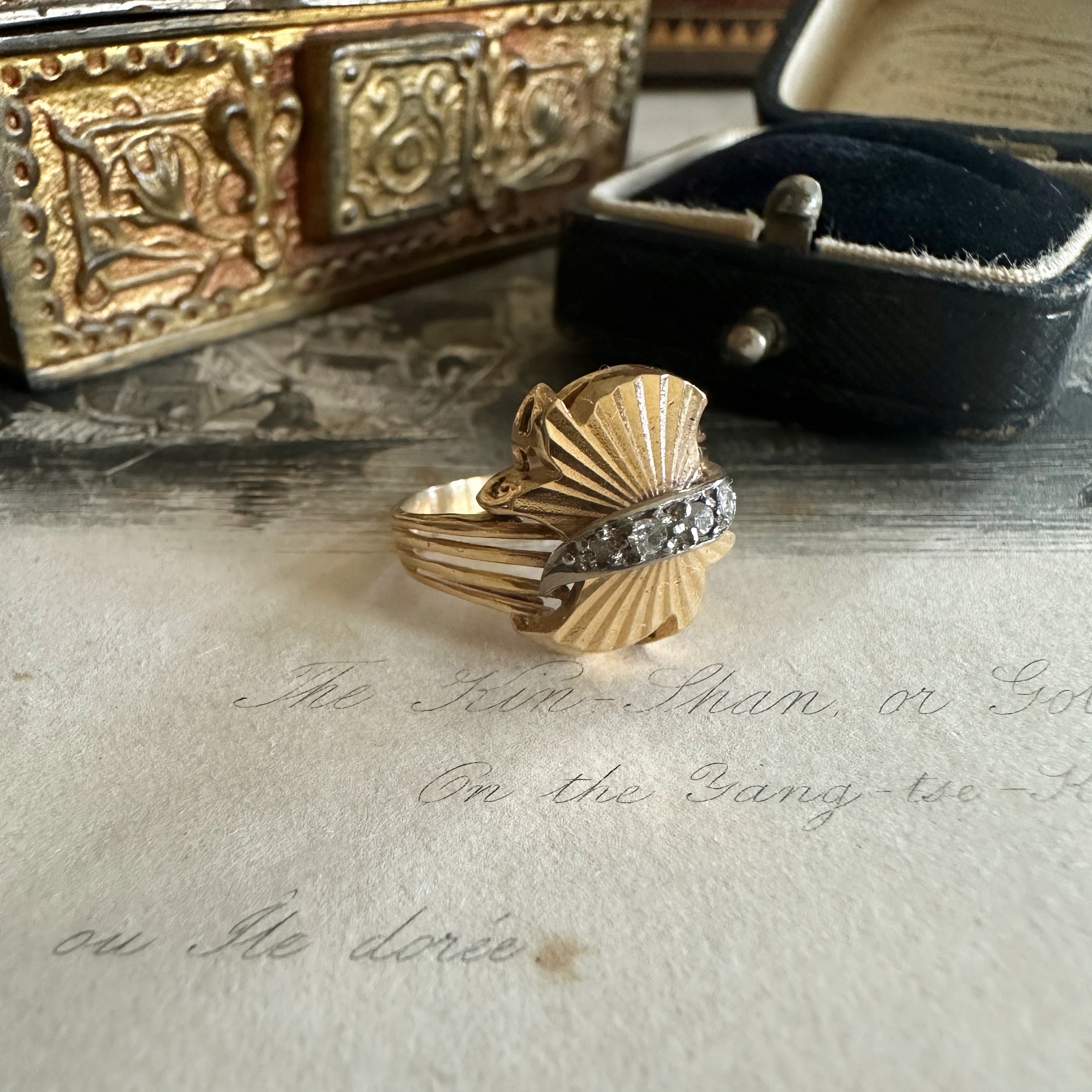 リボンにはシャープな放射状の彫りが施され、中央にはダイヤモンドがリズムよく並び、きゅっと結ばれたような印象を与えます。甘さとクールさが絶妙に交差するデザインがレアで素敵です。