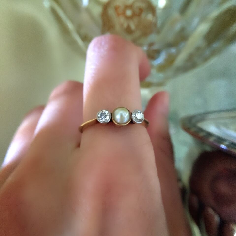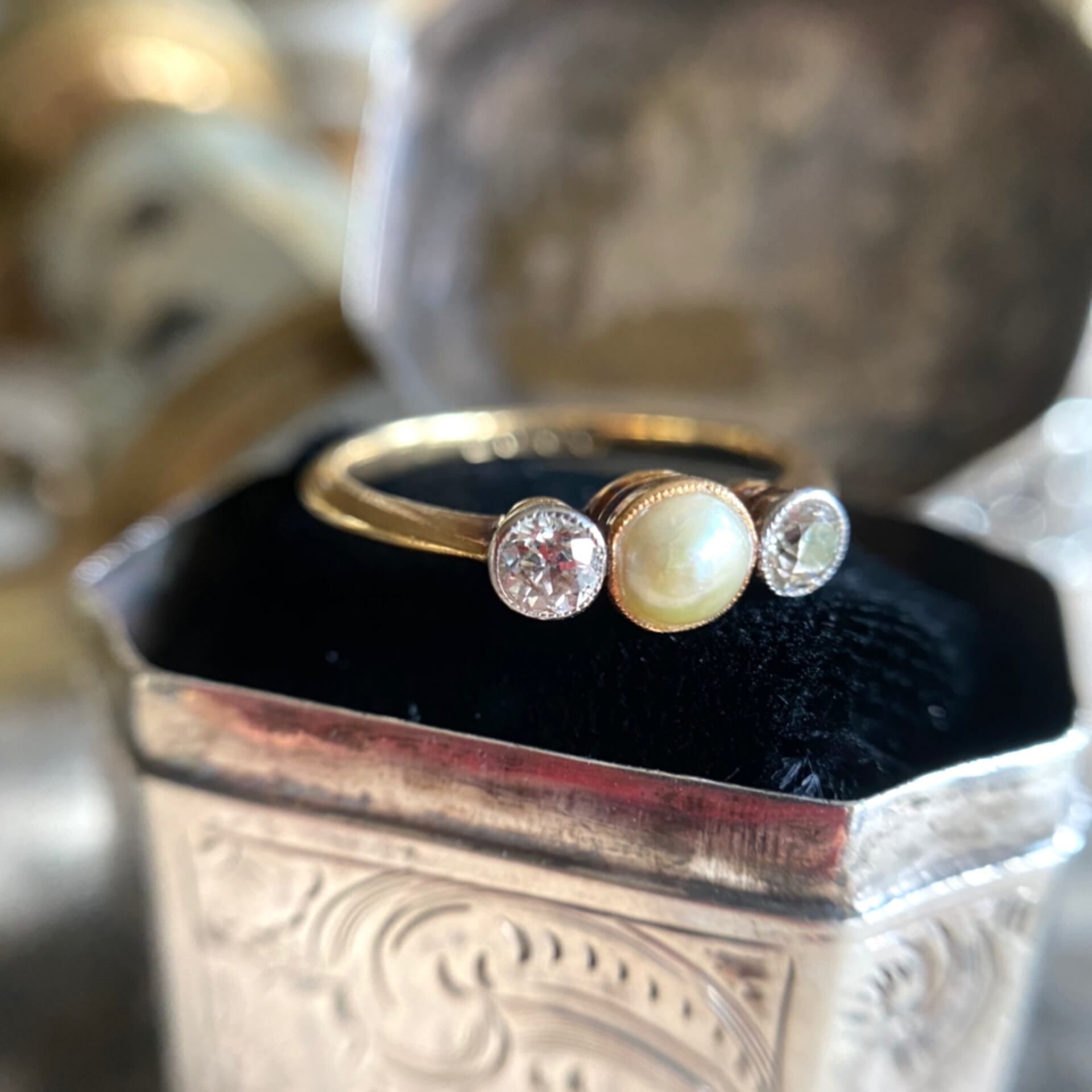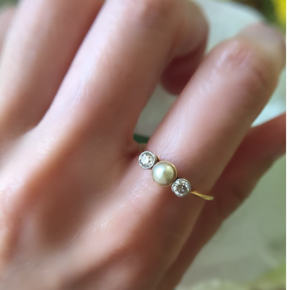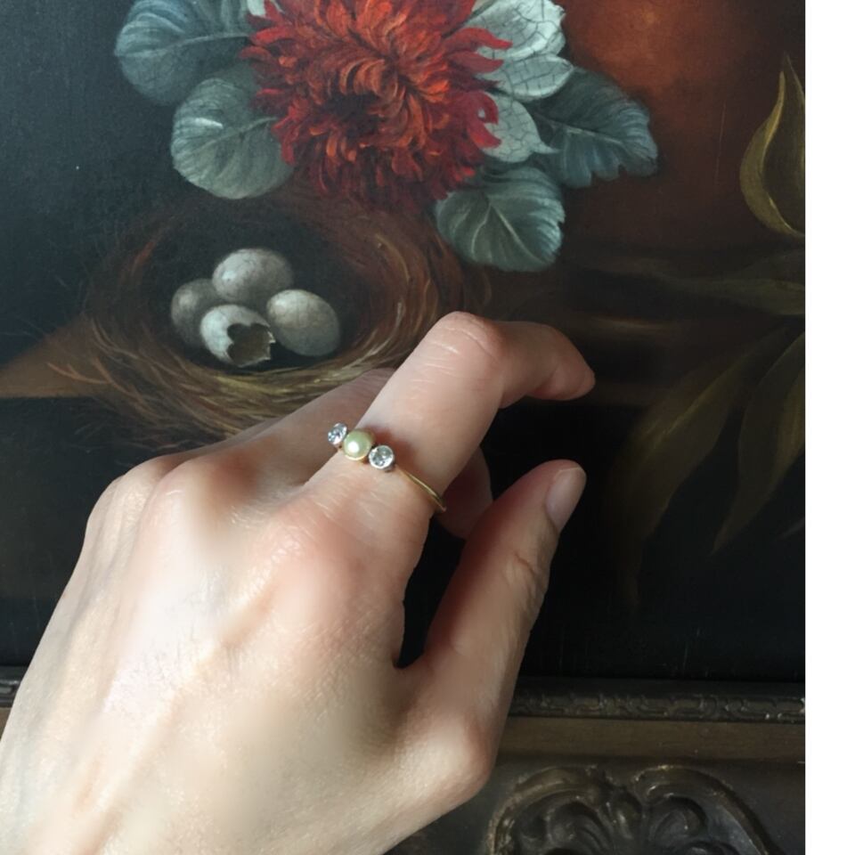 2粒のダイヤモンドの間にクリーミーな色味のナチュラルハーフパールをセットしたトリロジーリング。