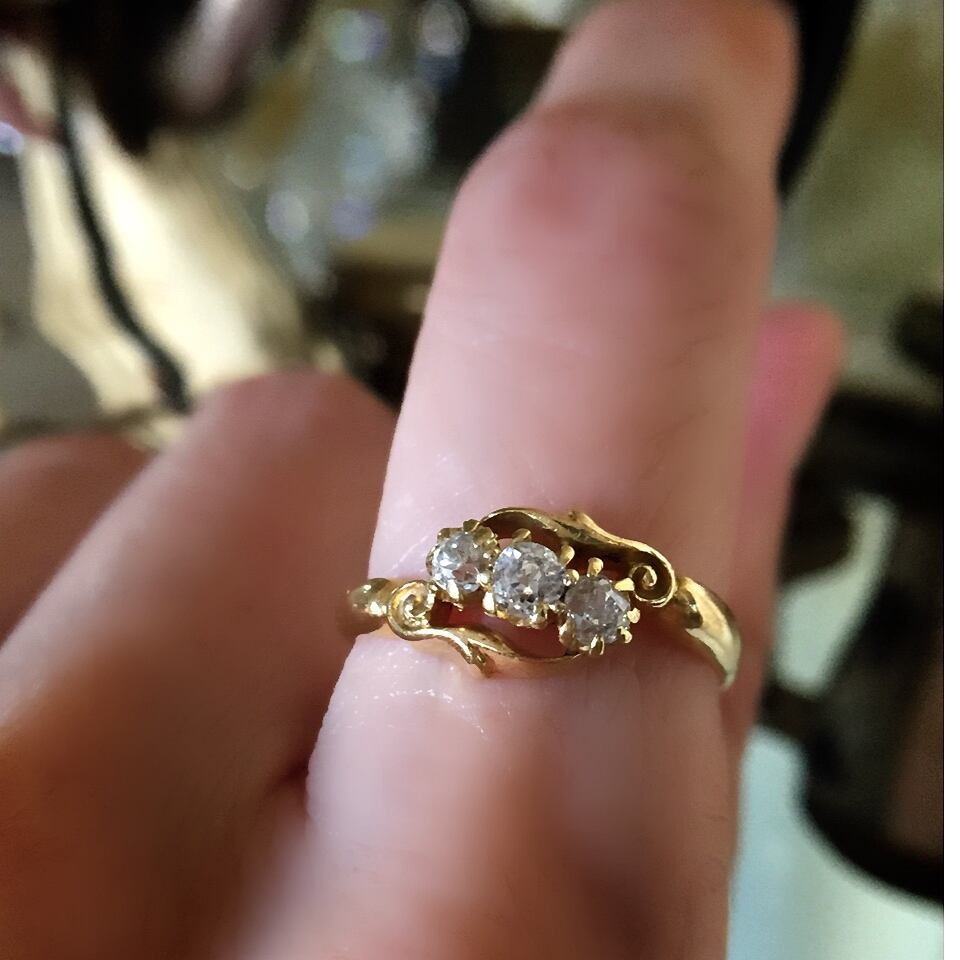 しなやかに流れるような台座に3粒のダイヤモンドがセットされたトリロジーリングです。