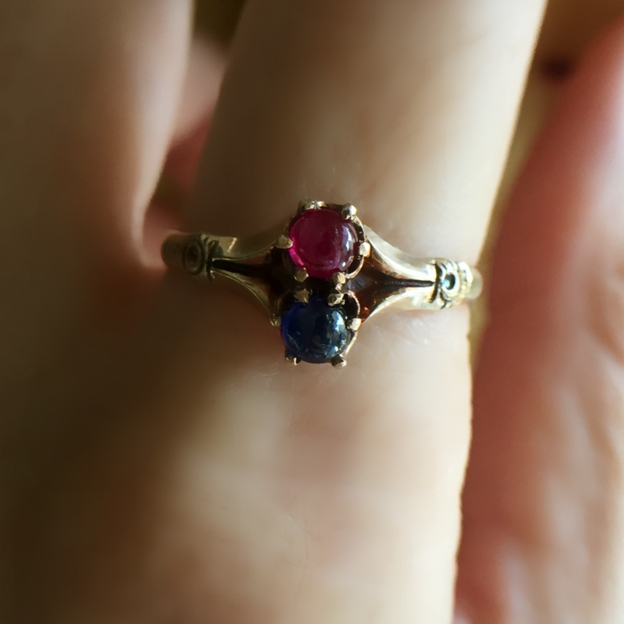 カボションカットのルビーとサファイアをあしらった「トワ・エ・モア」つまり「貴方と私」という2つ並んだ石を恋人同士になぞらえ石が交差したデザインを示す20世紀初頭に流行したリングです。
