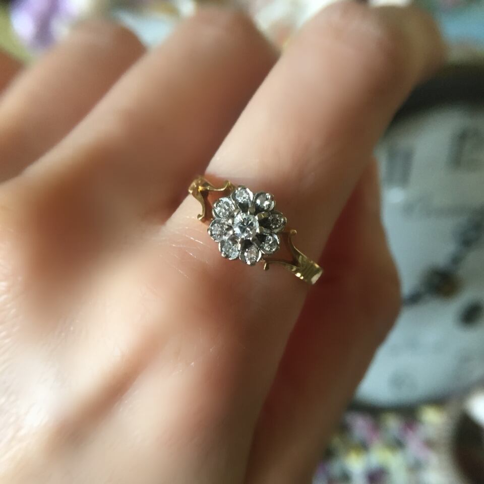 フラワークラスーターリングはアンティークの定番+憧れですが、いつの世も変わらない花を愛でるデザインは、決して古びることはなく、アンティークダイヤモンドの輝きが味わいを深め、イエローゴールドとの組み合わせも現代のそれとはひと味違った風情を感じさせます。