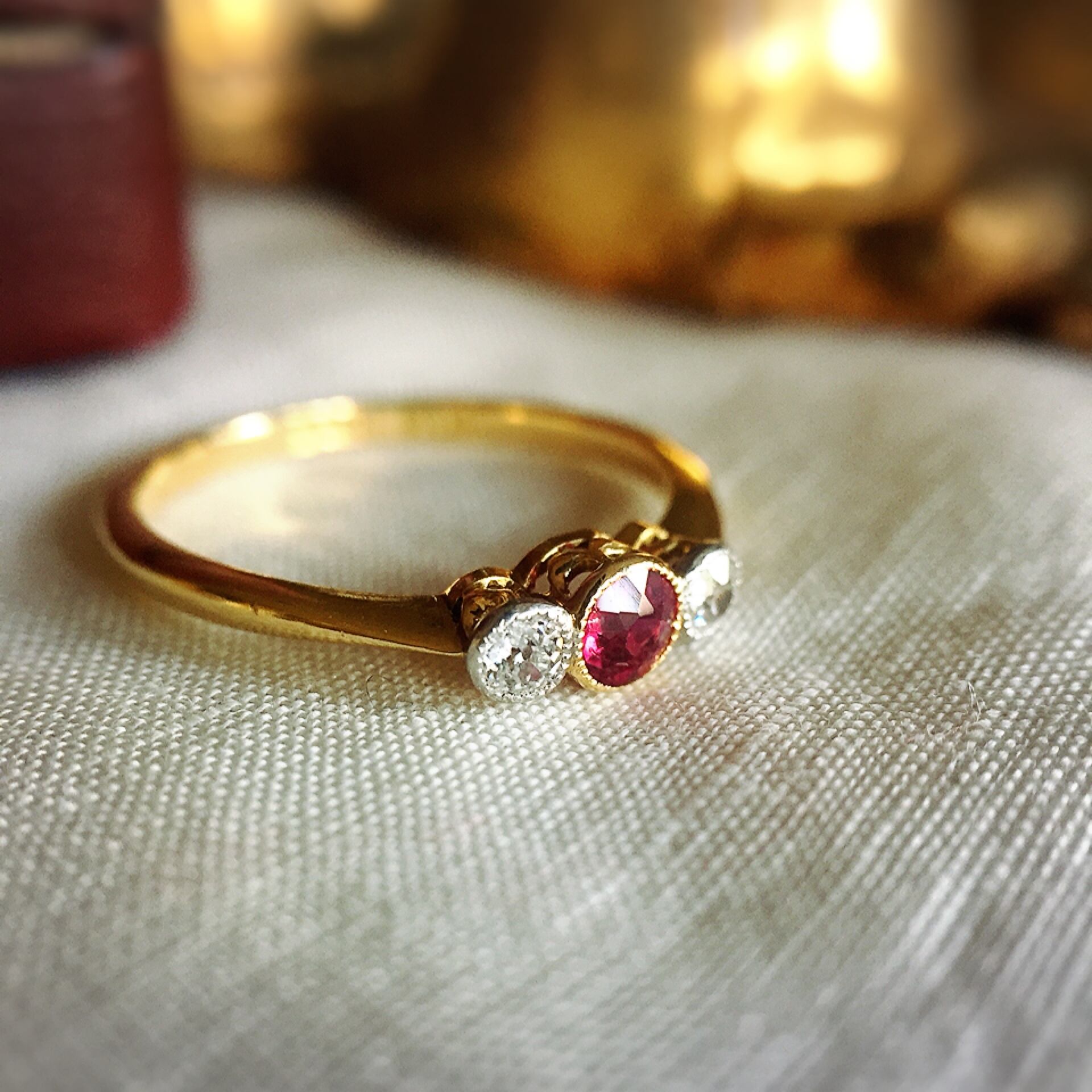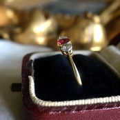 オールドヨーロピアンカットされたアンティークの柔らかな輝きを放つダイヤモンドとフランボワーズを思わせるルビーはダイヤモンドの輝きに負けない深紅の上質な輝きを放ち、パッと華やかに明るい雰囲気にしてくれるリングです。