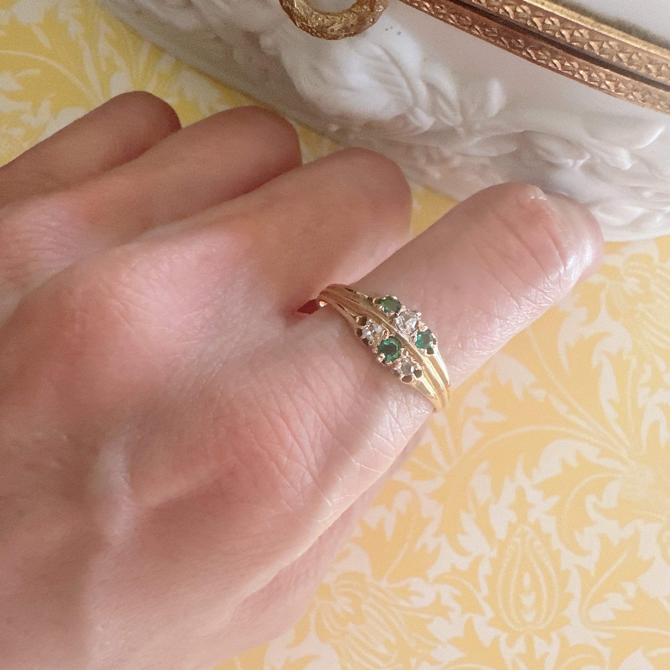 アンティークジュエリーの世界において、このデザインのリングはルビーやサファイアで作られたものを見かけることはあるものの、エメラルドを用いたものは非常に珍しい存在です。