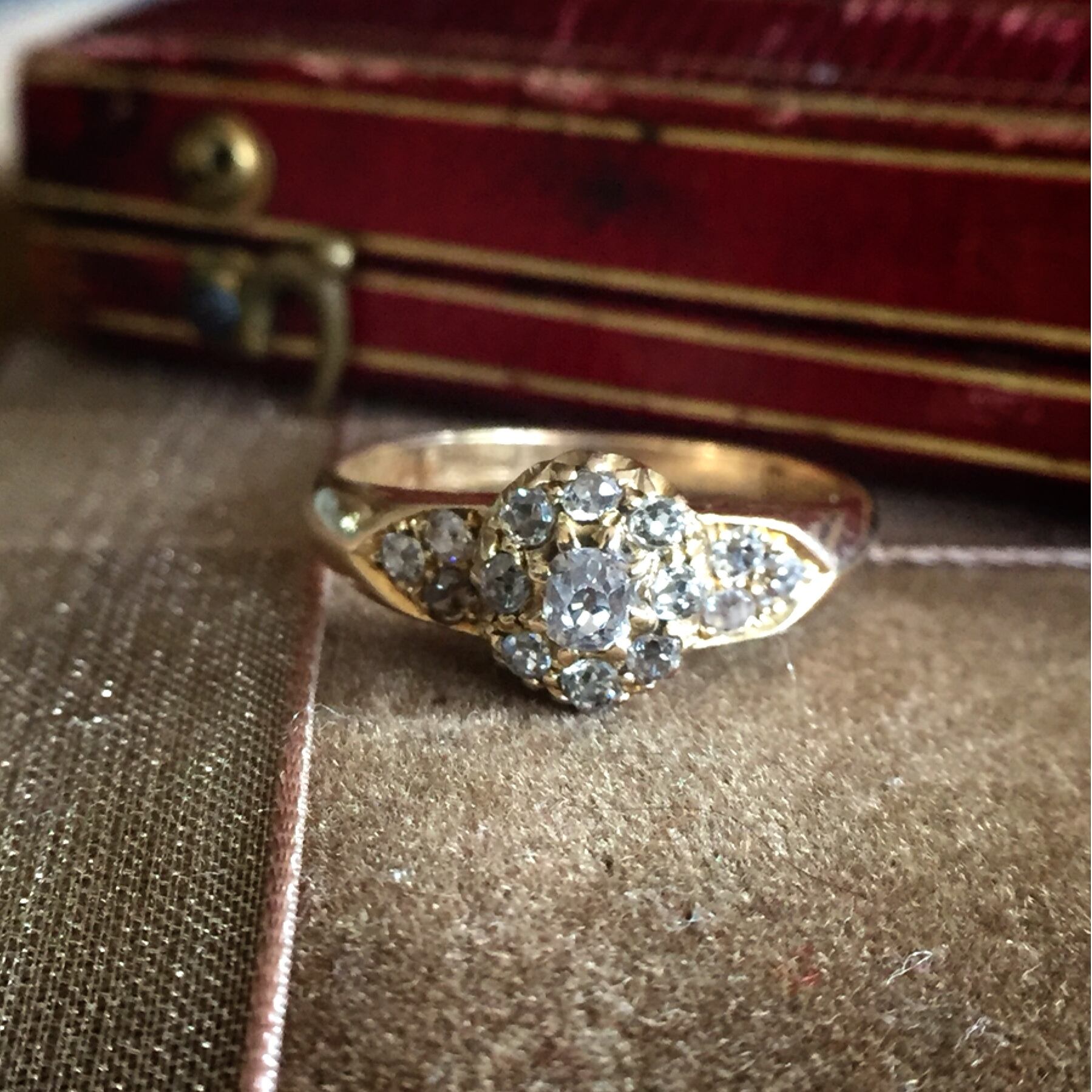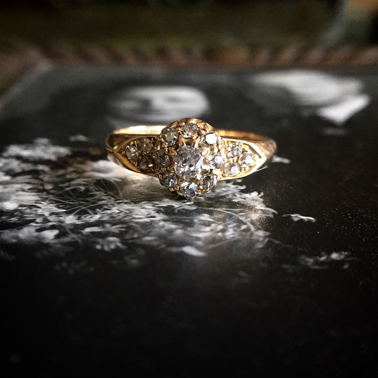 夜空にキラキラと輝く星のようなリングは中心にまるで一番星のように光るオールドマインカットダイヤモンドがセットされ、それを取り囲むように星屑のようなダイヤモンドが響き合うクラスターリングです。