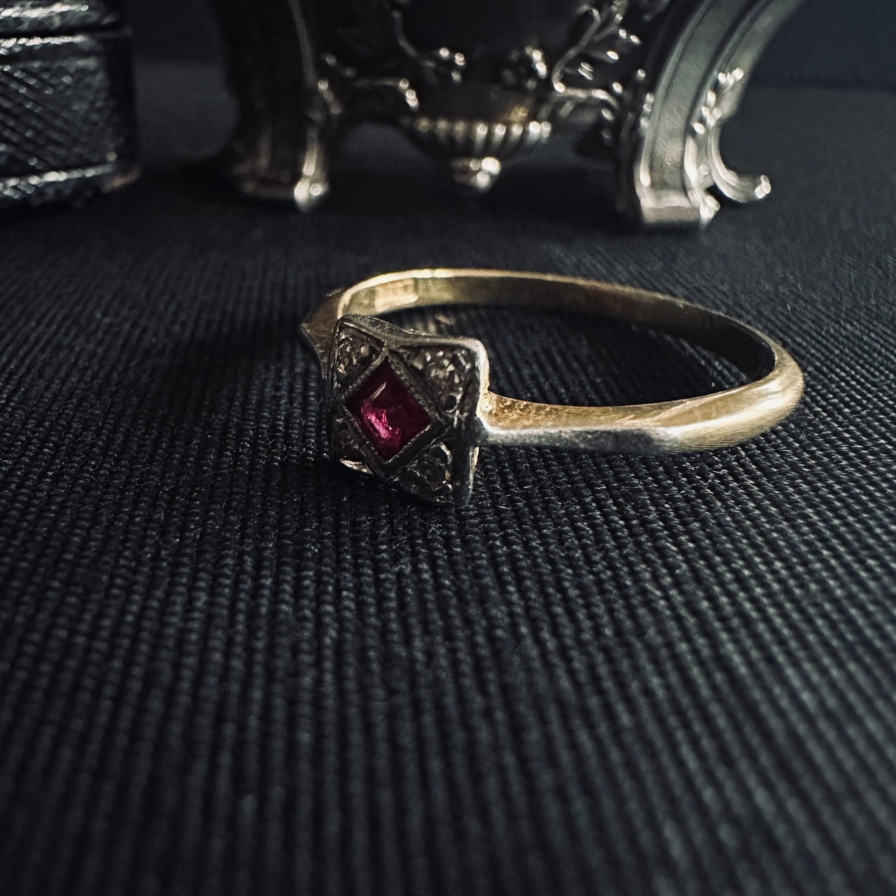 中央に配されたルビーは、スクエアの台座に対してあえてひし形にセッティングされ、そのわずかな角度の違いが生み出す視覚的なインパクトが美しいアールデコリング。