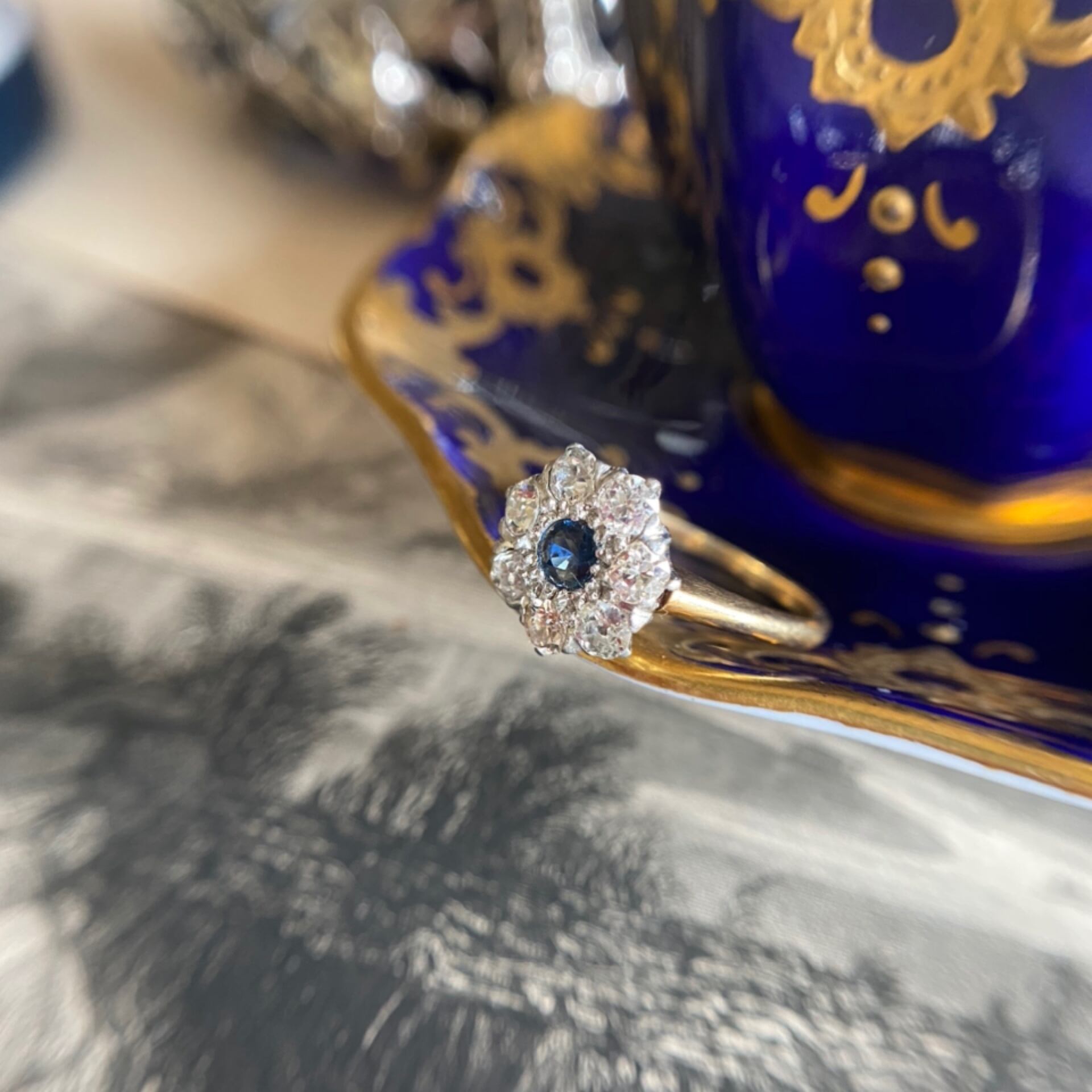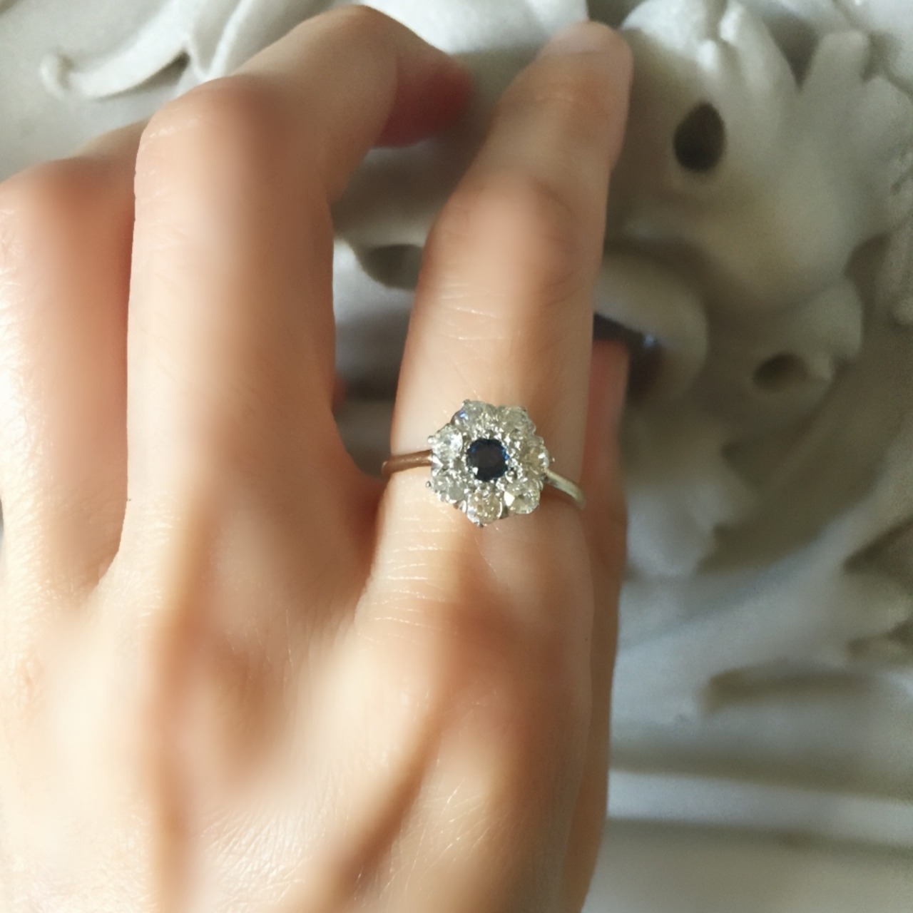 キリリとかしこまった雰囲気が漂う正統派のサファイアのクラスターリングと少し違い、フラワーシェープのクラスターリングはどちらかと言うと愛らしさがギュッ詰まっている為、デニムなどのカジュアルな装いにも合わせたくなるような軽やかさと爽やかさがあります。