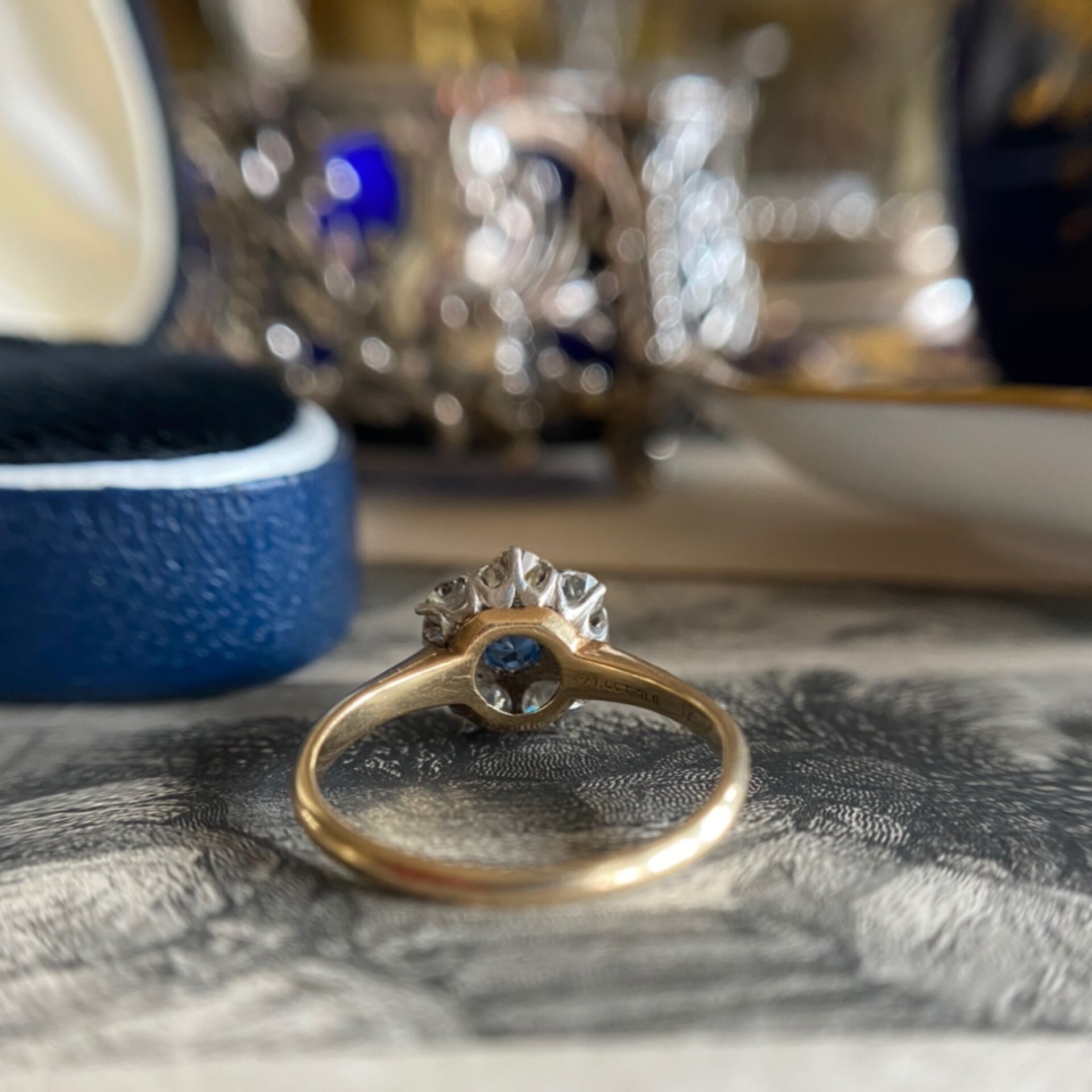 センターにきれいなブルーサファイアを飾った、花形の指輪。健気で可憐に咲く野の花を思わせます。