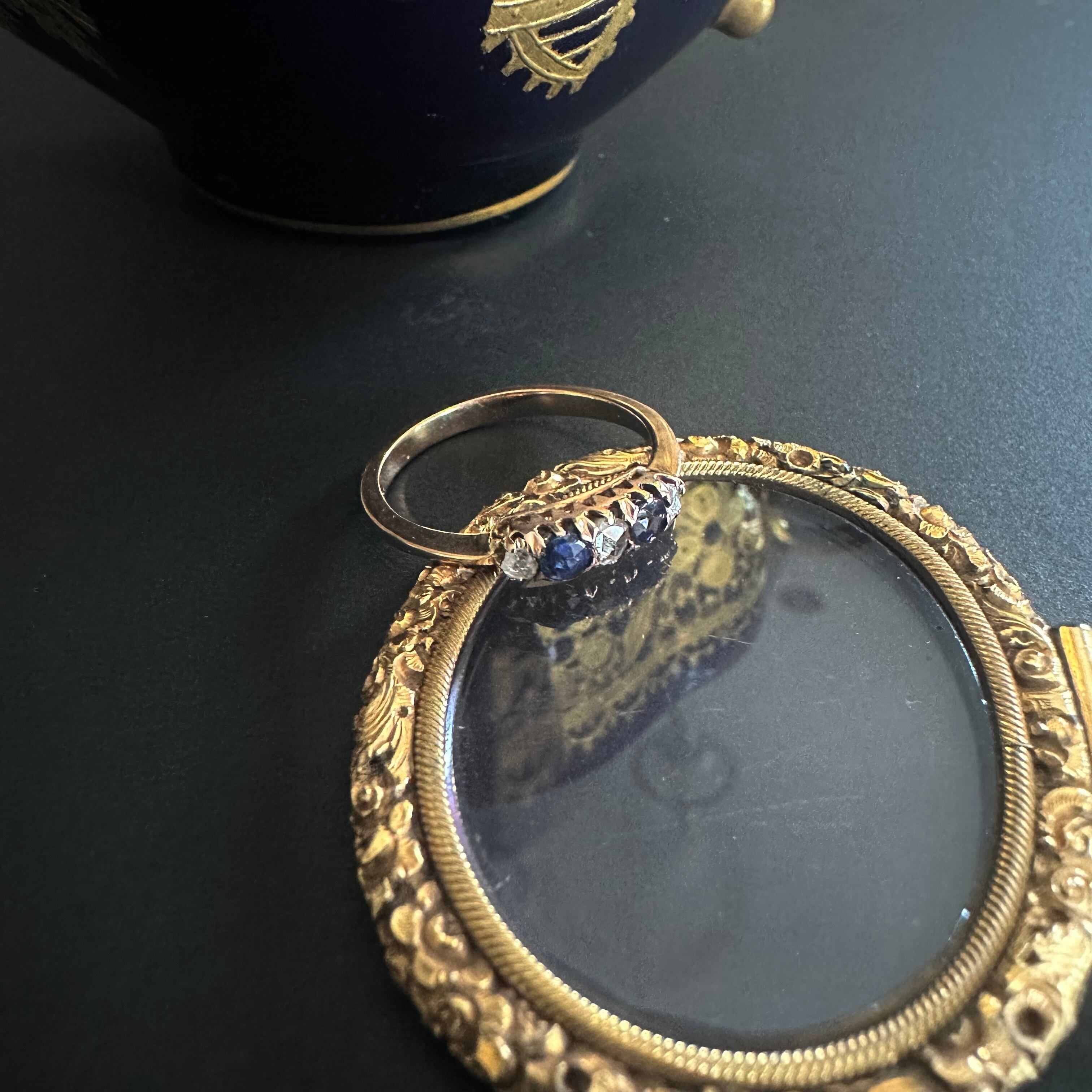 ローズカット特有の、面で反射するやわらかな煌めきが、サファイアの青をやさしく引き立て、時を経たジュエリーならではの落ち着きと味わいを添えています。