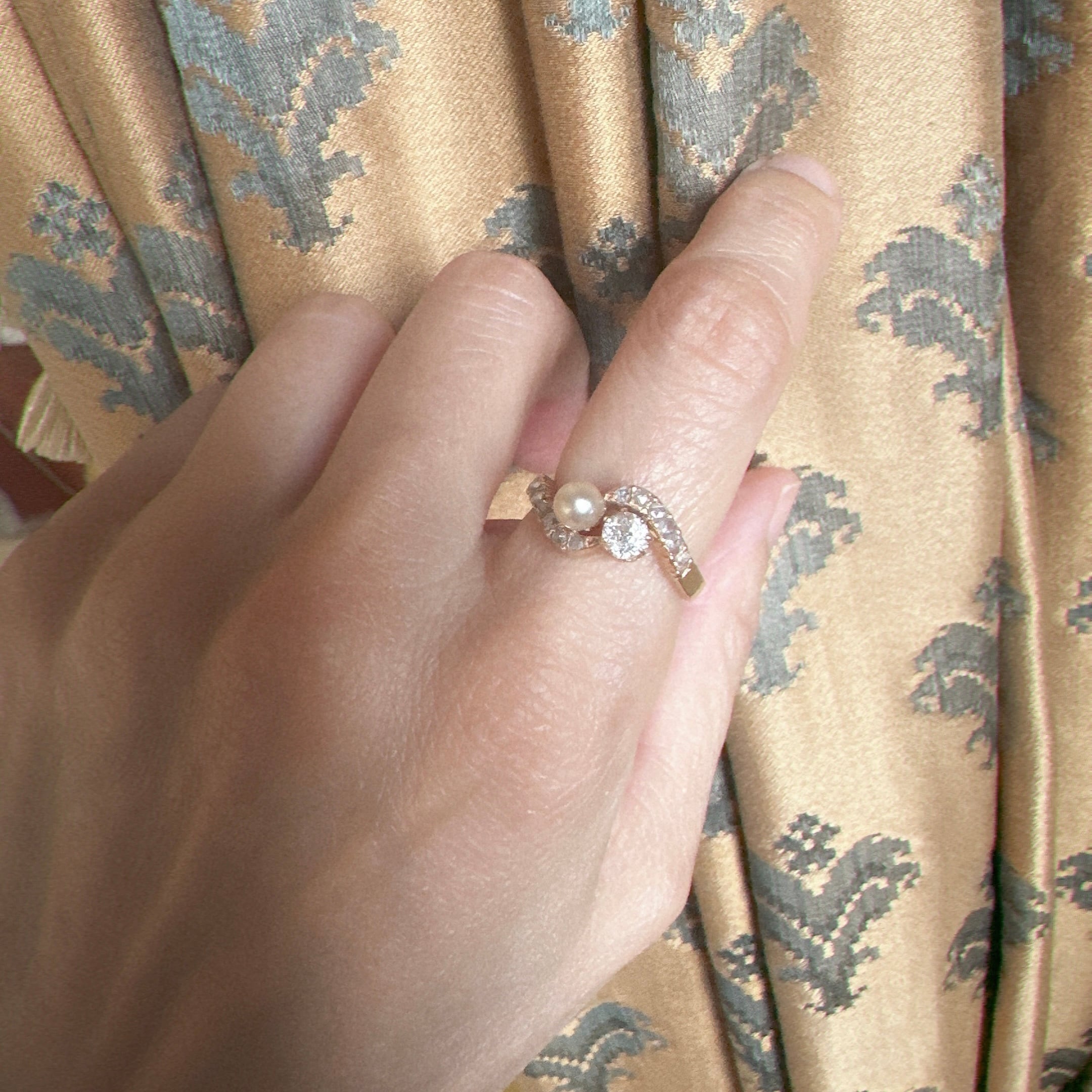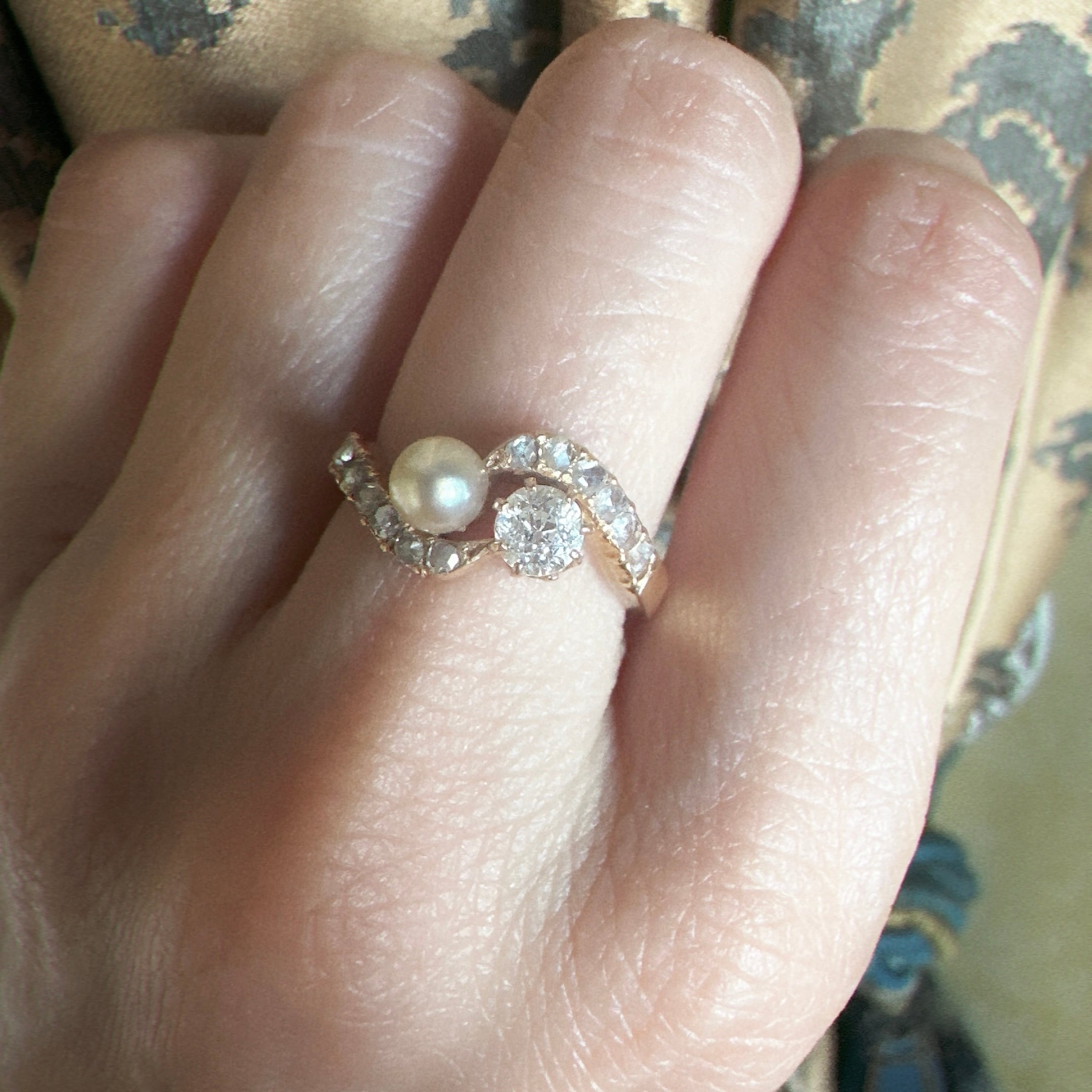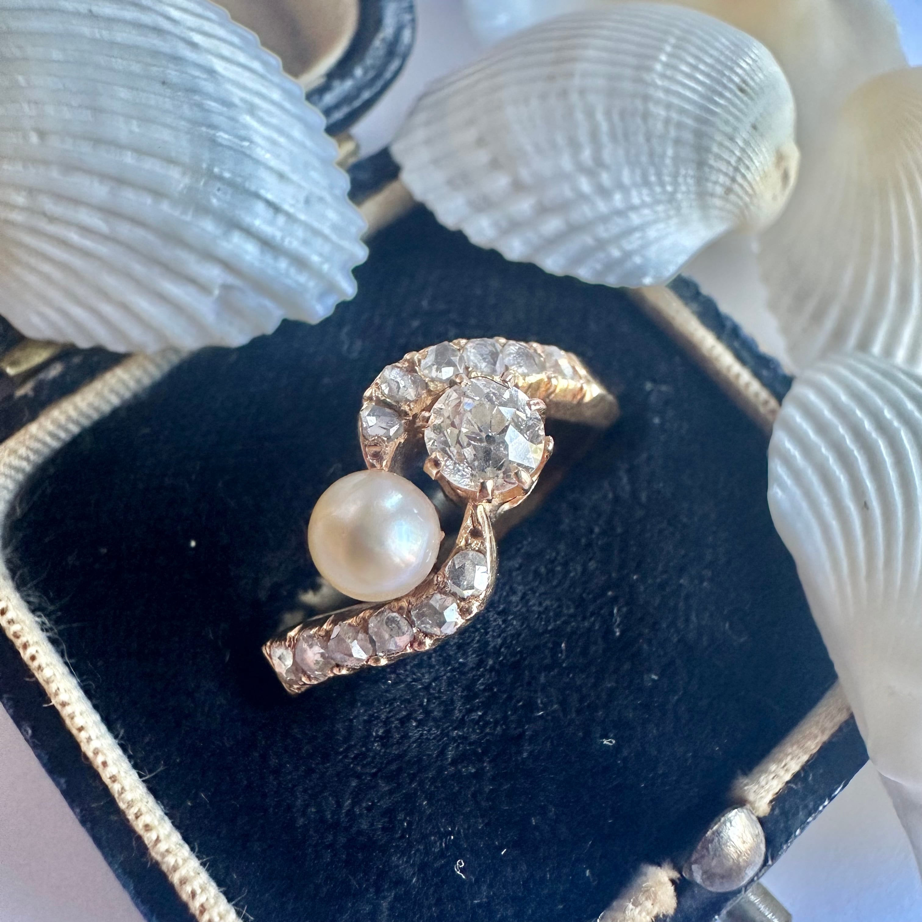トワエモア(toi et moi)のナチュラルパール&オールドヨーロピアンカットダイヤモンドのクロスオーバーリング