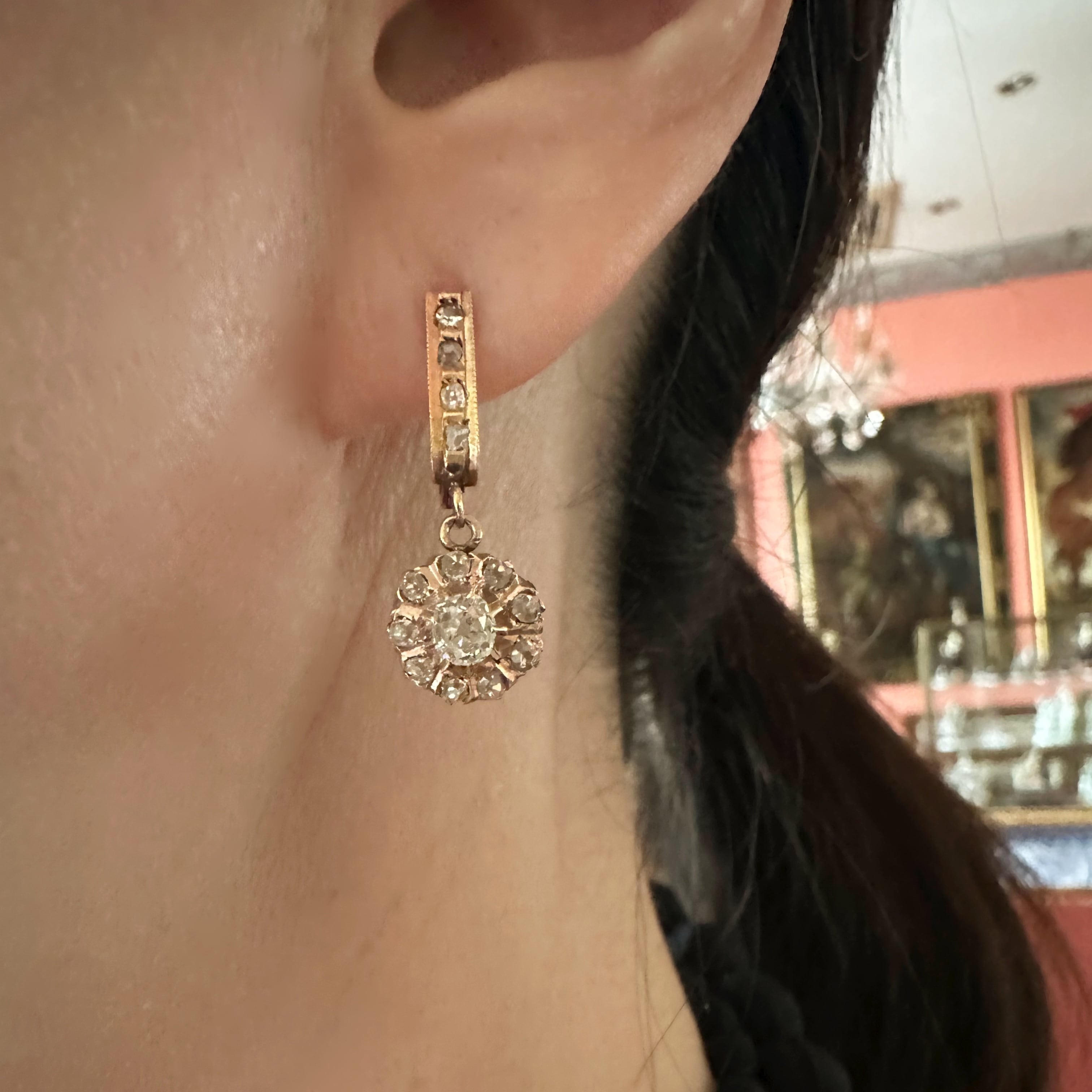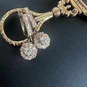 中央に厚みがたっぷりのオールドマインカットダイヤモンドがひと粒、周囲の小粒のオールドマインカットダイヤモンドに抱かれるように輝くクラスタードロップピアスのご紹介です。