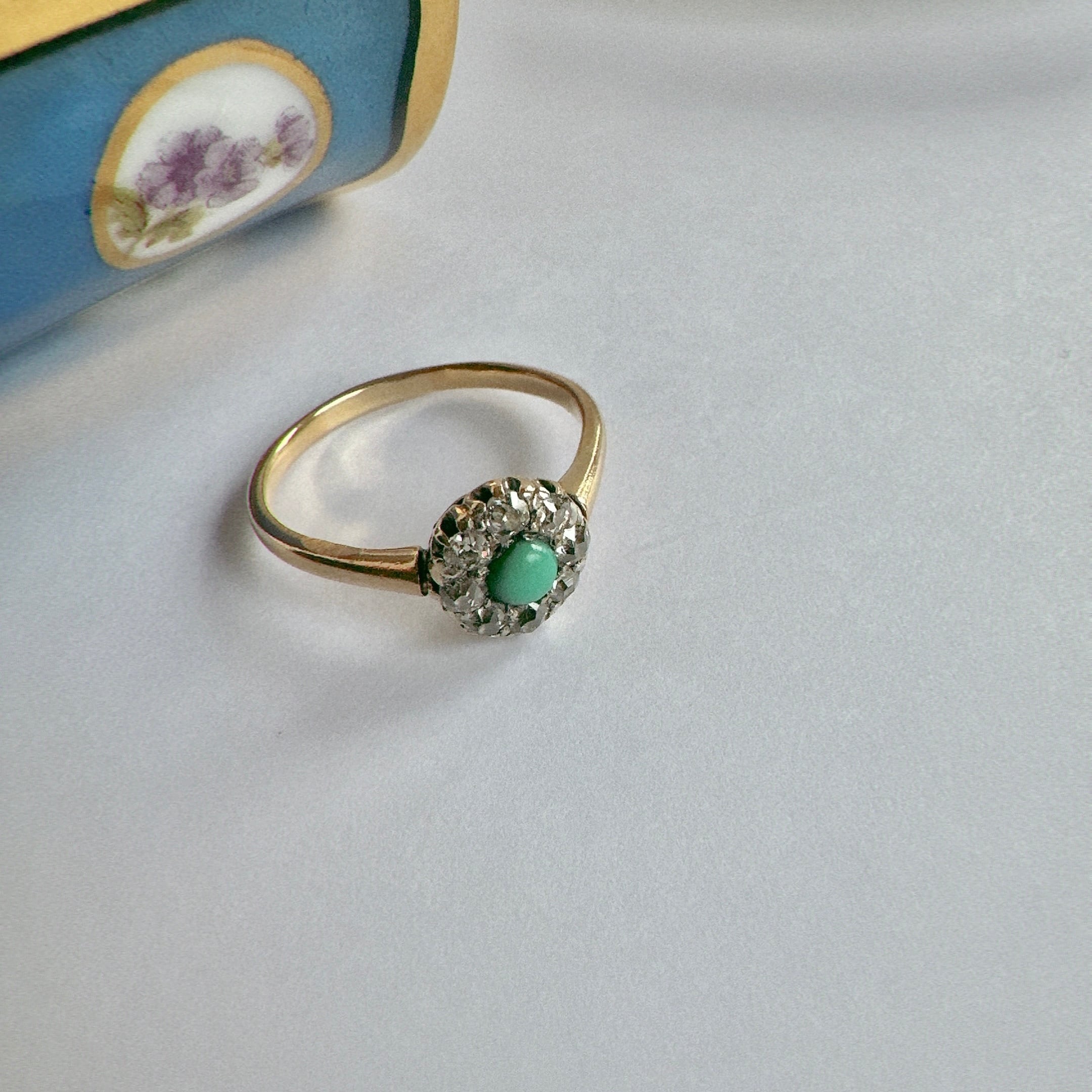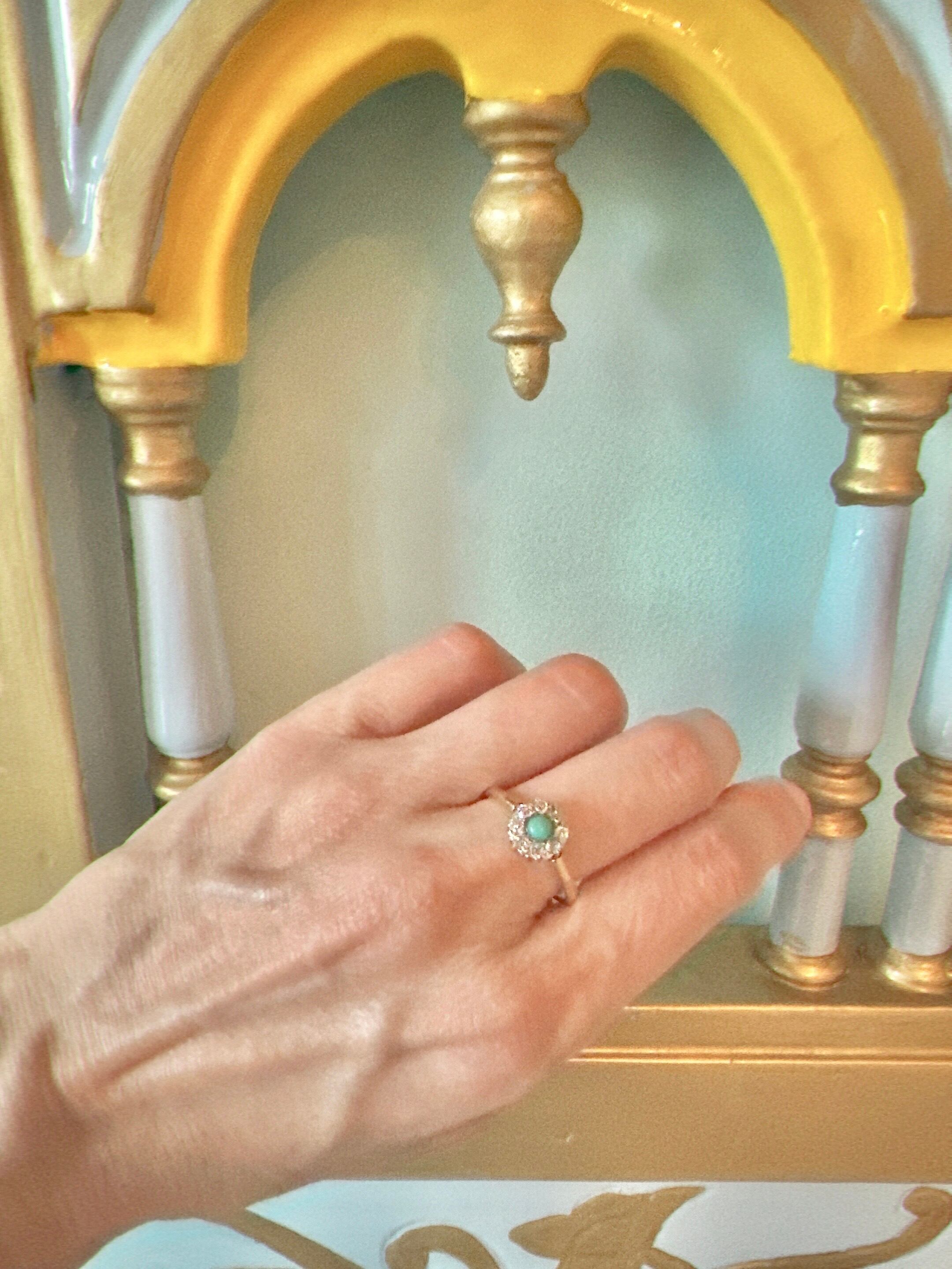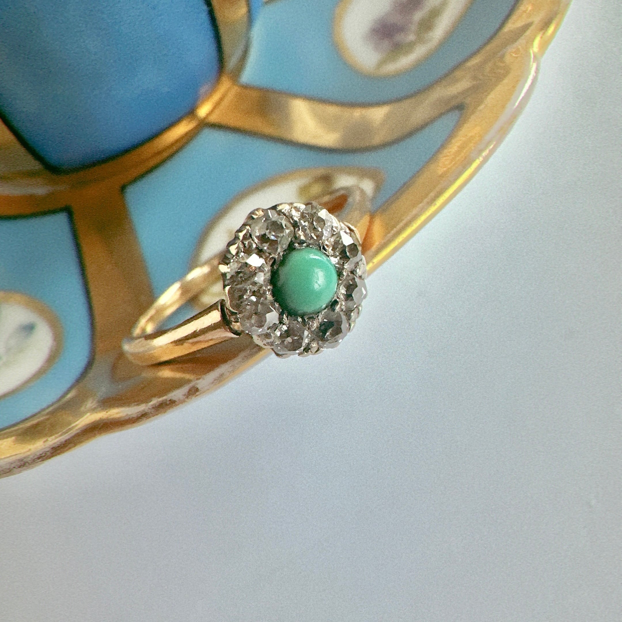 澄み切ったスカイブルーのターコイズを中央に配し、その周囲をオールドカットダイヤモンドが囲む、ヴィクトリアン期のクラスターリング。