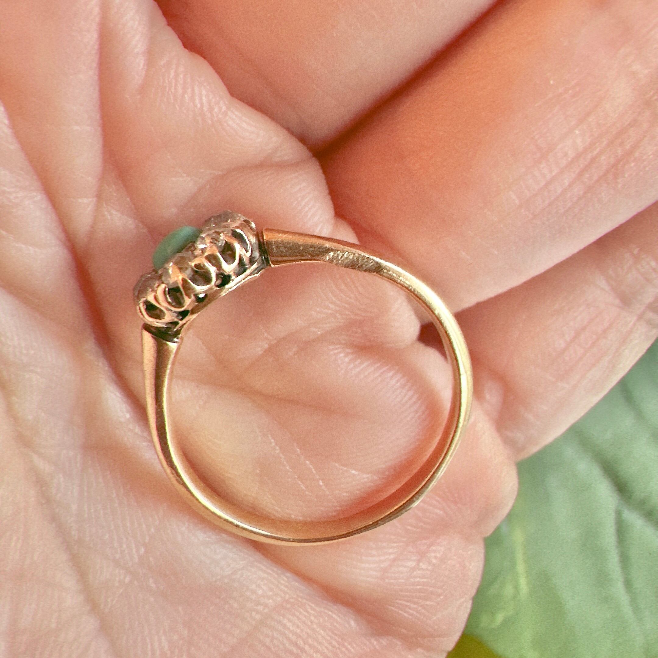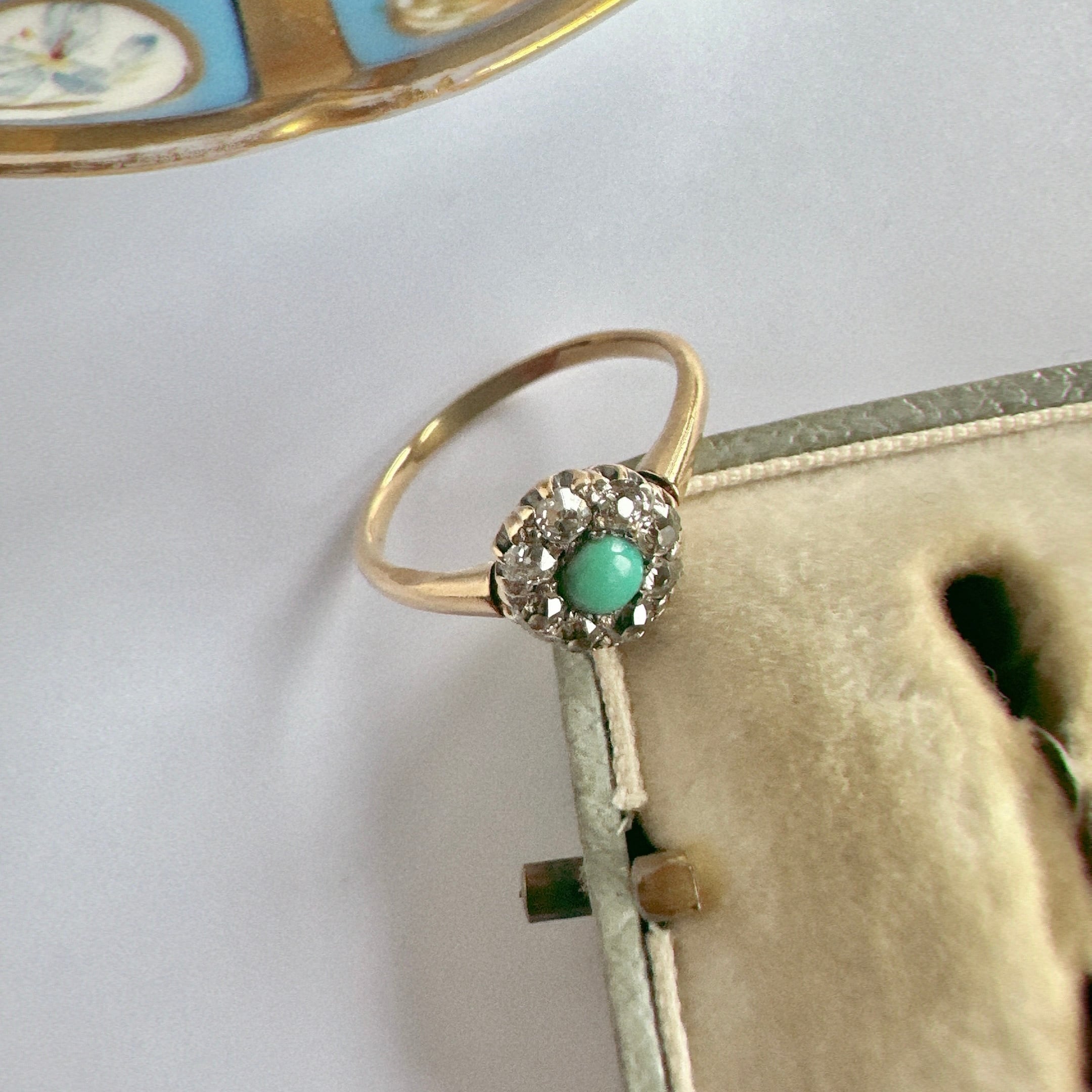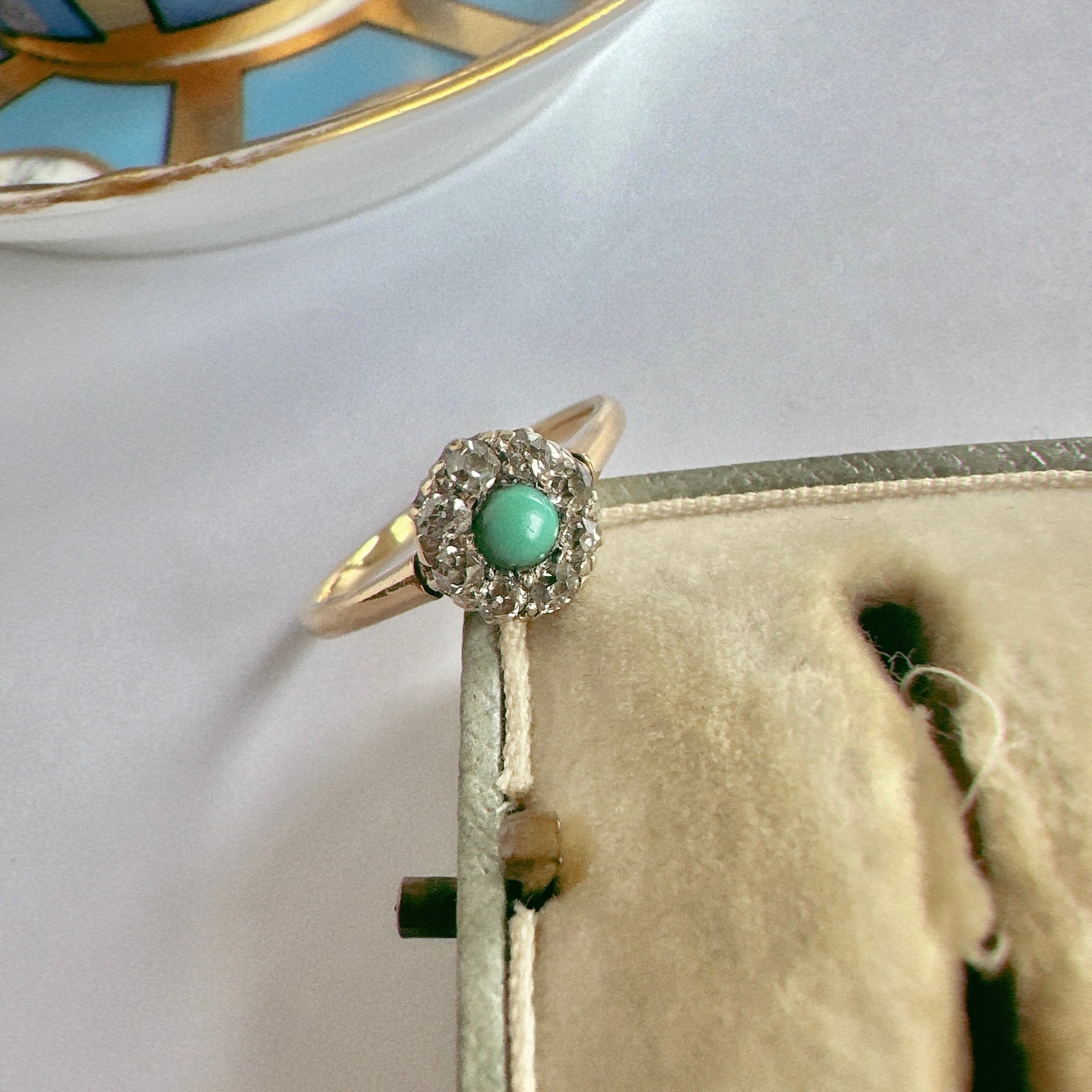 澄み切ったスカイブルーのターコイズを中央に配し、その周囲をオールドカットダイヤモンドが囲む、ヴィクトリアン期のクラスターリング。