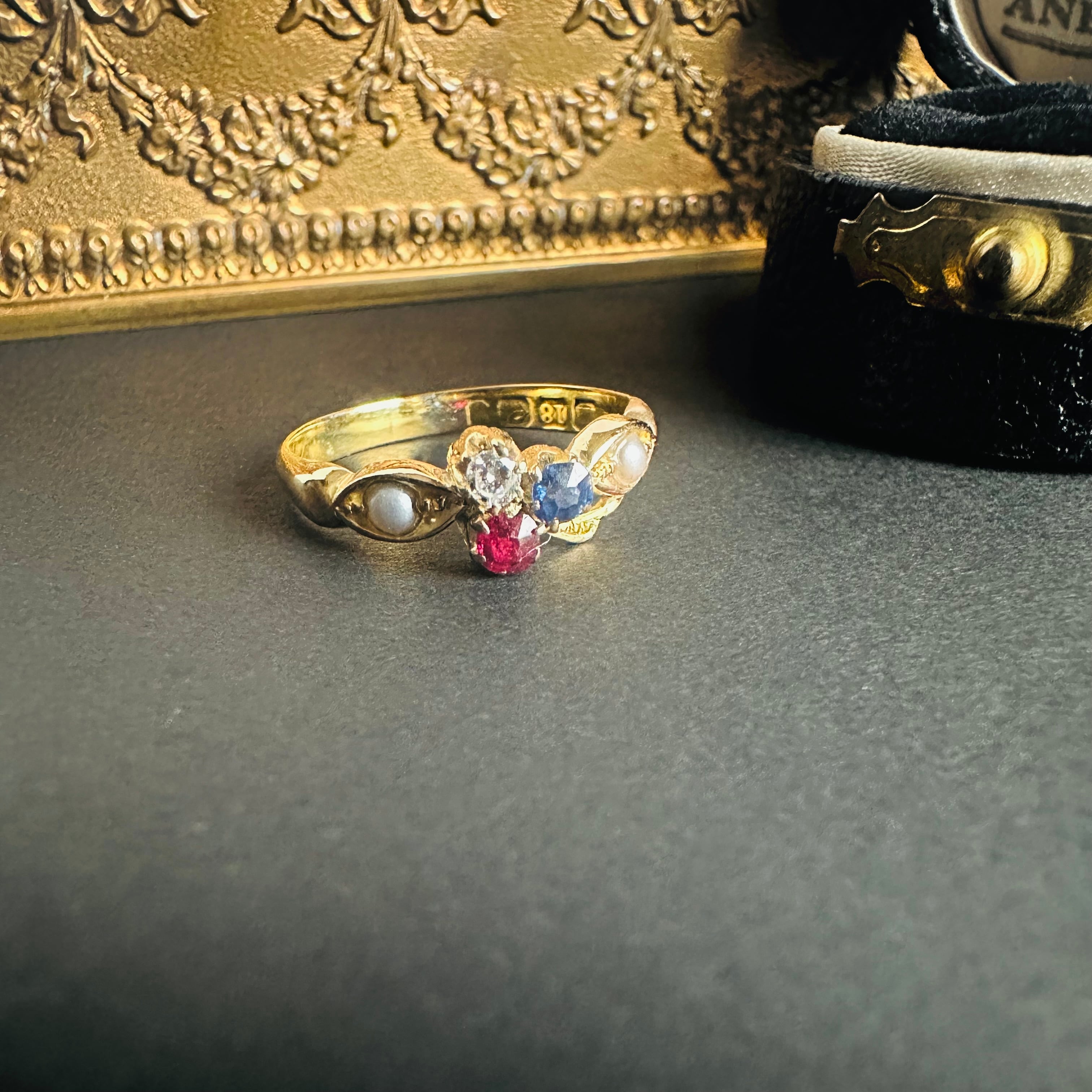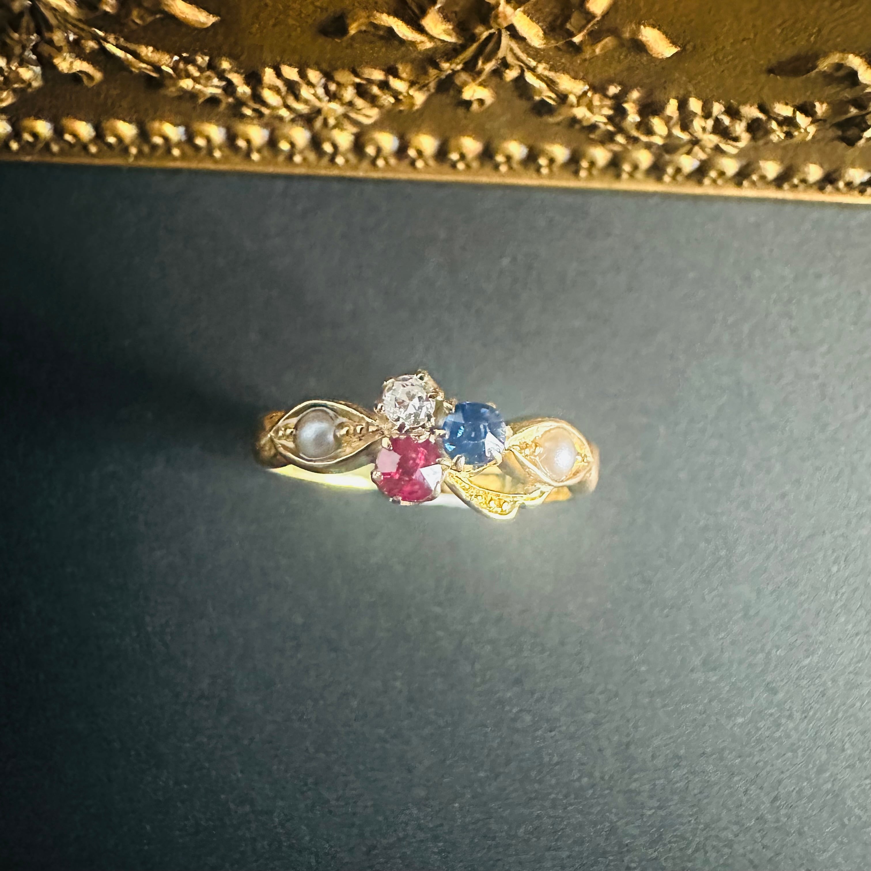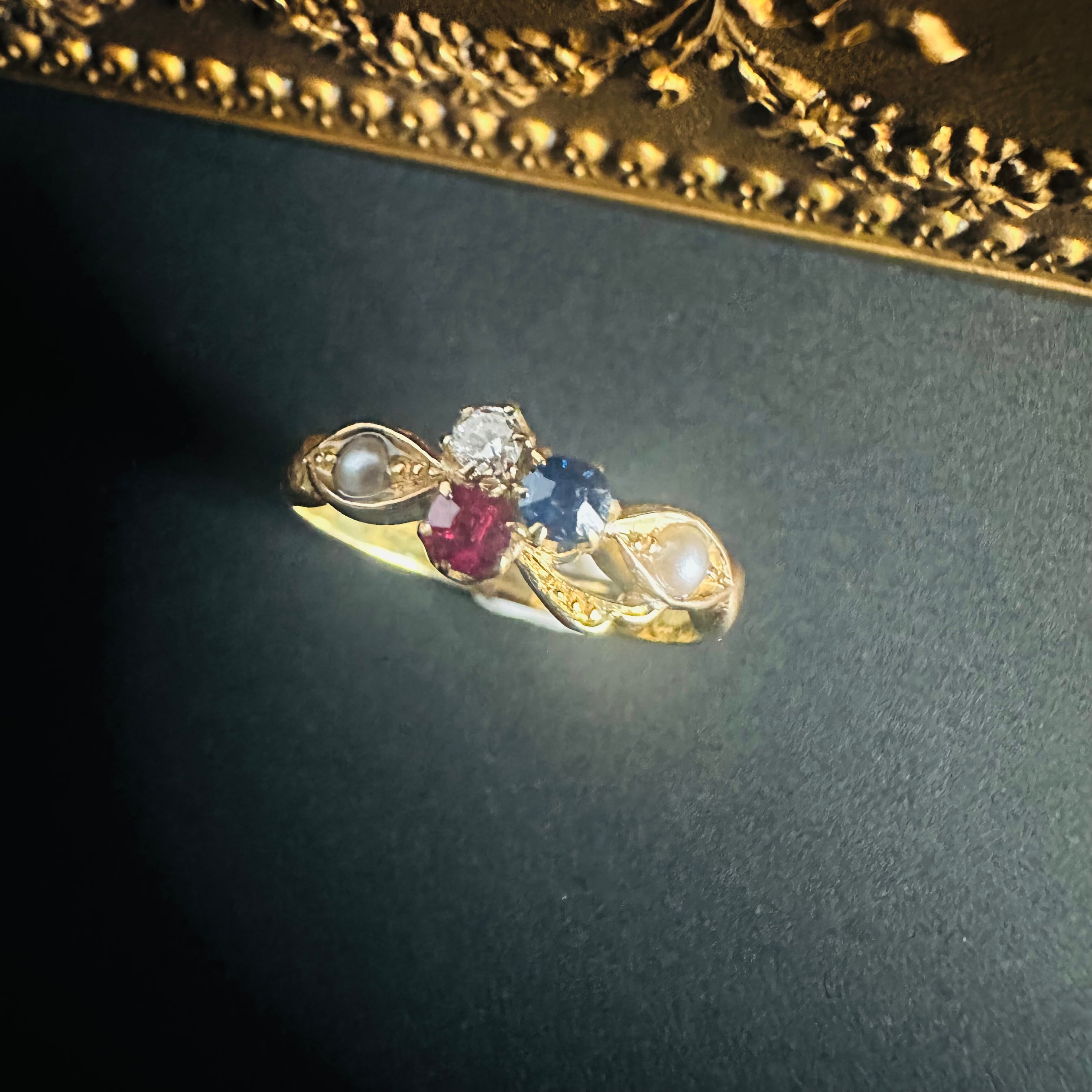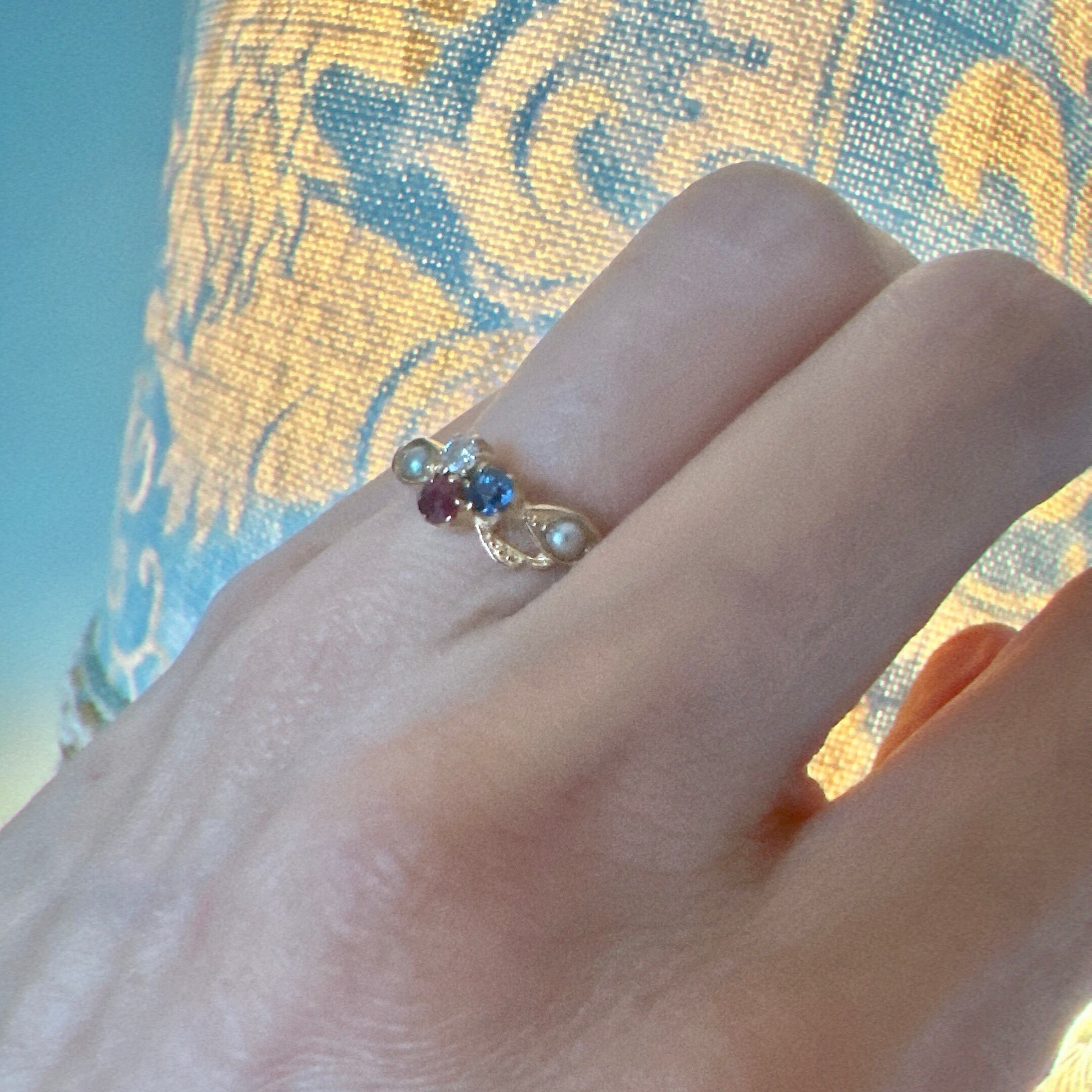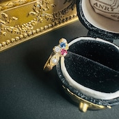 小さな三つ葉-シャムロックを象ったトリコロールカラーが目を惹くアンティークリングです。
