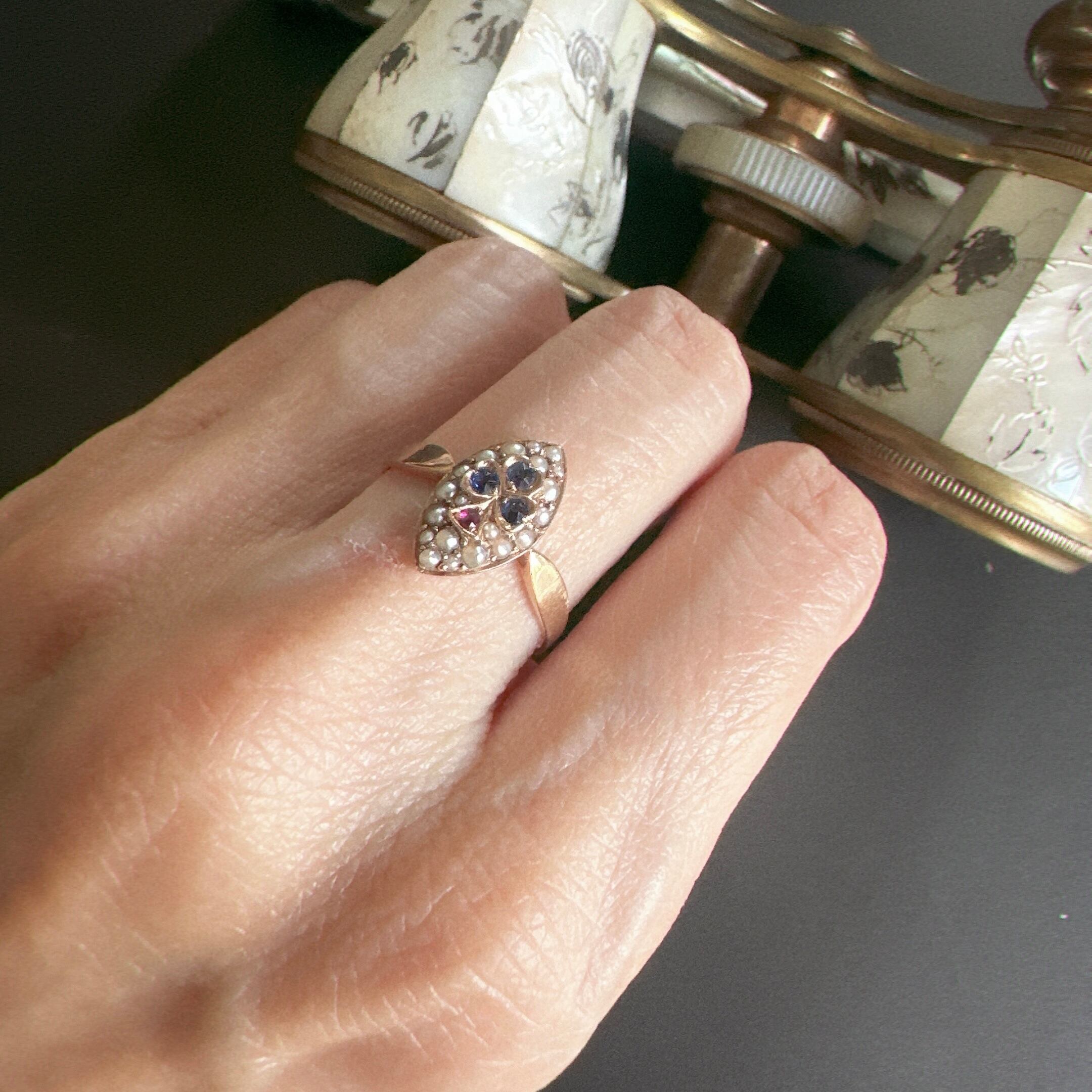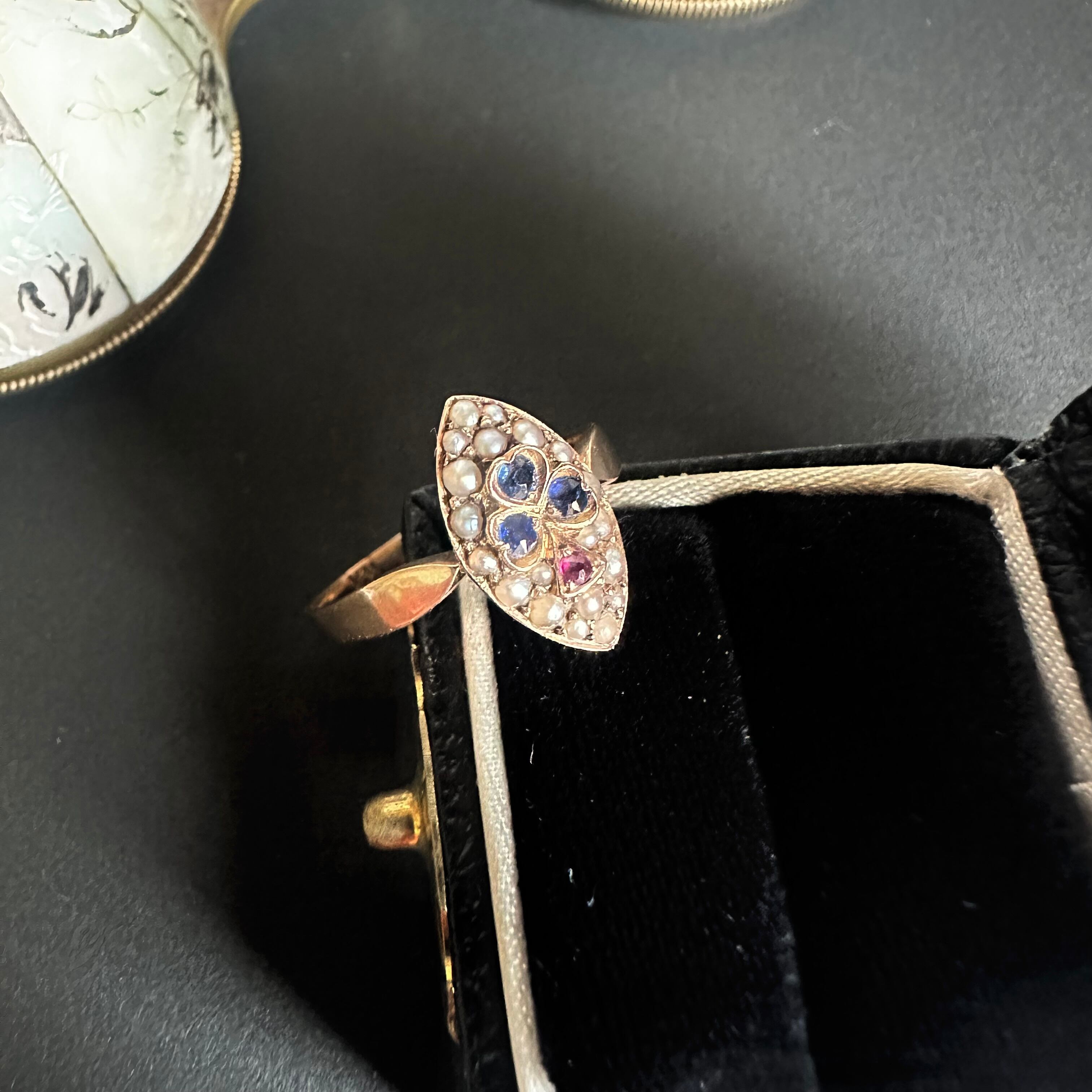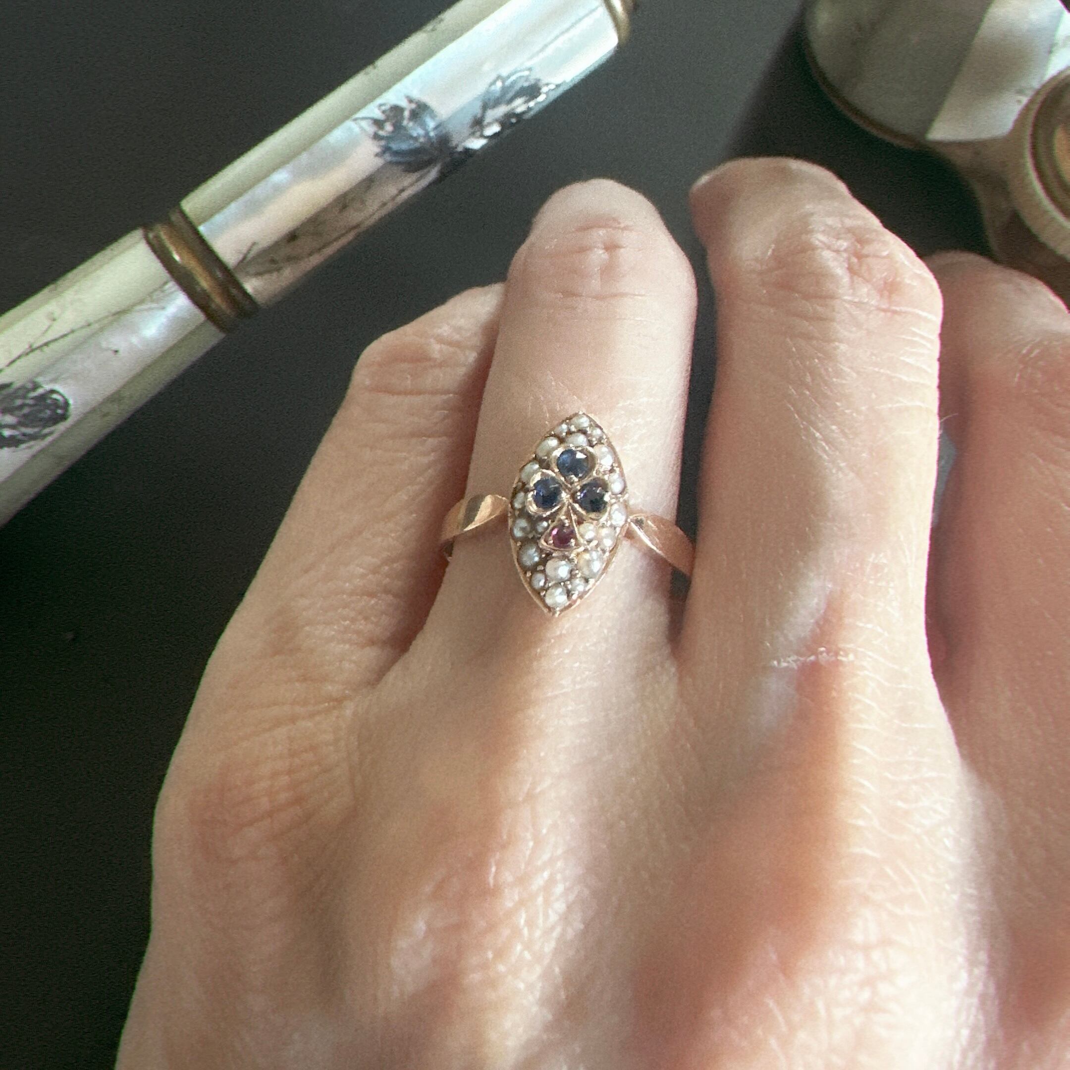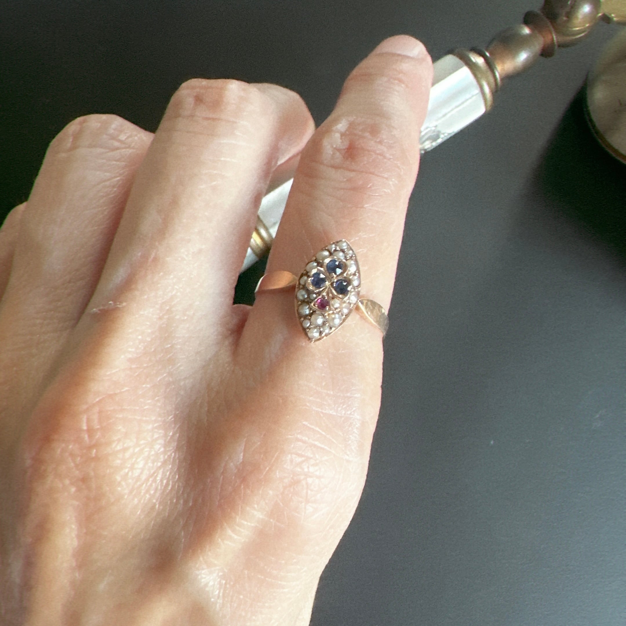 サファイアもルビーも決して大粒ではなく、ハーフパールも不揃い。ブランドの刻印があるわけでもありません。けれど、だからこそ、このリングはひときわ愛おしいのです。