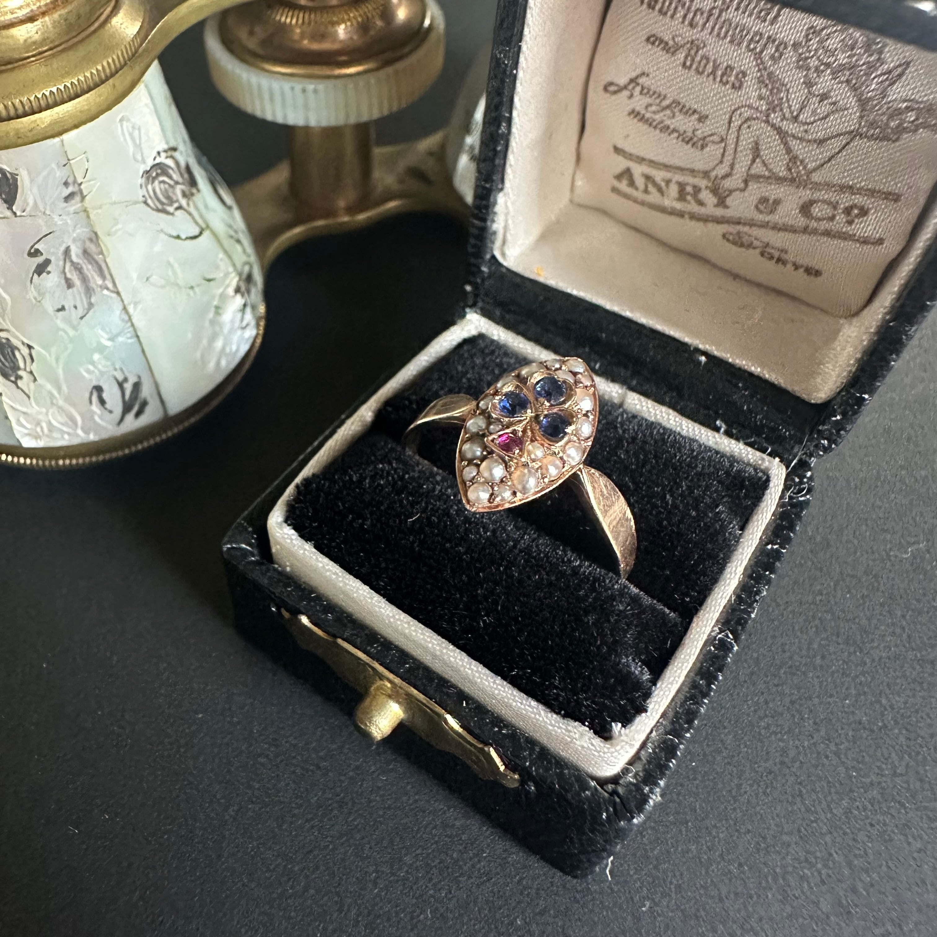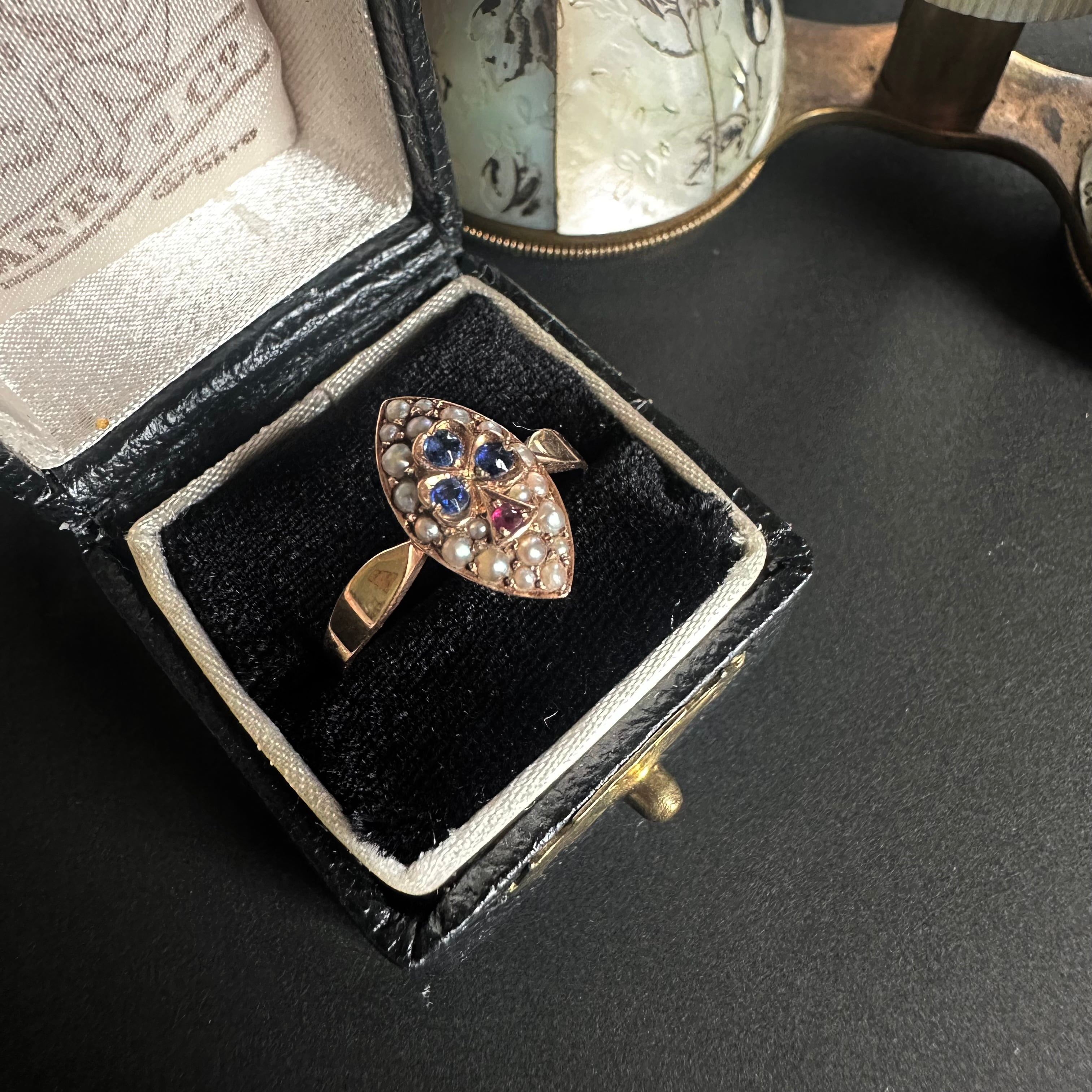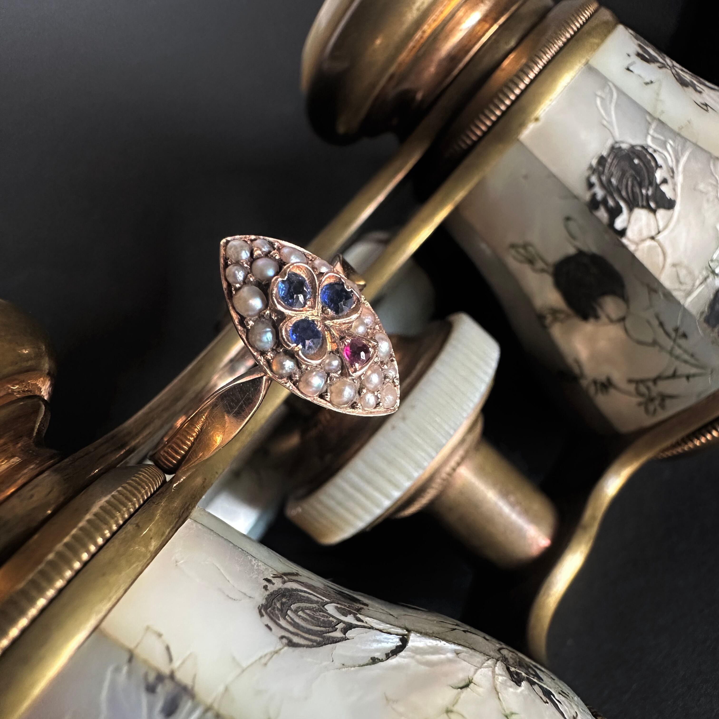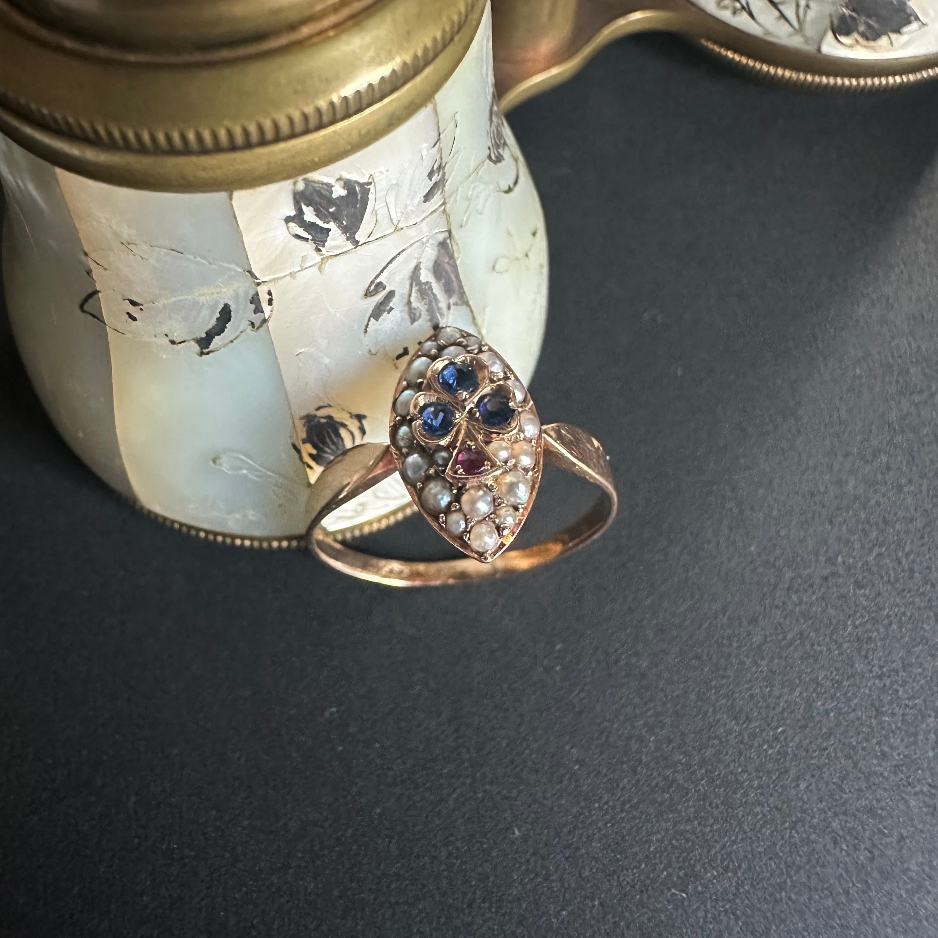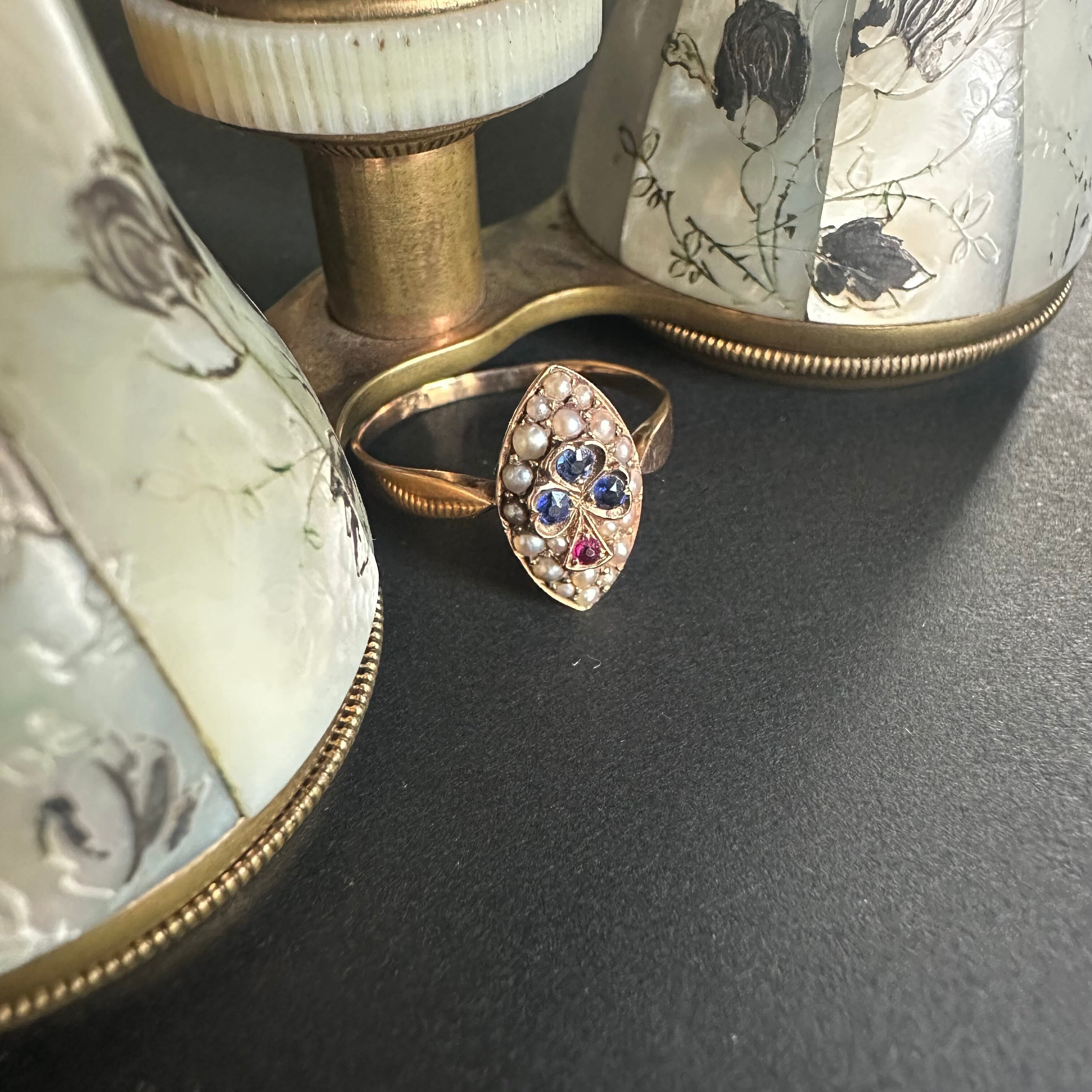 サファイアもルビーも決して大粒ではなく、ハーフパールも不揃い。ブランドの刻印があるわけでもありません。けれど、だからこそ、このリングはひときわ愛おしいのです。