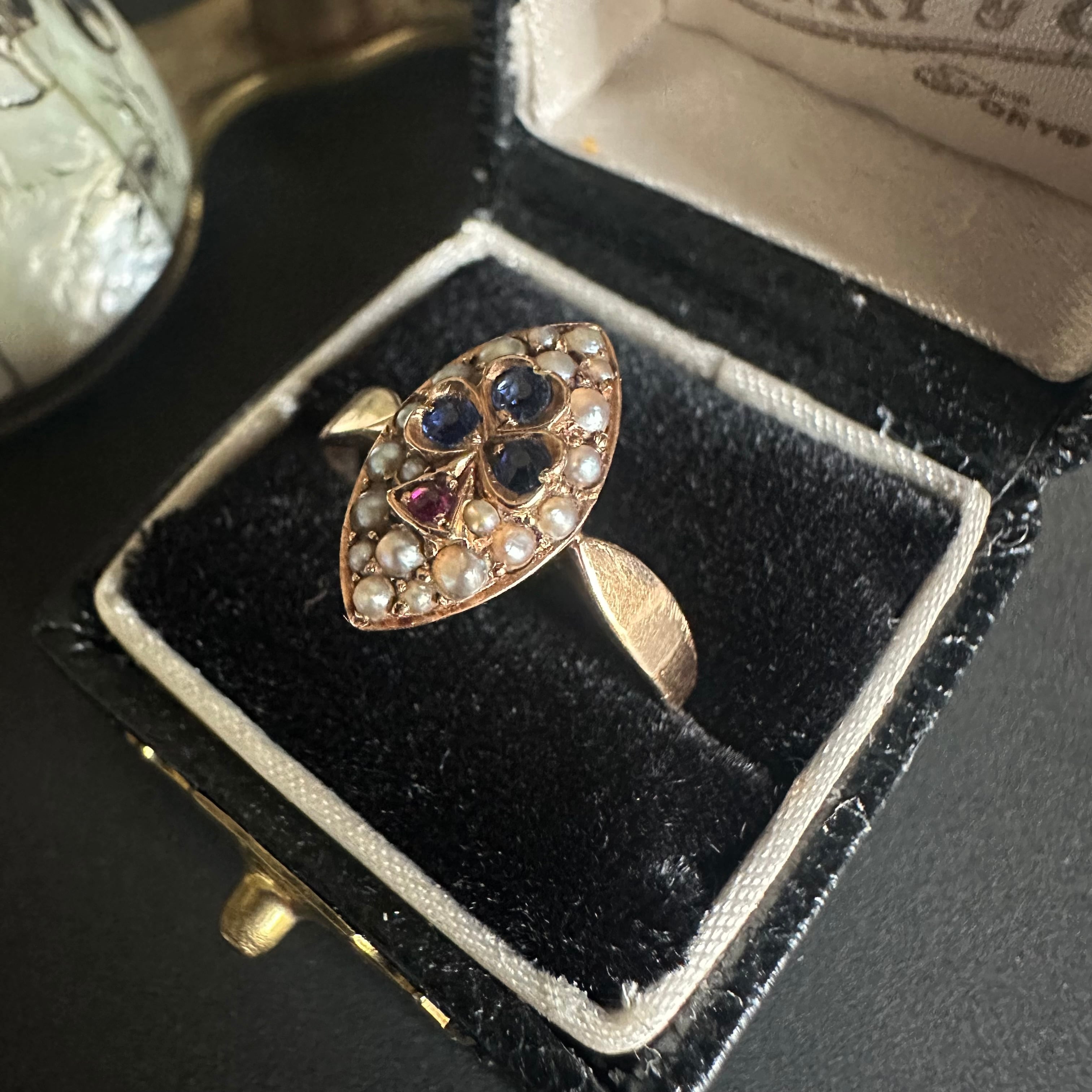小さな宝石たちが寄り添い合い、三つ葉のシャムロックを描き出すその姿は、価値を数字や名前だけで測るのではなく、物語や温もりで感じる、アンティークジュエリーならではの魅力が、ぎゅっと詰まっています。