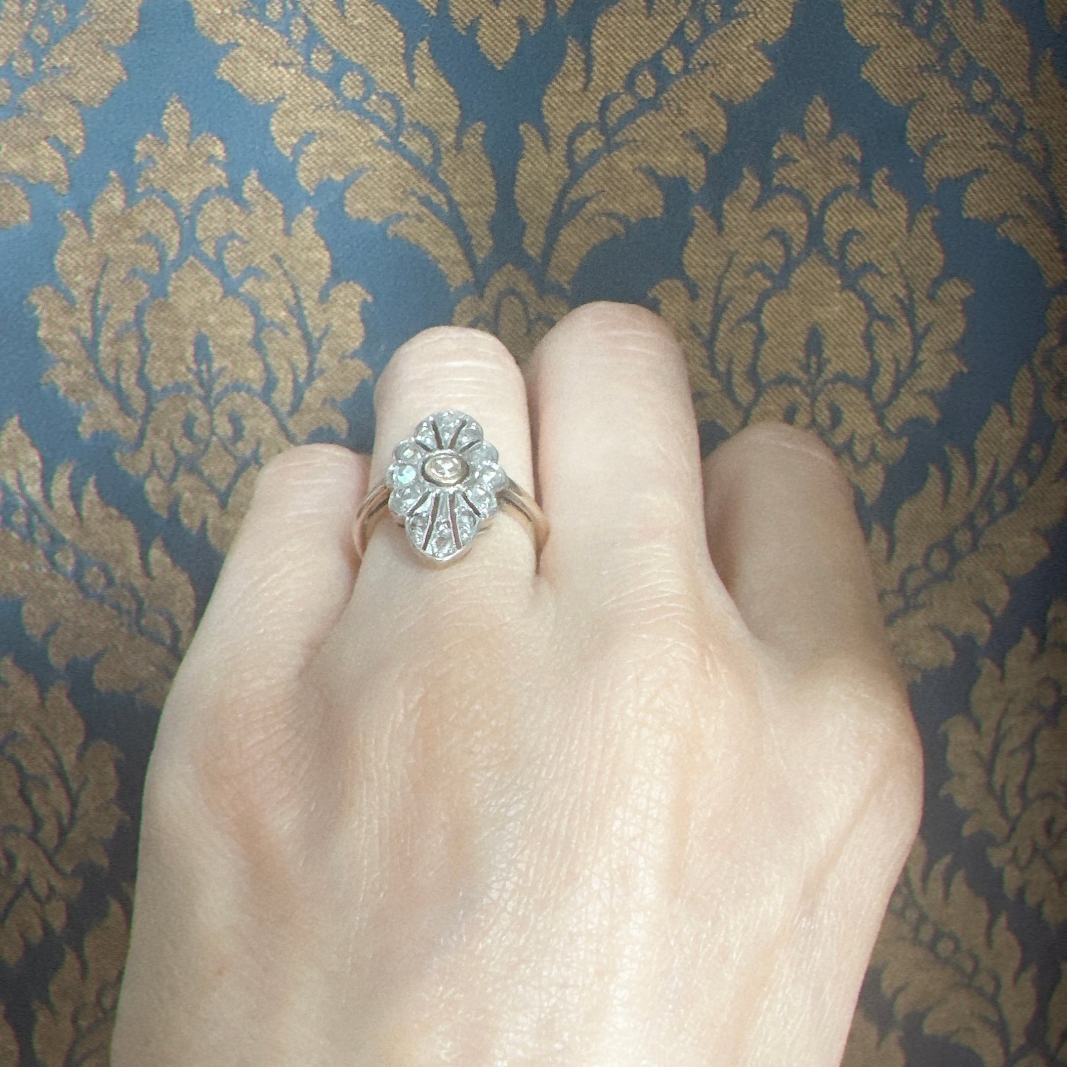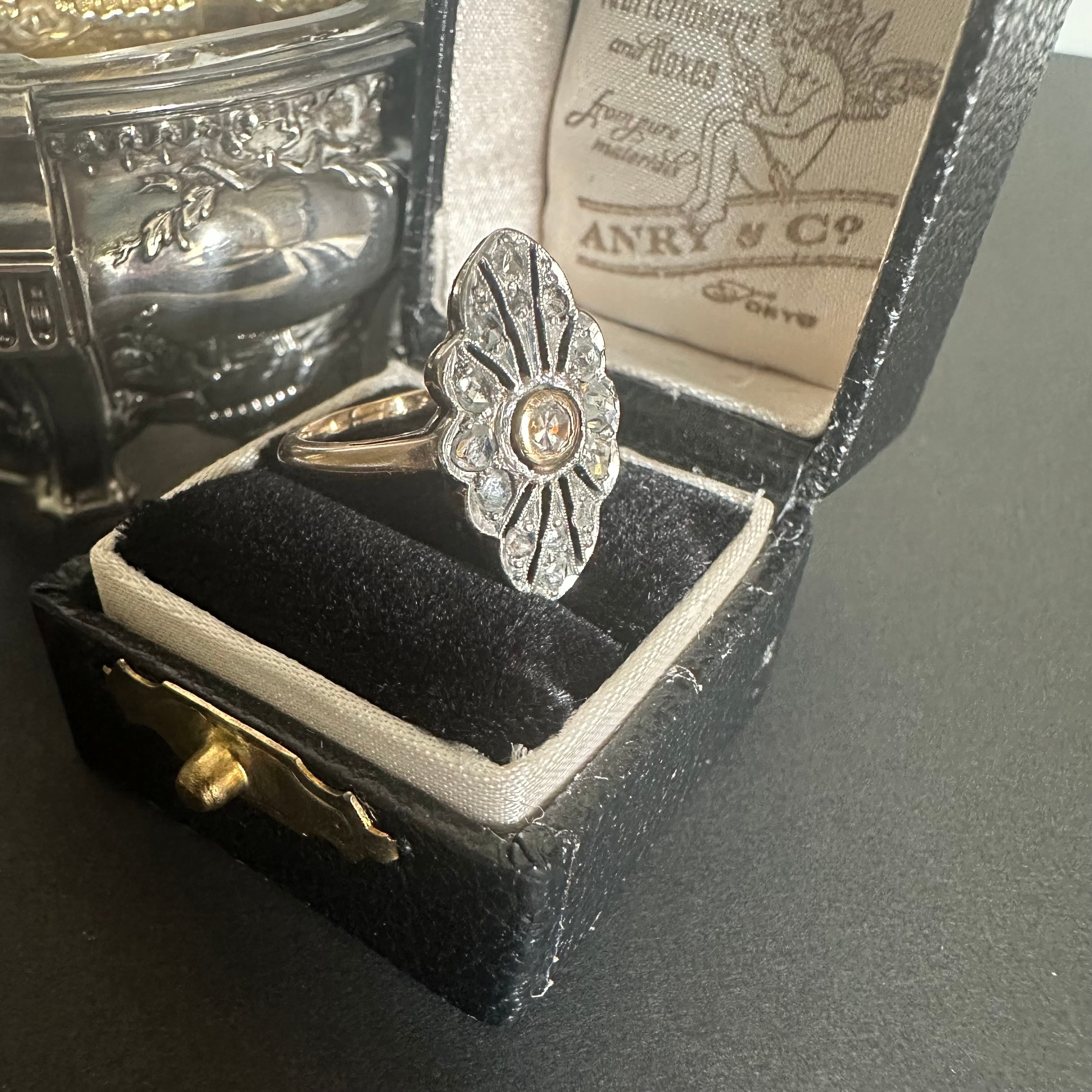 ※ 100年以上前の古いお品になりますので、経年によるアンティーク品特有の微小なスレなどルーペで見てわかる程度にございます。ダイヤモンドはルーペでのぞくと内包物はありますが、肉眼でみえるものではなく、瑞々しい輝きを楽しませてくれます。カケはございません。