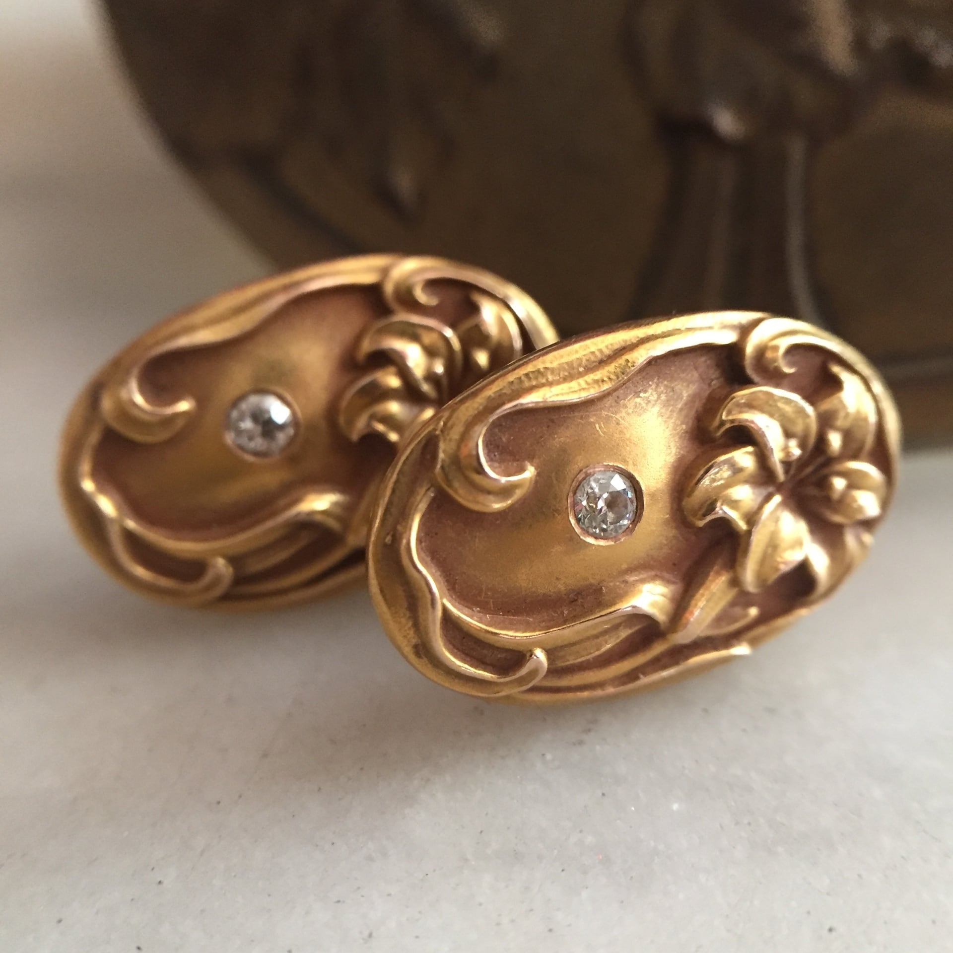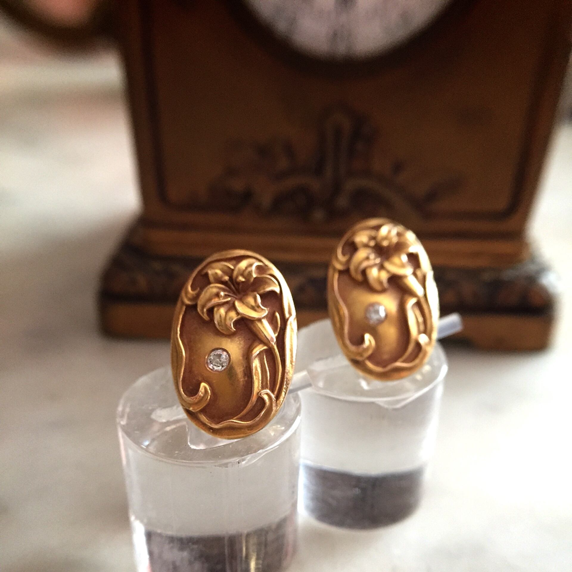アール・ヌーヴォー特有の波打つような曲線で表現された百合。そしてその下で輝くオールドヨーロピアンカットダイヤモンドがまるで聖なる星のような印象を持つ美しいイヤリングです。