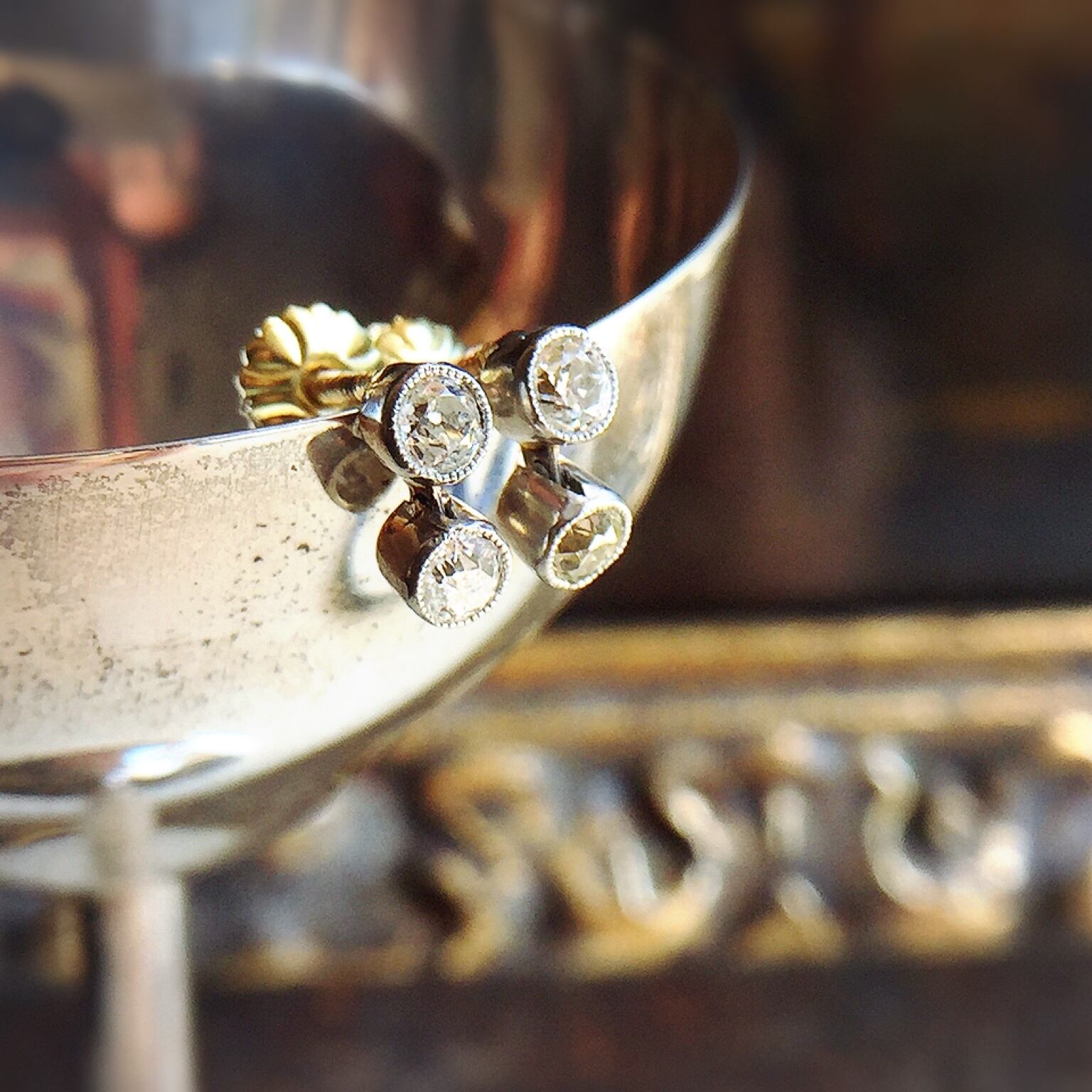 まるで朝焼けに光り輝く雪の結晶のようにチラチラと揺れる4粒のオールドマインカットダイヤモンドは厚みがあり、現代のブリリアンカットにはない、内側から発するダイヤモンドの煌きが強いです。