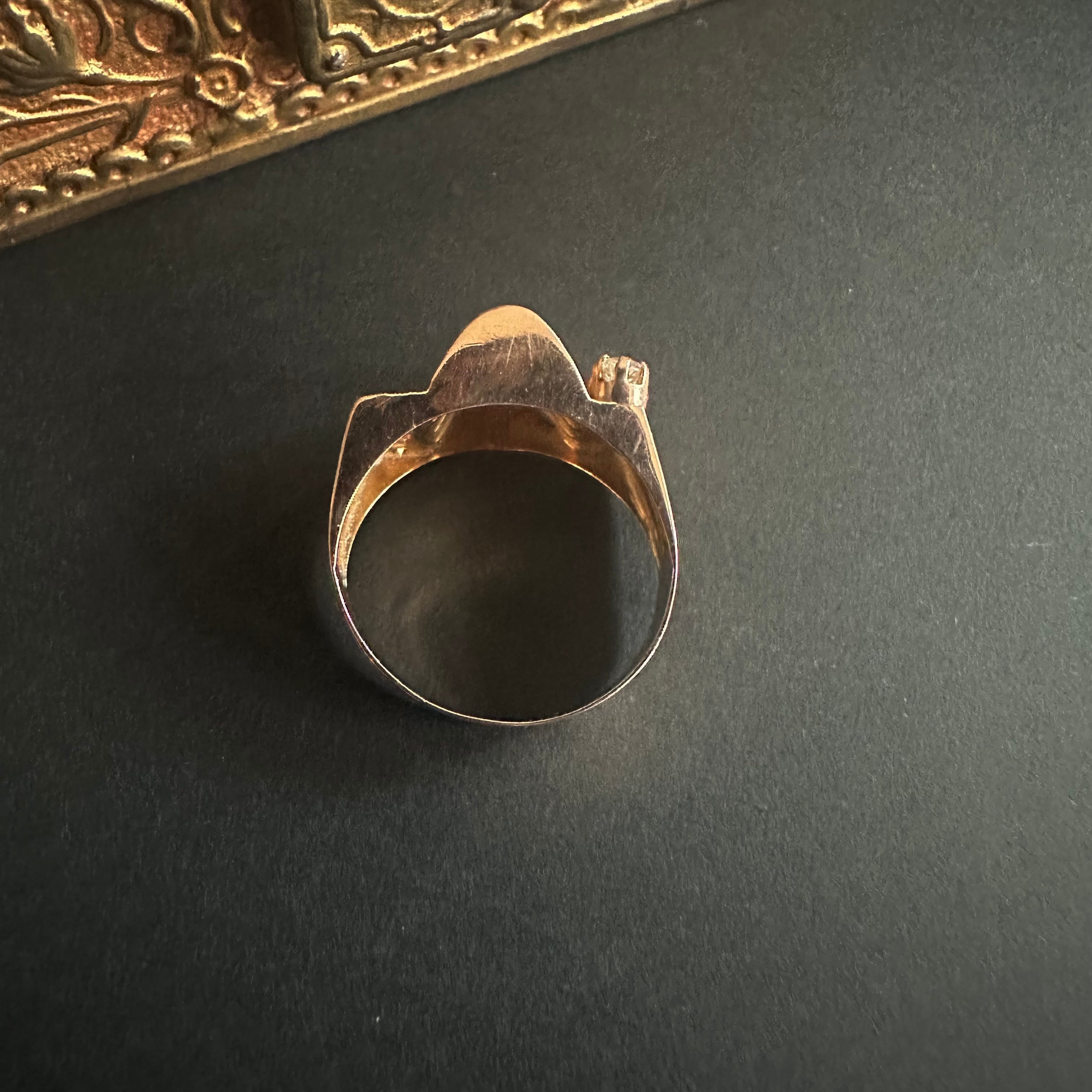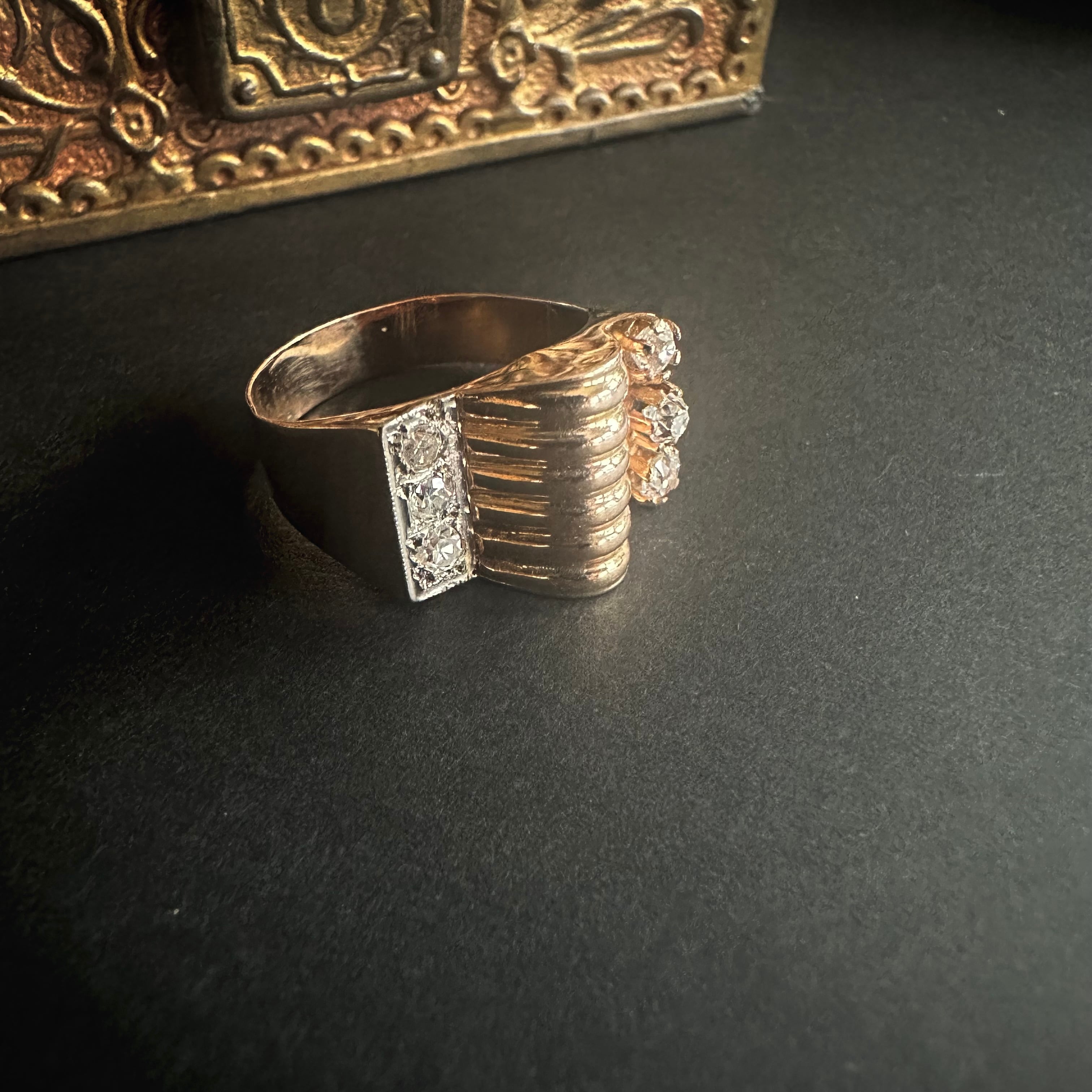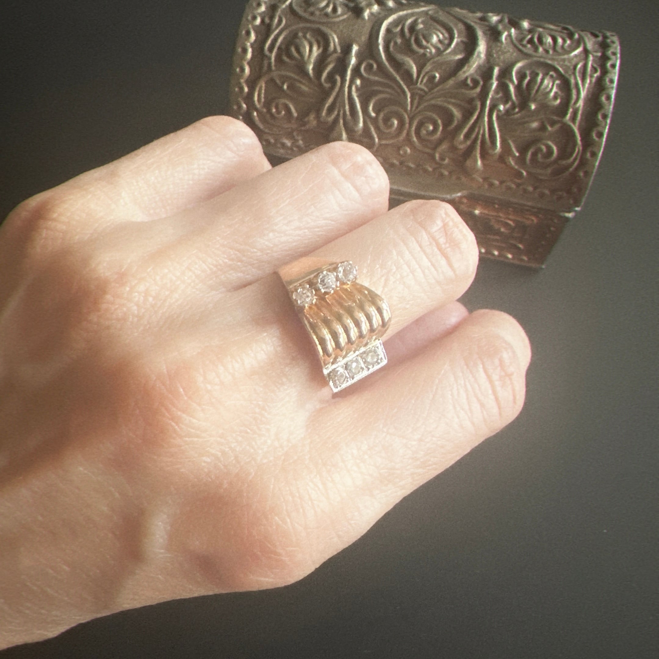 アールデコの幾何学的な要素を残しつつ、時代はより彫刻的で立体的なフォルムを好むようになっていきました。その移行期の息吹を感じさせるのが、このリングの魅力です。