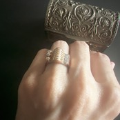 素材は18金。写真で見ると重厚に感じられるかもしれませんが、実際には金を薄く延ばして成形されていて見た目に反して驚くほど軽やかです。指にすっと馴染み、日常の装いにも無理なく溶け込みます。写真ですとかなり大ぶりにみえますが、サイズ感もちょうど良く、立体的な造形が光を受けて豊かに表情を変え、強調しすぎることなく確かな個性を添えてくれるでしょう。