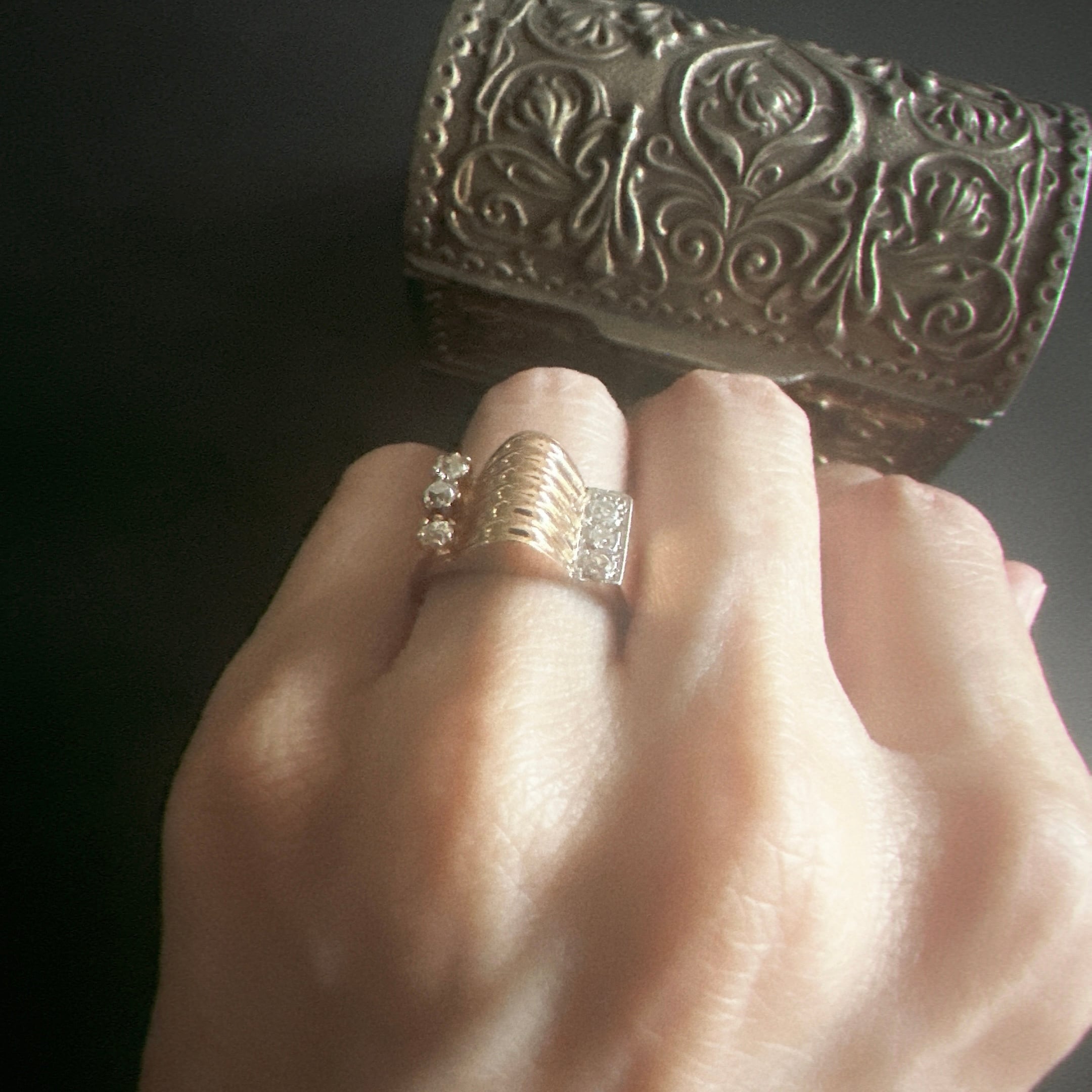 片側にはオールドマインカットダイヤモンドが爪留めされ、異なるカットの石を一つのリングに組み合わせることで、古い時代の煌めきが一層豊かに響き合って控えめながらも奥行きのある輝きを放ちます。