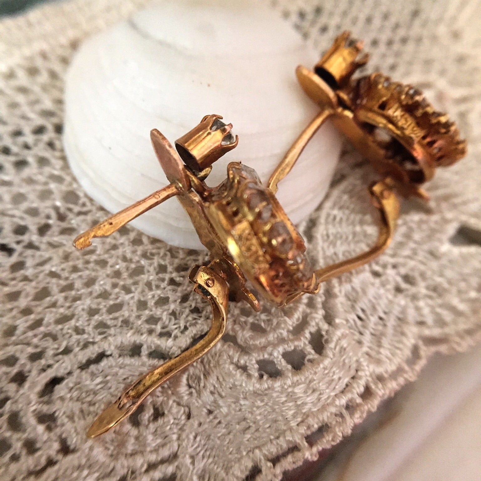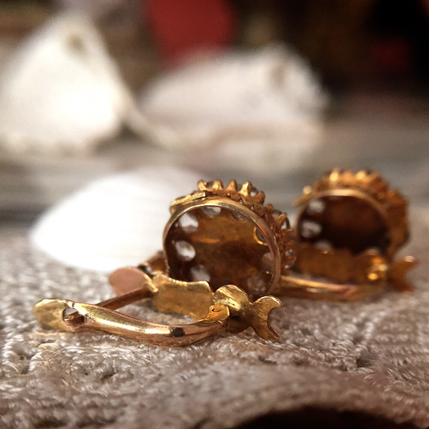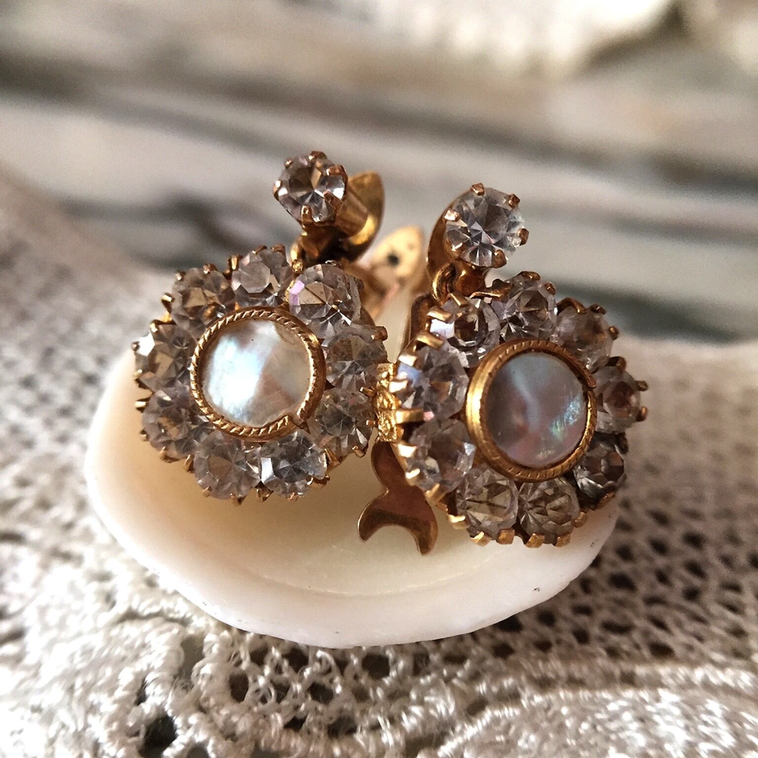 中央の花芯部分は天然マベ真珠がイエローゴールドの枠にセットされ、アンティークならではの色合いと艶はなんとも言えない味わいを醸し出し、クールなイメージのホワイトサファイアに華やぎを添えています。