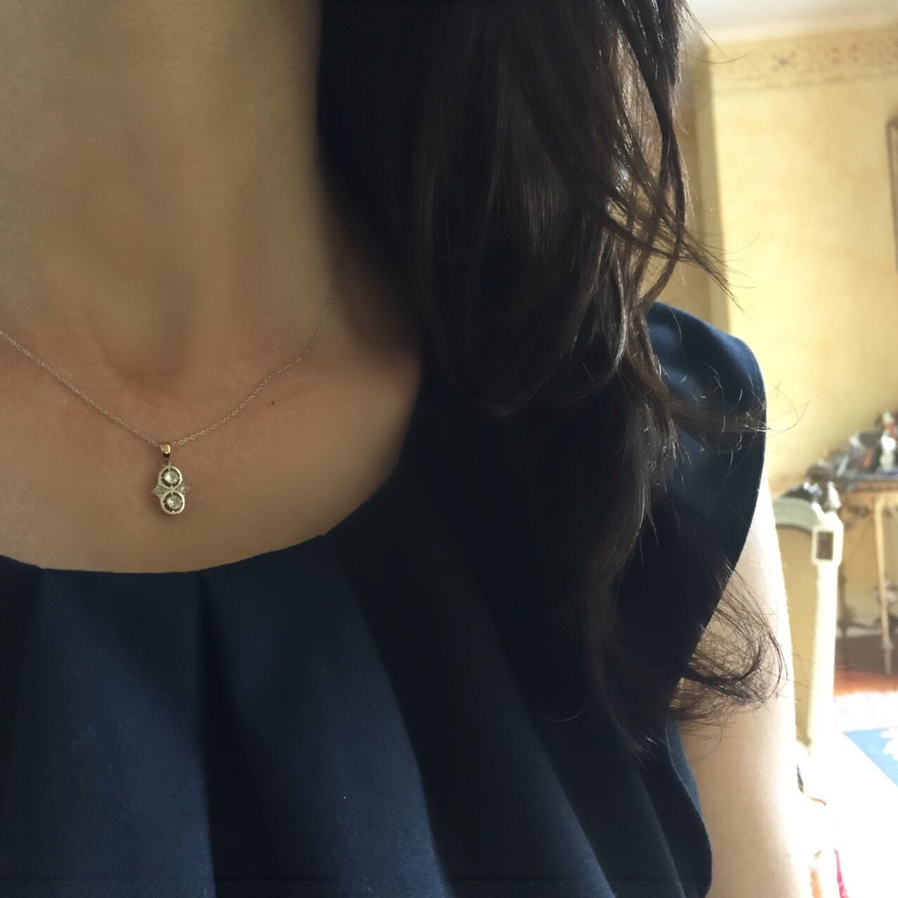 元々ピンブローチだった物をペンダントにおし立てしたペンダントは現代の装いにもすっととけ込むさりげない軽やかなエレガンスと