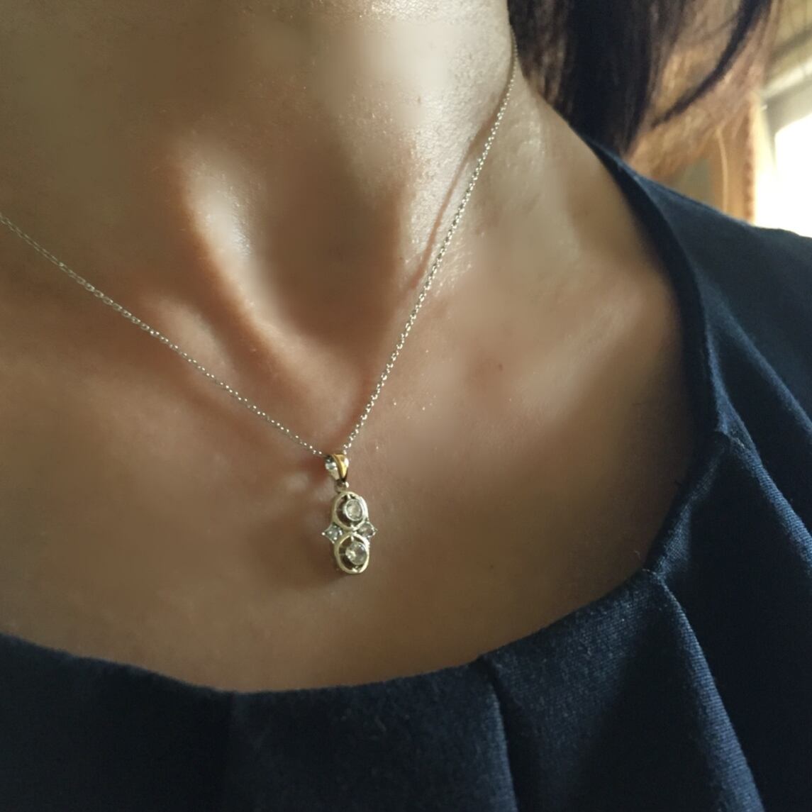 表はプラチナ、裏はゴールドで作られ、コーディーネエトする他のジュエリーの地金がプラチナであってもゴールドであっても相性が良く、全ての願いを叶えてくれるオールドヨーロピアンカットのペンダントと言えます。