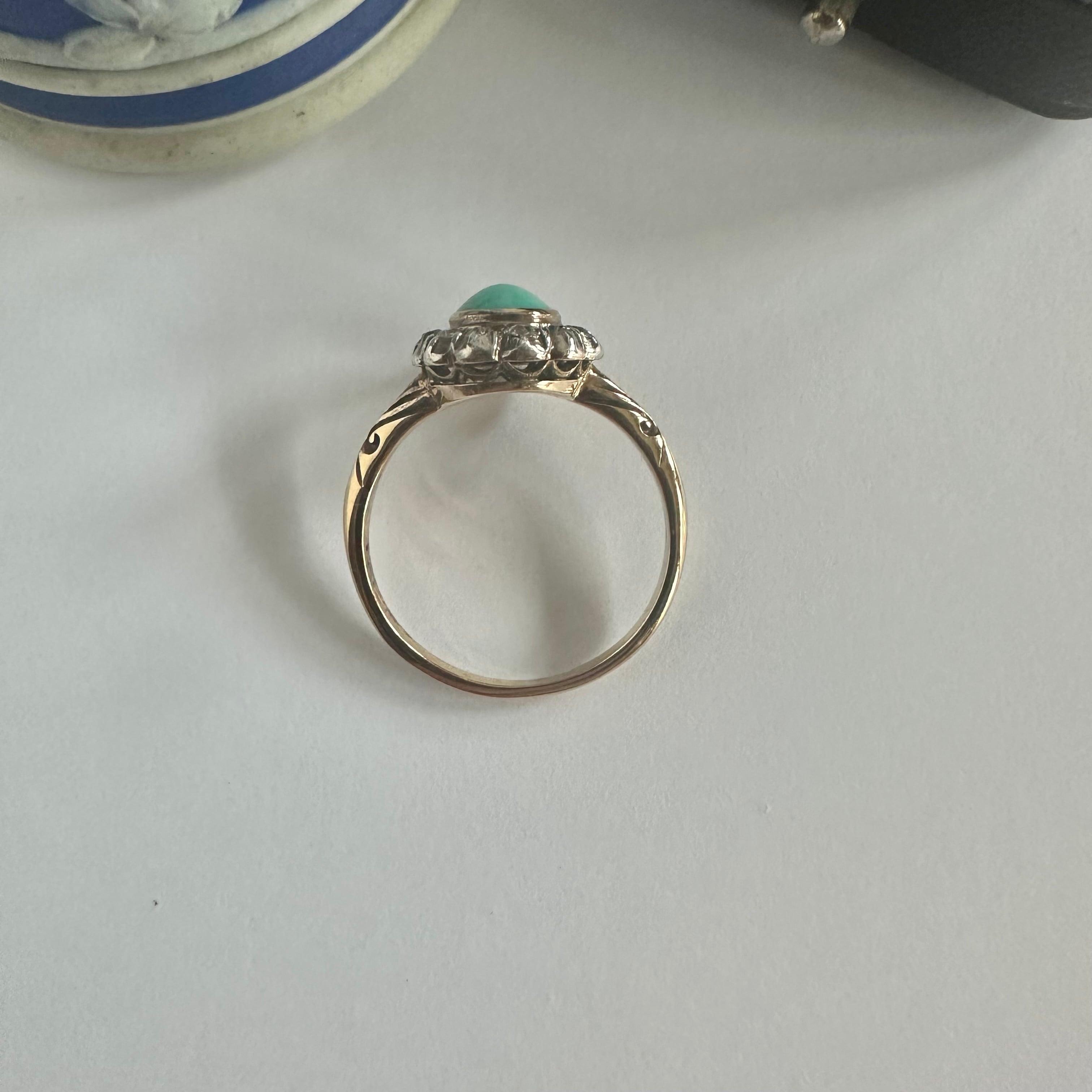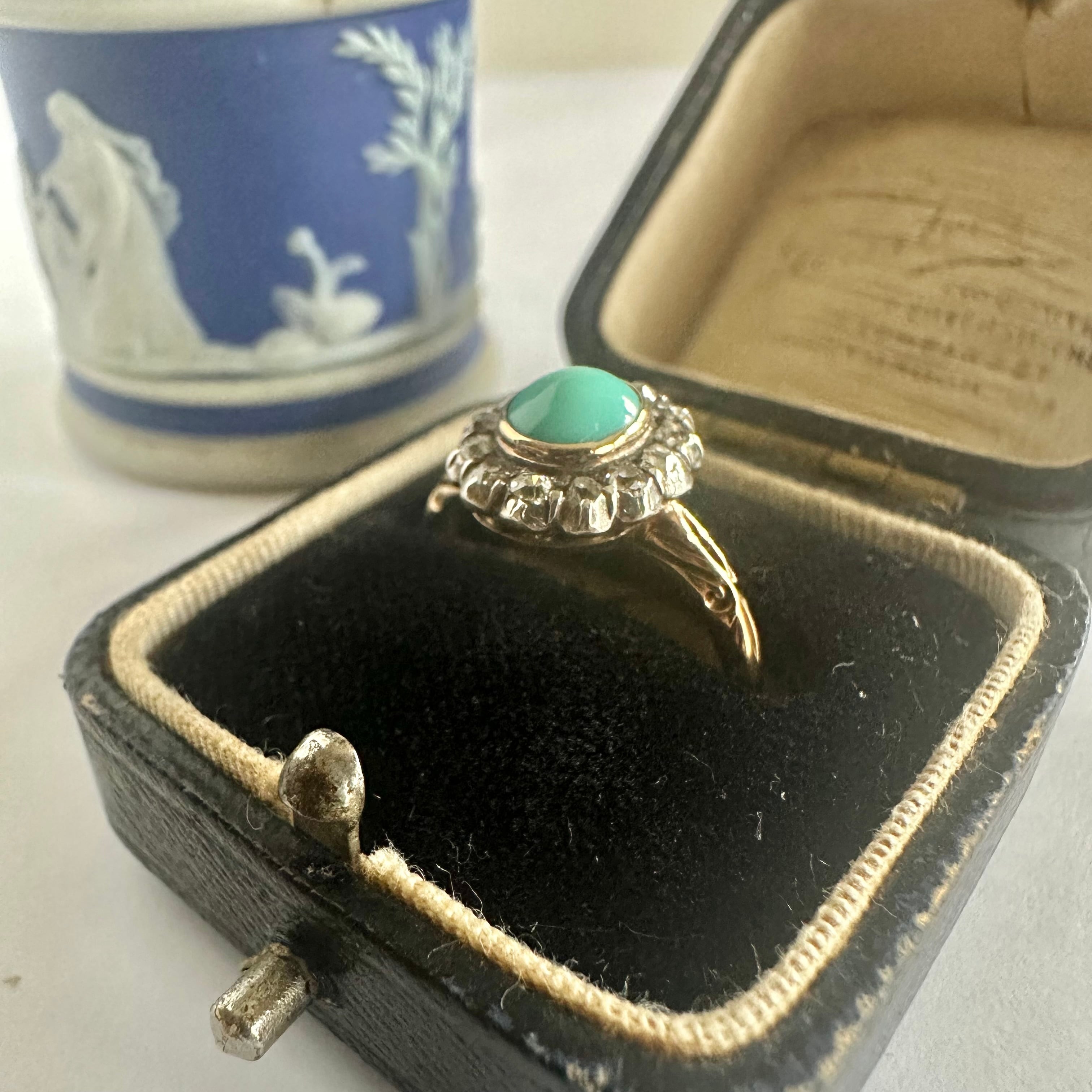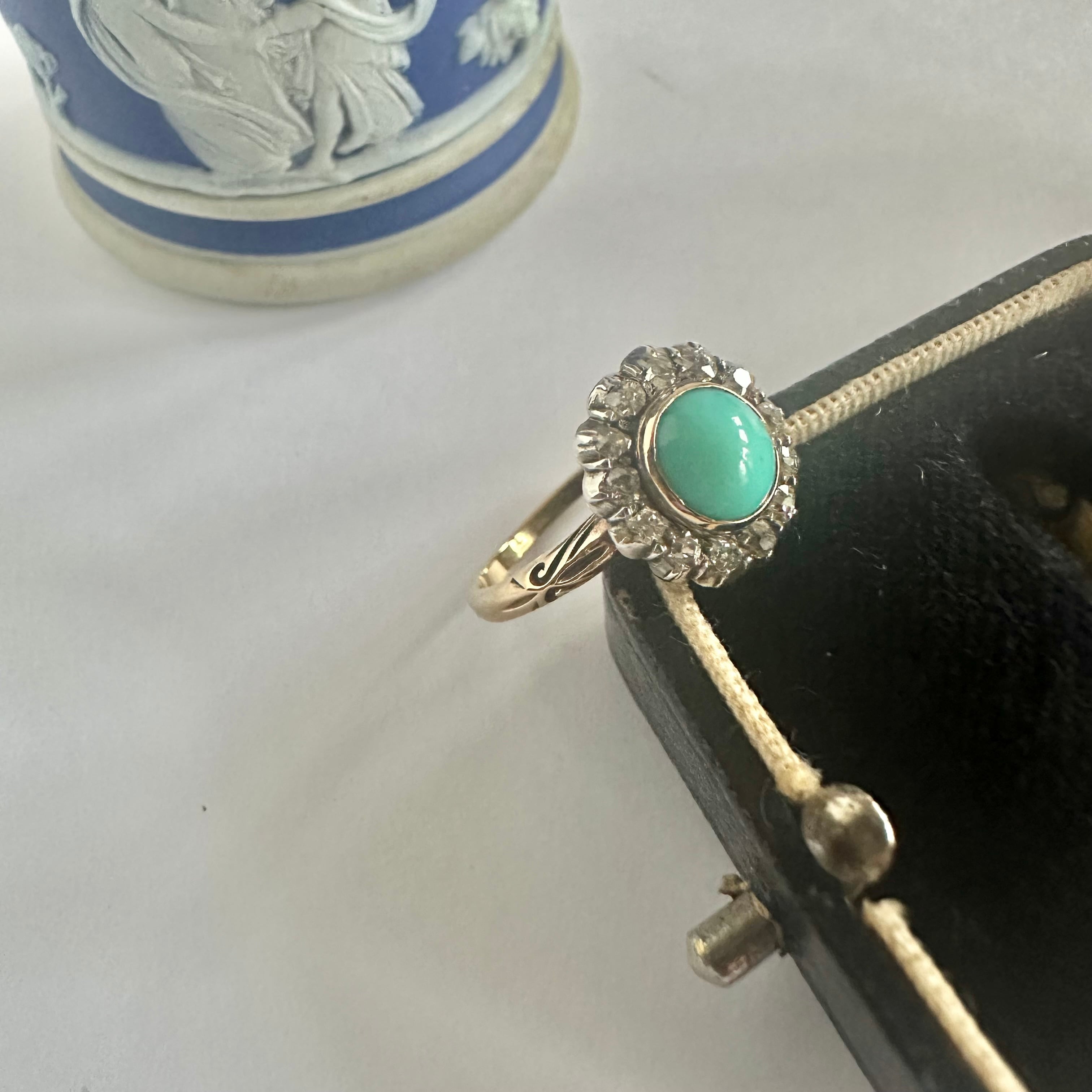ターコイズ&オールドマインカットダイヤモンドクラスターリング