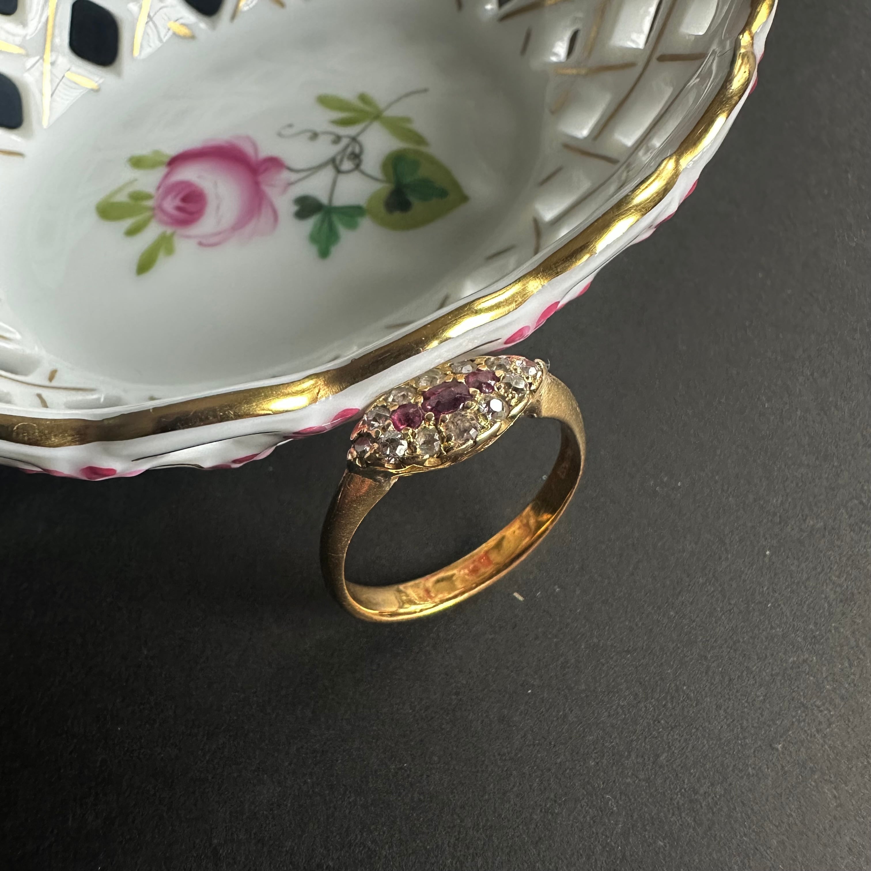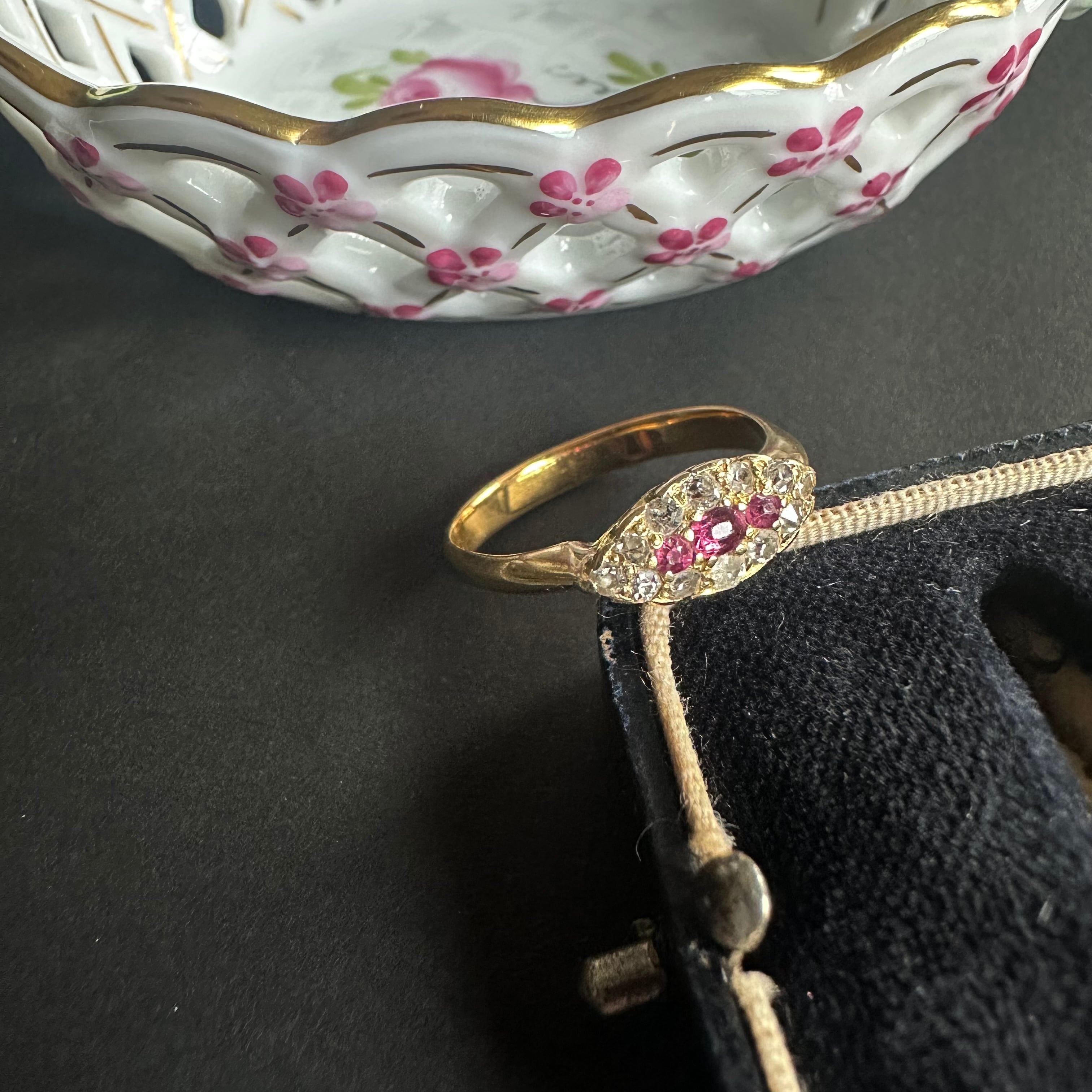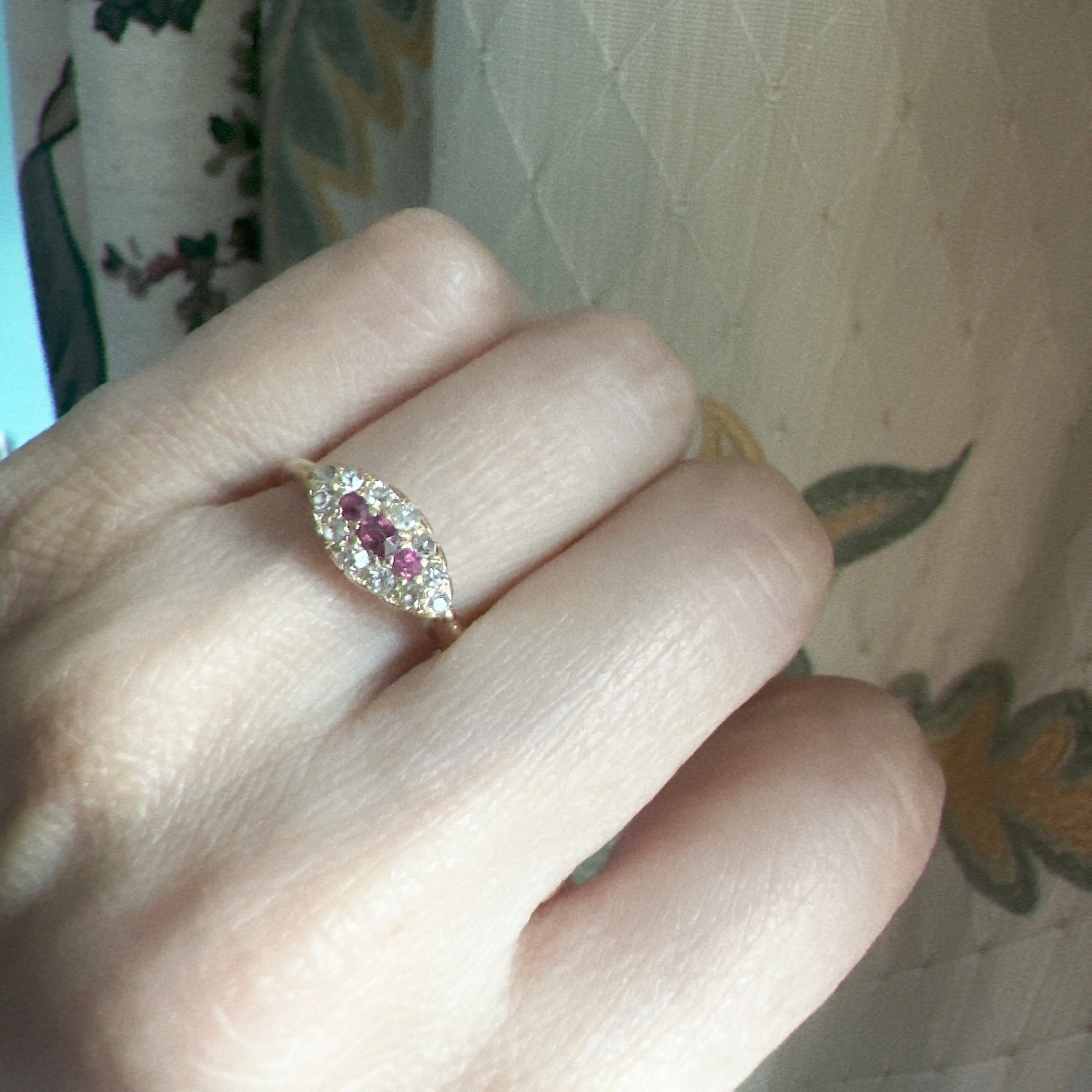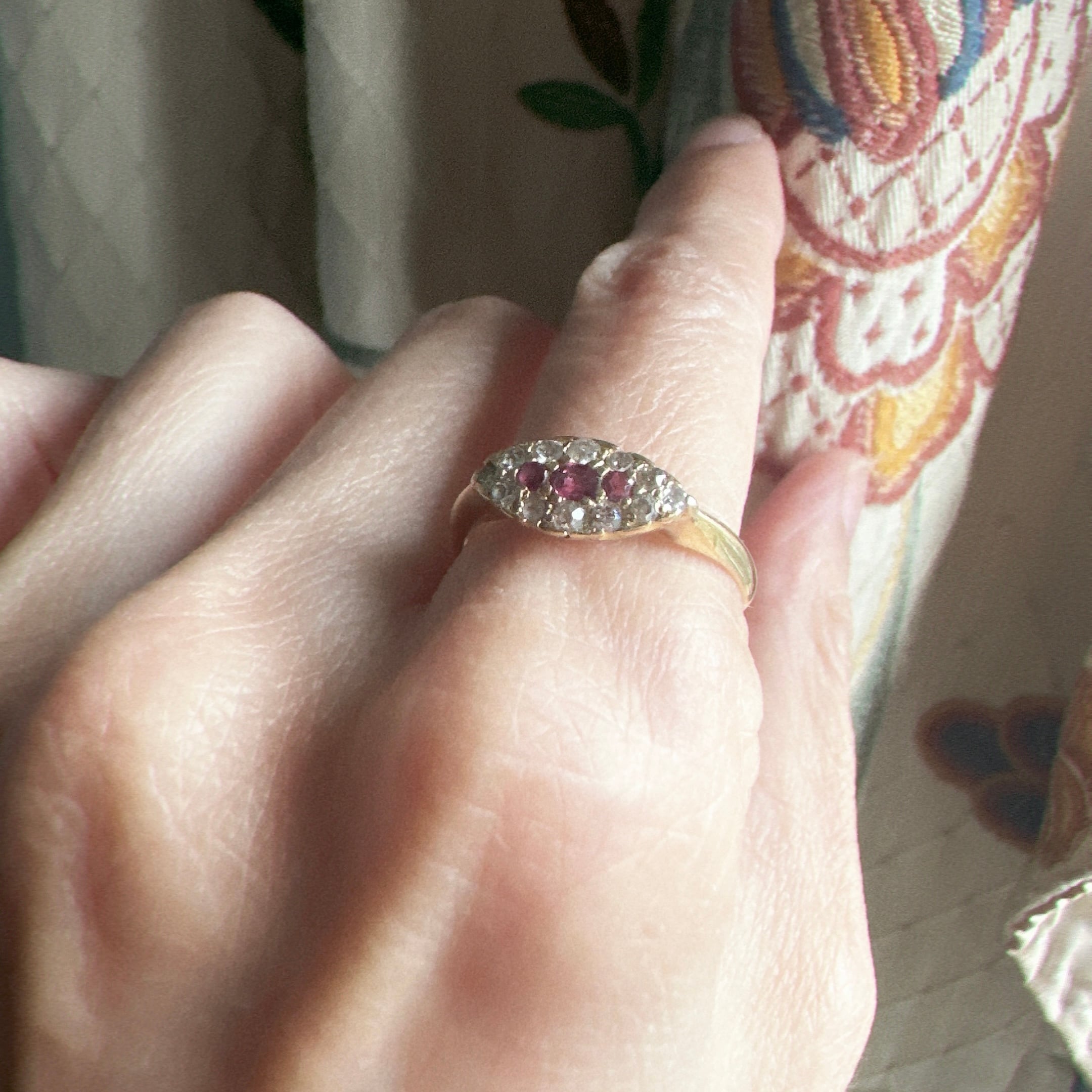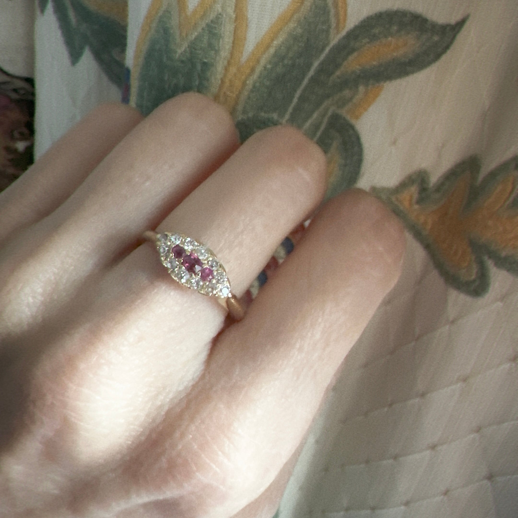 細やかな艶と気品がぎゅっと詰まった、小さなナベット(舟形)のアンティークリング。中央に並ぶ3石のルビーが、まるで小さな灯りのように温かい紅を放ち、その周りを取り巻くダイヤモンドたちが柔らかな光の輪を作っています。